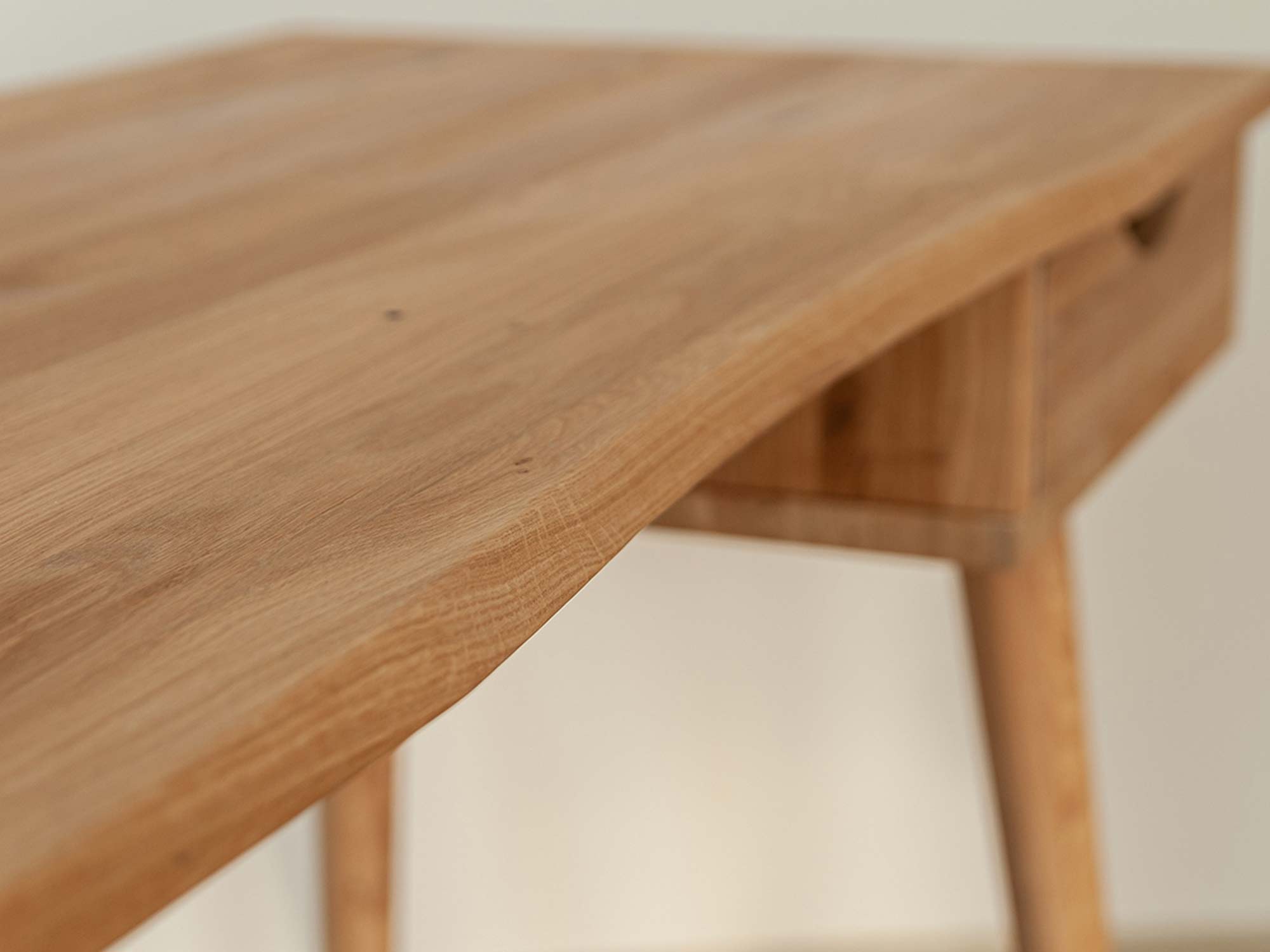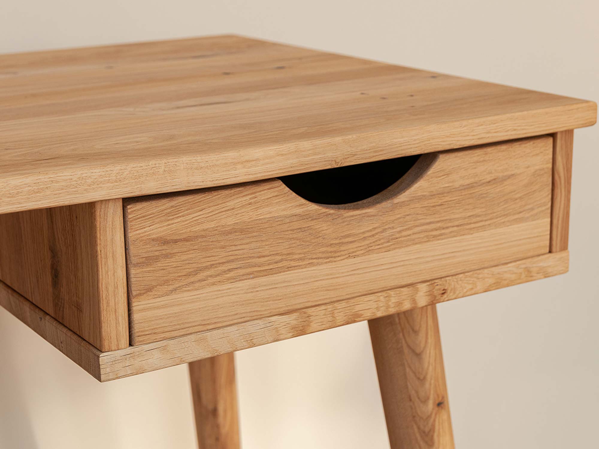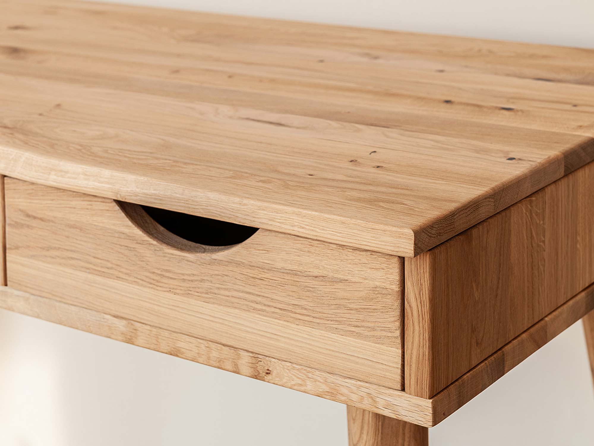 Przede wszystkim prezentowany mebel Lina może pełnić funkcję zarówno toaletki jak i biurka. Ze względu na prostotę w bryle i neutralne wybarwienie, doskonale wpasuje się w każdej sypialni jak i salonie do stworzenia kącika home office. Co więcej na szczególną uwagę zasługuje materiał wykonania, gdyż jest to lite drewno dzikiego dębu. Charakteryzuje się gęsto zlokalizowanymi ciemnymi sękami, które naturalnie występują w strukturze drewna. Bez wątpienia dodaje to charakteru i uroku meblu. Ponadto jest to gwarancja solidności wykonania i długoletniej trwałości. Dodatkowo szuflada wygodnie otwierana pozwala na schowanie drobnych akcesoriów czy dokumentów mając je zawsze pod ręką. Co więcej, biurko toaletka osadzona jest na zaokrąglonych nóżkach, co zdecydowanie dodaje mu lekkości, dzięki czemu nie zaburza estetyki przestrzeni.