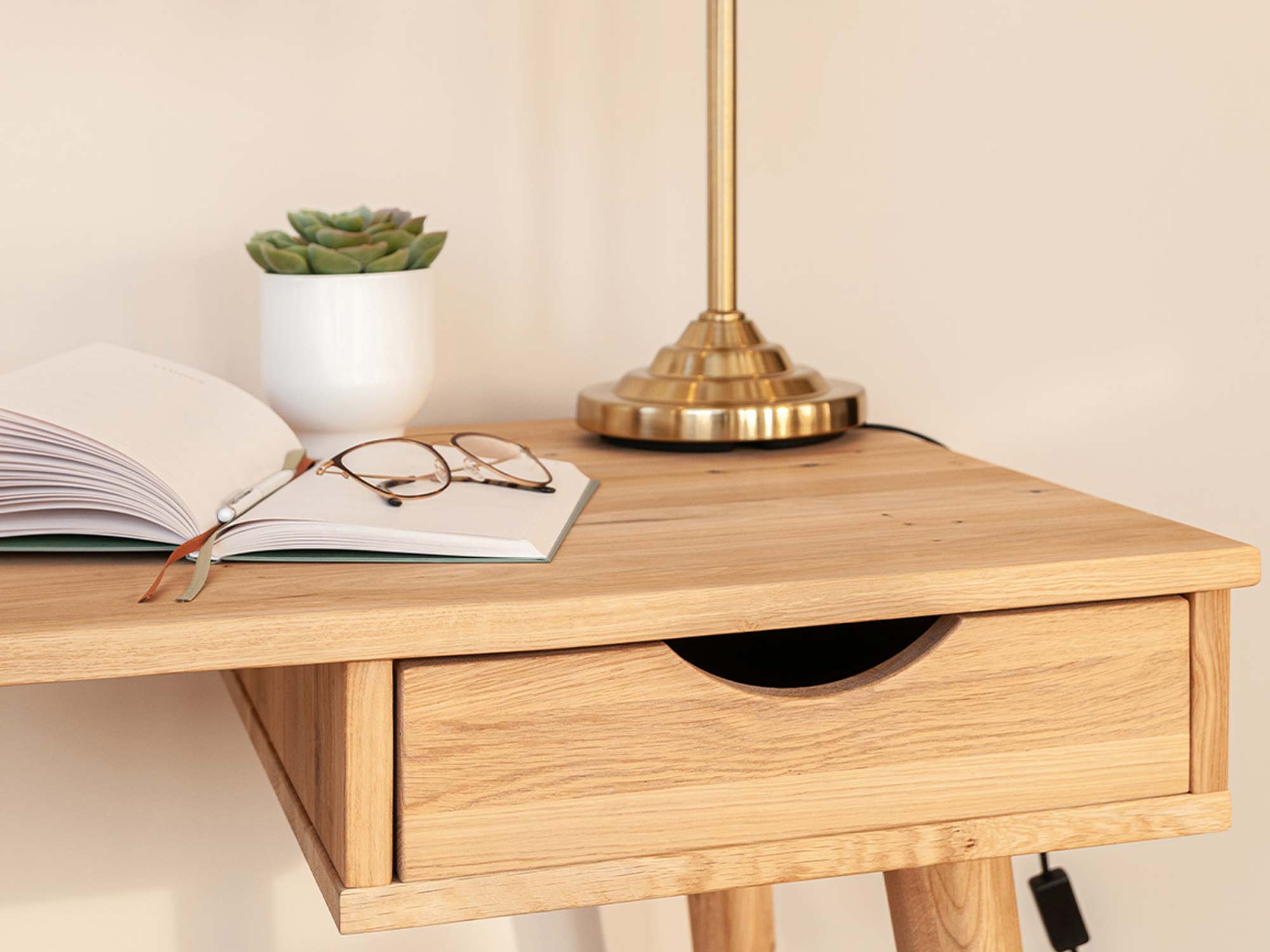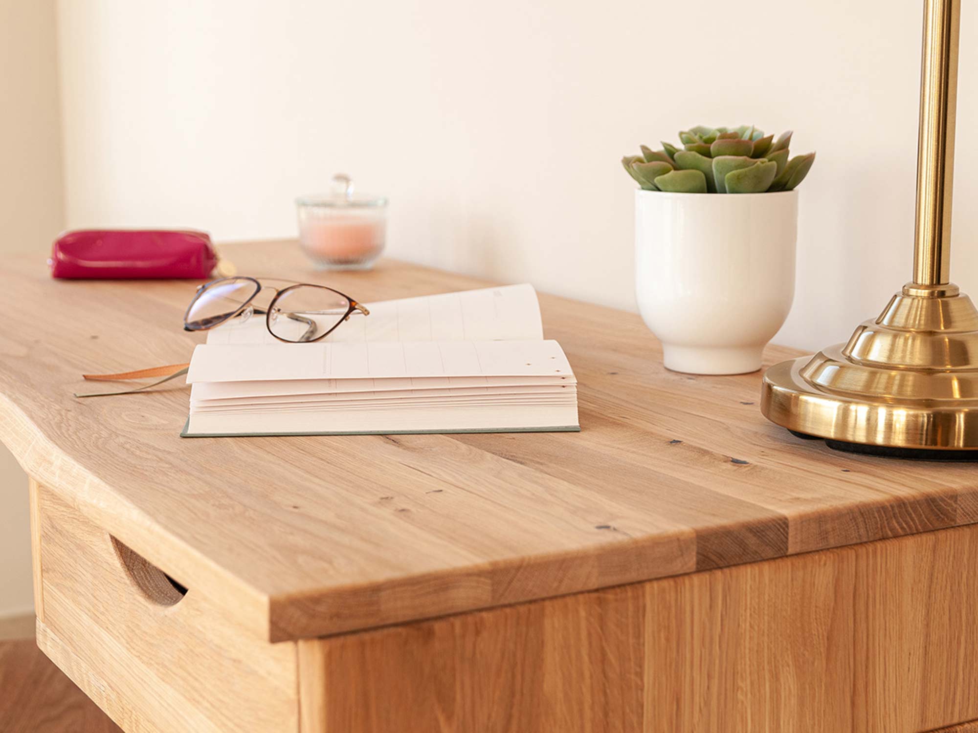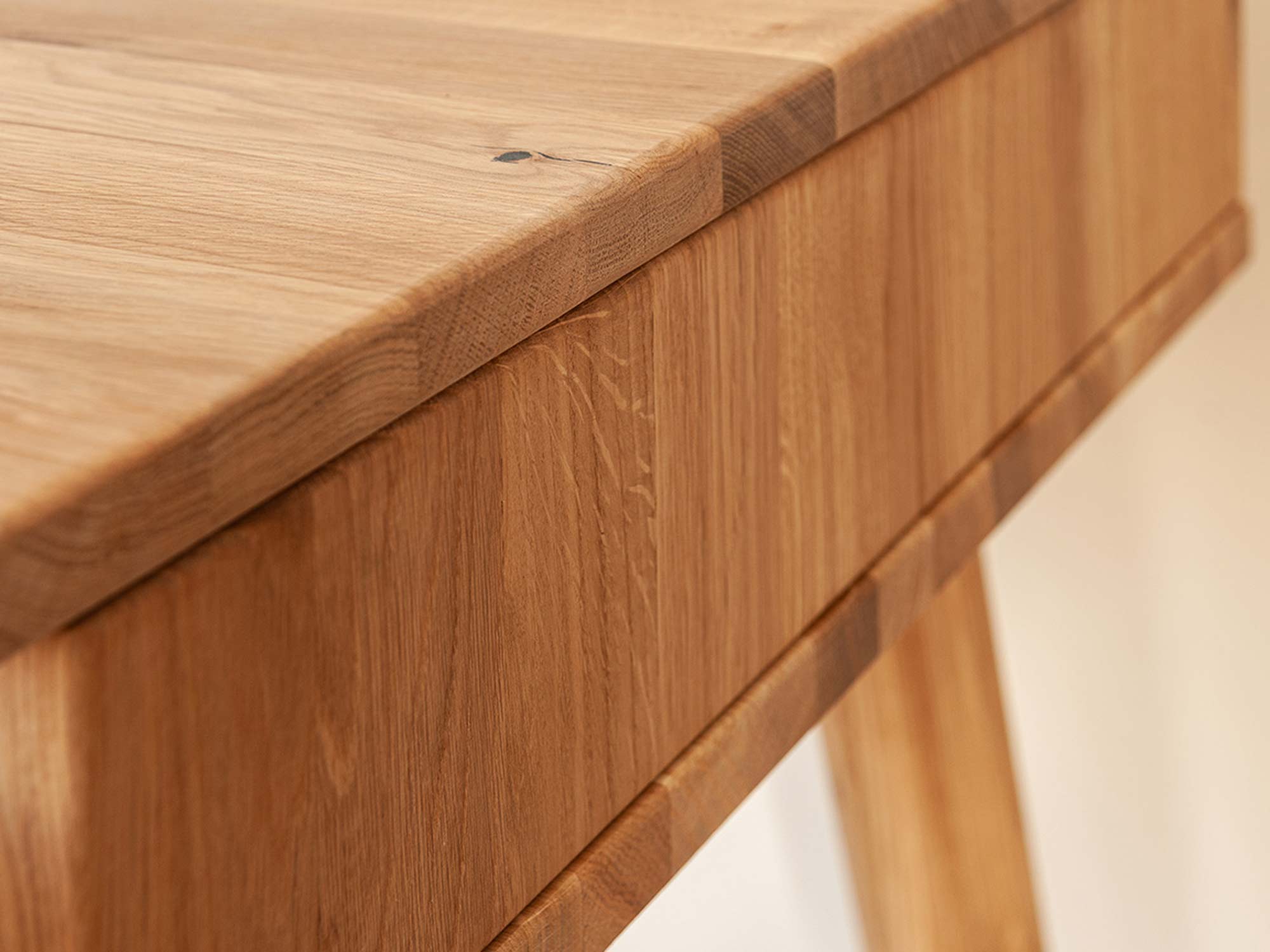 Przede wszystkim prezentowany mebel Lina może pełnić funkcję zarówno toaletki jak i biurka. Ze względu na prostotę w bryle i neutralne wybarwienie, doskonale wpasuje się w każdej sypialni jak i salonie do stworzenia kącika home office. Co więcej na szczególną uwagę zasługuje materiał wykonania, gdyż jest to lite drewno dzikiego dębu. Charakteryzuje się gęsto zlokalizowanymi ciemnymi sękami, które naturalnie występują w strukturze drewna. Bez wątpienia dodaje to charakteru i uroku meblu. Ponadto jest to gwarancja solidności wykonania i długoletniej trwałości. Dodatkowo szuflada wygodnie otwierana pozwala na schowanie drobnych akcesoriów czy dokumentów mając je zawsze pod ręką. Co więcej, biurko toaletka osadzona jest na zaokrąglonych nóżkach, co zdecydowanie dodaje mu lekkości, dzięki czemu nie zaburza estetyki przestrzeni.