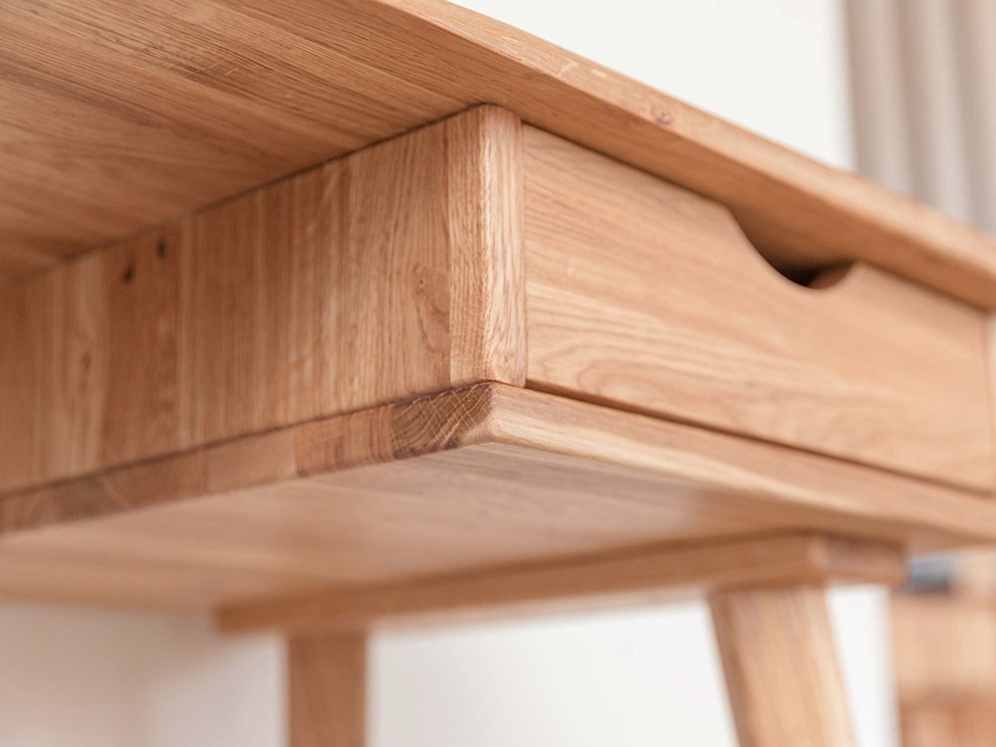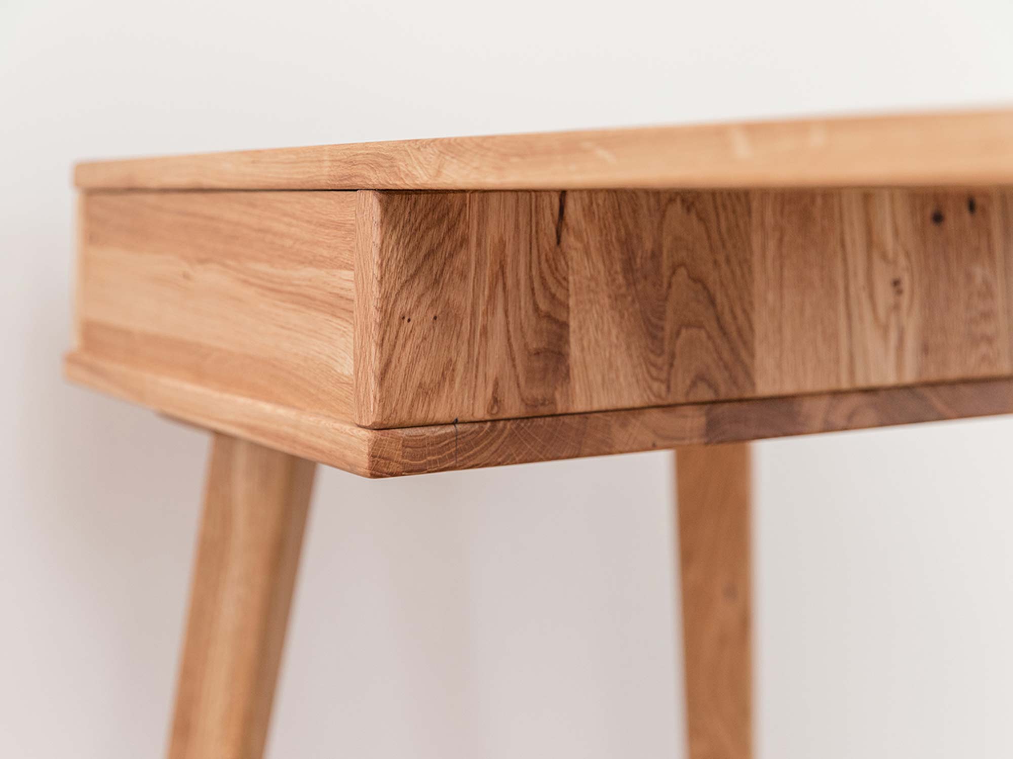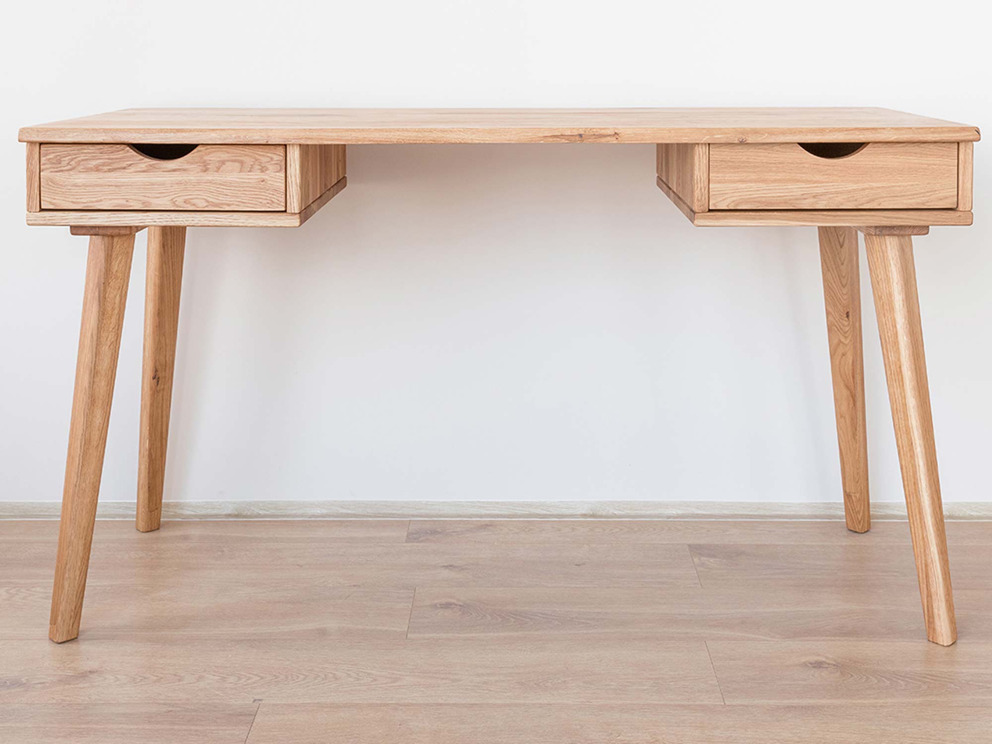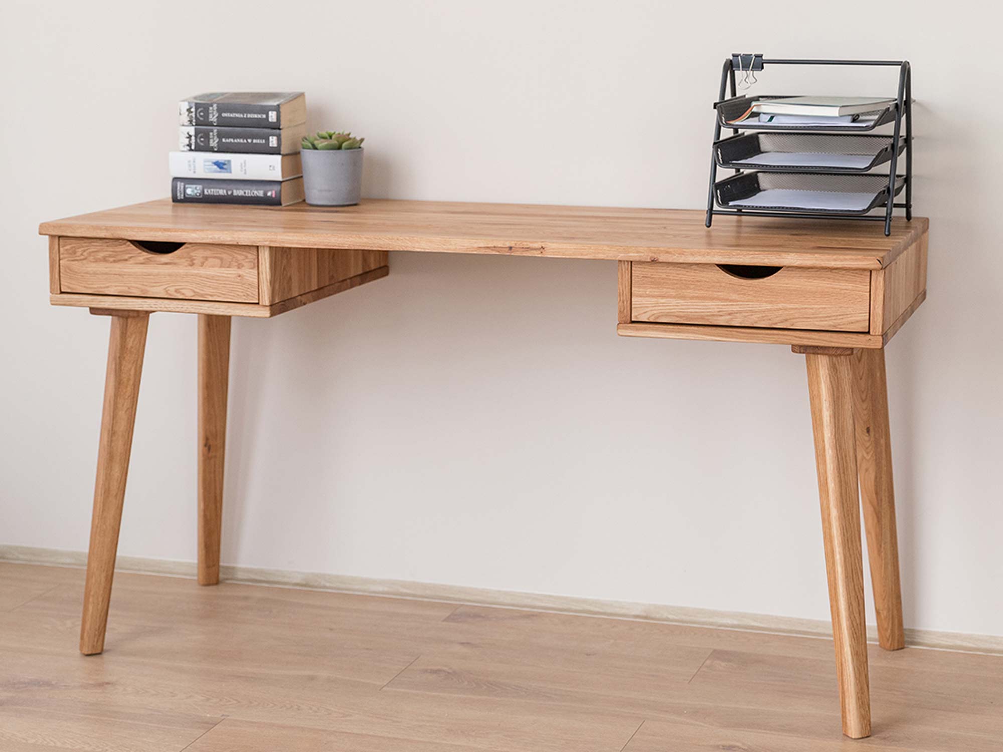 Dębowa toaletka biurko Lina 2 charakteryzuje się uniwersalnością, gdyż zdecydowanie wpasuje się w każdą aranżację i jego przeznaczenie może być w dowolnej chwili zmienionej. Niewątpliwie doskonale sprawdzi się jako toaletka w sypialni jak i w salonie czy gabinecie jako kącik home office czy przedpokoju jako sekretarzyk. Dodatkowo dzięki prostej bryle, eleganckim wykończeniu i solidności wykonania z pewnością zaprezentuje się znakomicie w każdej przestrzeni o wszelakich stylach. Co więcej dwie szuflady pozwalają na przechowywanie dokumentów, artykułów piśmienniczych czy innych akcesoriów dzięki czemu zawsze będą pod ręką, a jednocześnie nie będą zaburzać estetyki wnętrza. Ponadto naturalne wybarwienie mebla czyni go uniwersalnym i ponadczasowym, z tego względu nawet z upływem lat i zmianie w trendach, bez wątpienia nie utraci na aktualności.