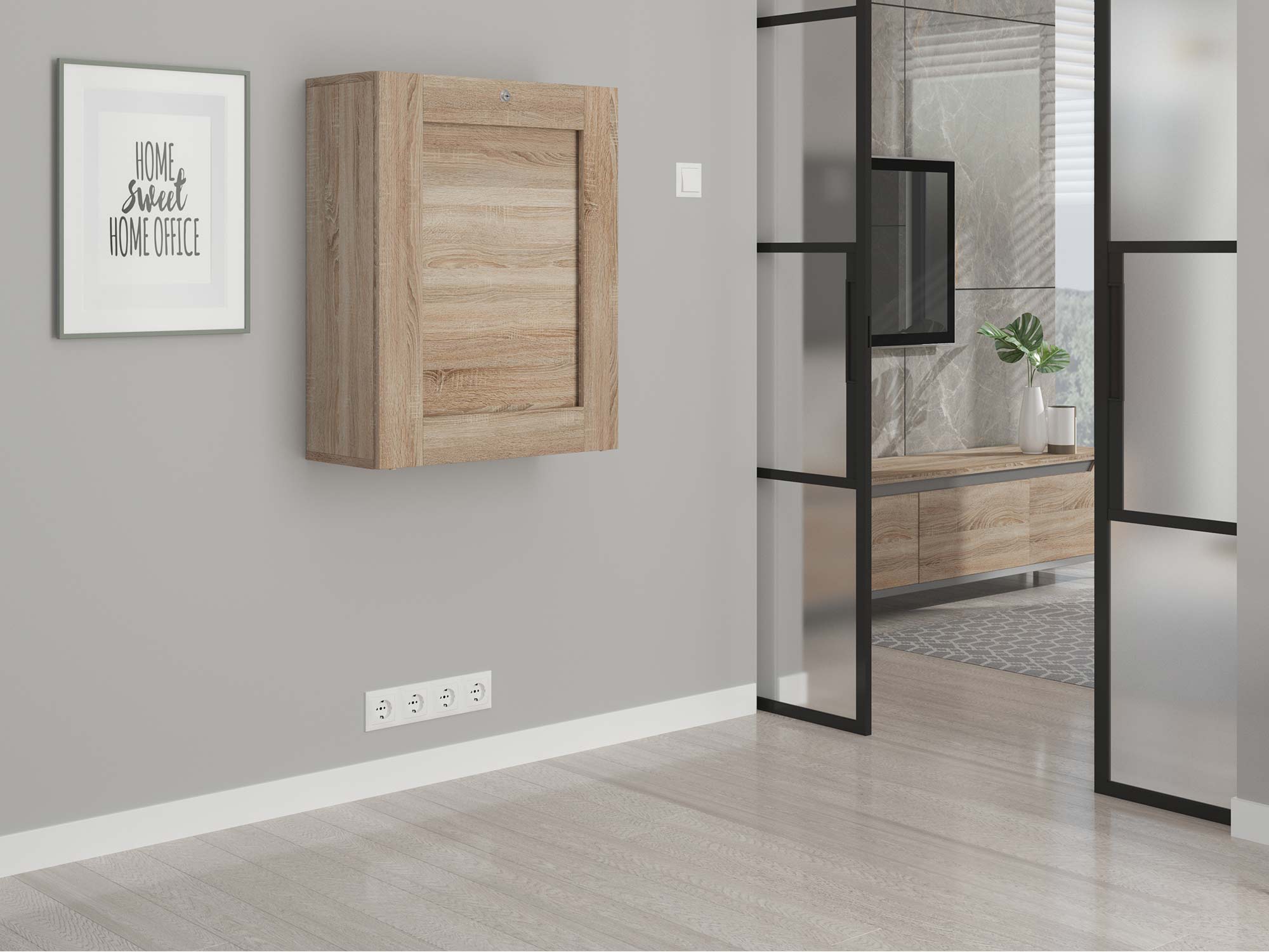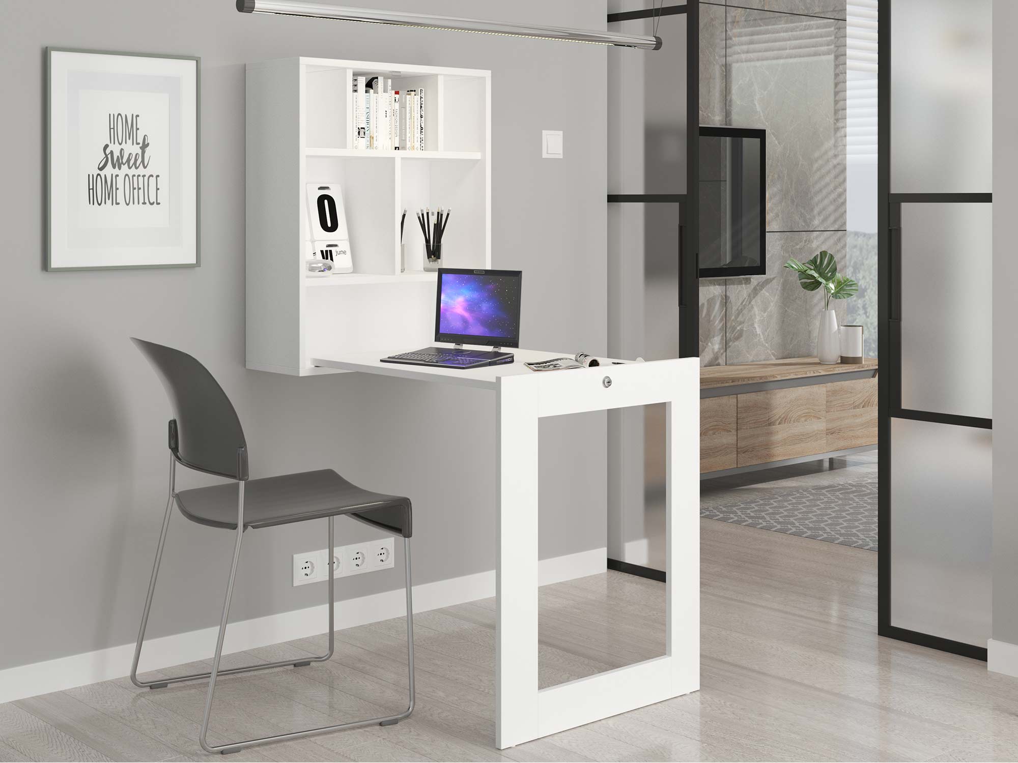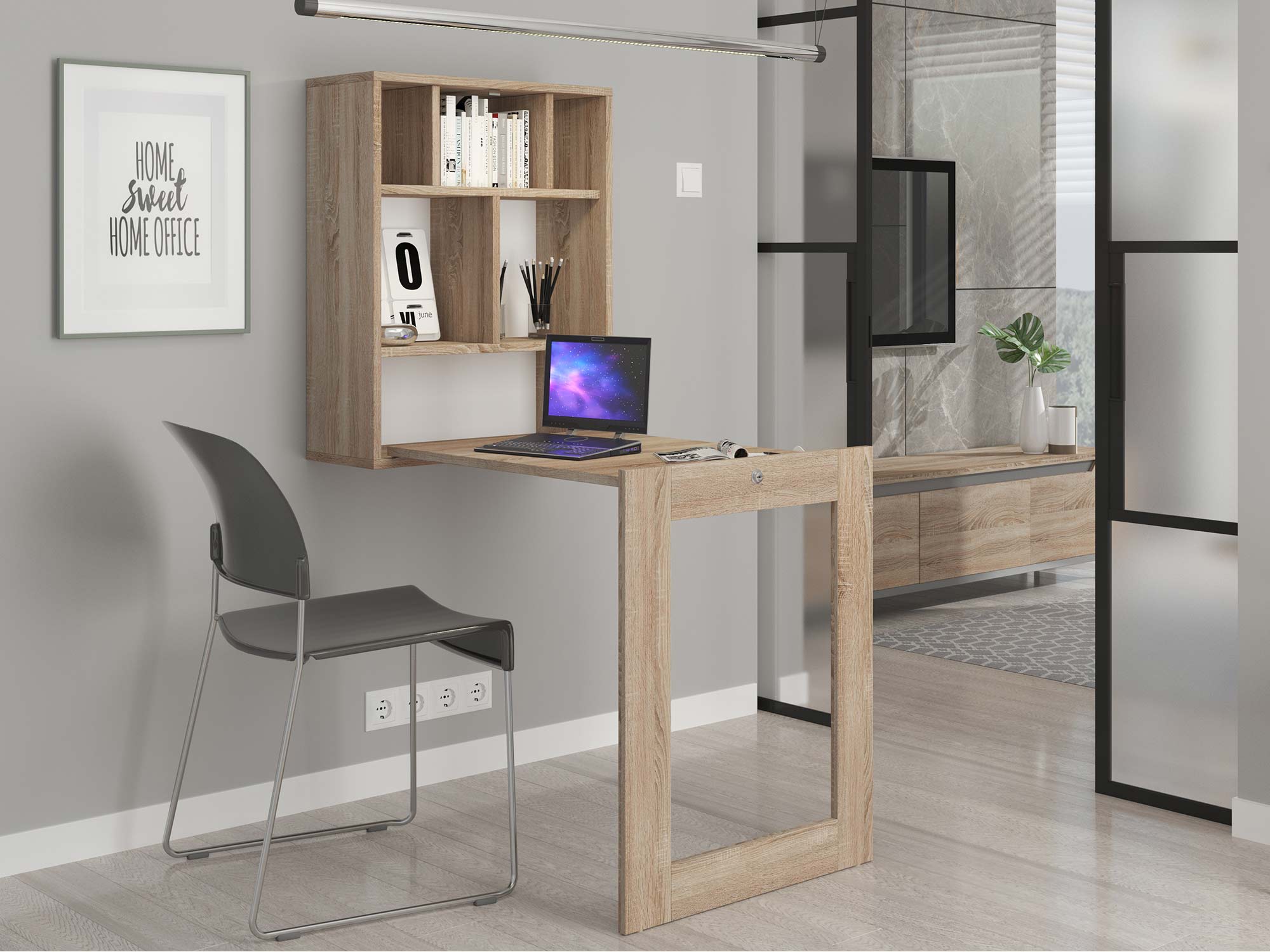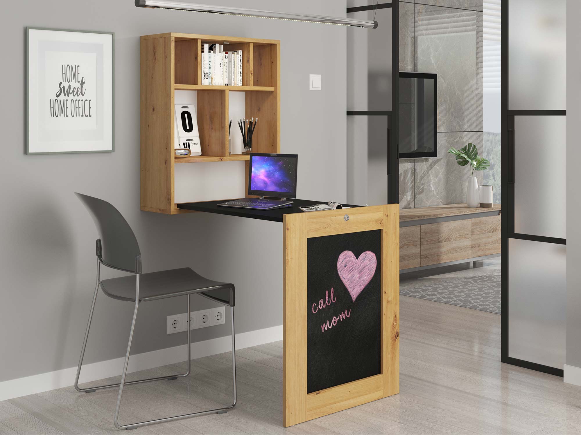 Co najważniejsze przedstawione kompaktowe biurko rozkładane SARI doskonale sprawdzi się w niemalże każdym pokoju, wystarczy jednie trochę miejsca na ścianie oraz kawałek przestrzeni na rozłożenie mebla. Z tego względu jest to doskonałe rozwiązanie w przypadku braku osobnego pokoju na stworzenie home office. W tym wypadku mebel można zamontować zarówno w sypialni jak i salonie, jednocześnie nie zakłócając całej estetyki aranżacji. Co więcej oprócz blatu, mebel zawiera wiele półek, co znakomicie pomaga zorganizować domowe biuro. Dodatkowo tablica dostępna w wariancie dąb artisan to nowoczesny dodatek, który docenią szczególnie rodzice zapisując zadania swoich pociechom, ale również osoby dorosłe ceniące dobrą organizację.