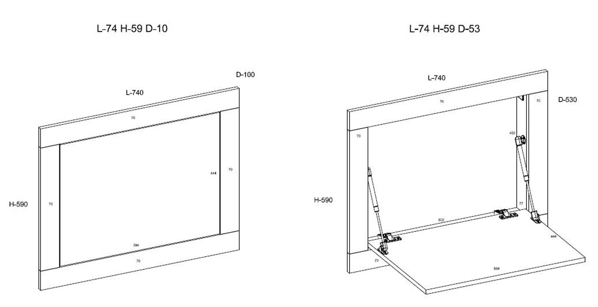 - Materiały wykonania: 16 mm płyta laminowana, płyta MDF, siłowniki gazowe teleskopowe ułatwiające otwieranie i zamykanie.