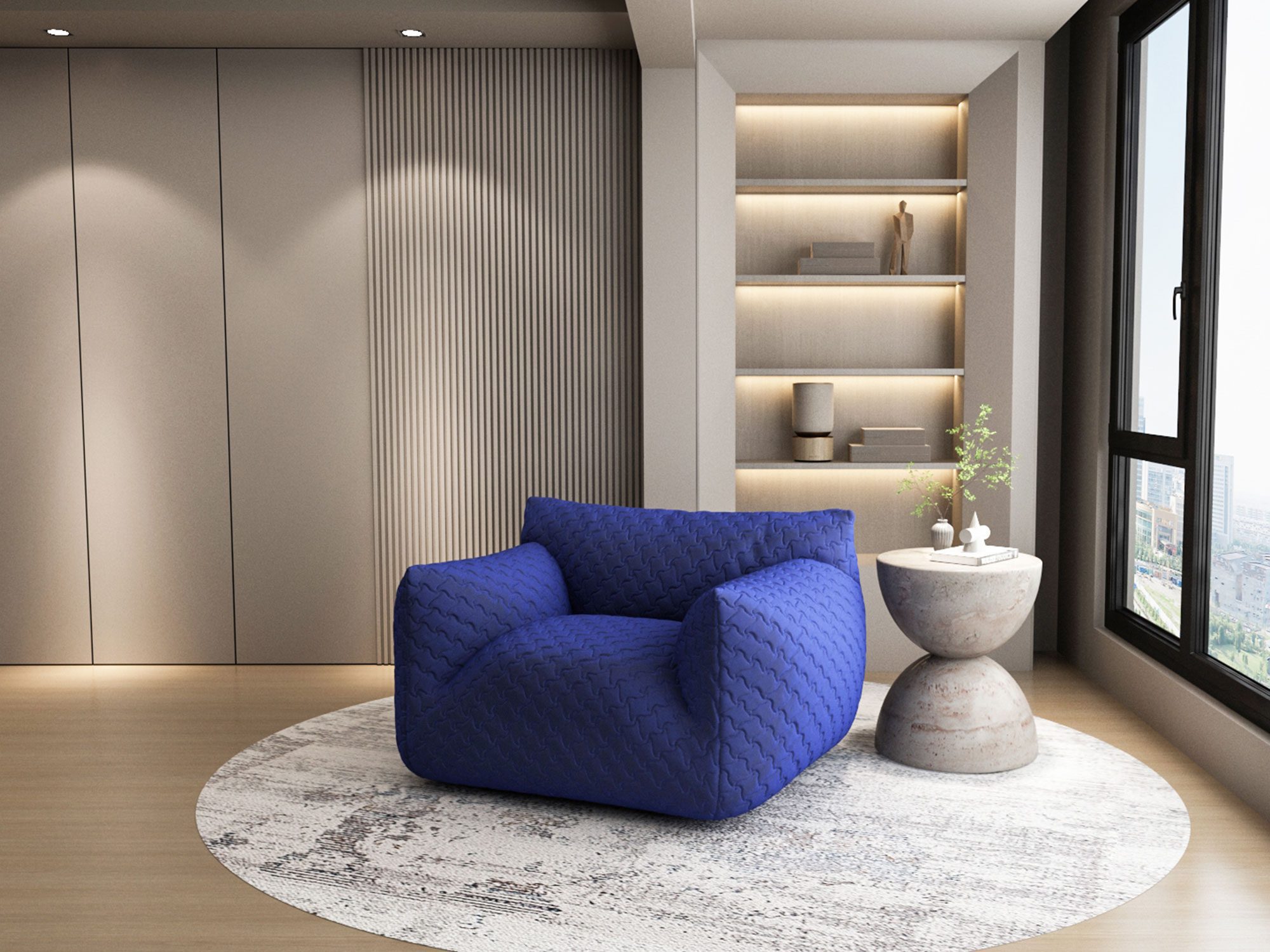 Przedstawiamy nowoczesny, duży fotel Zenith o obłym kształcie, który wprowadza do wnętrza powiew świeżości i elegancji. Wykonany z elastycznej tkaniny w wyrazistym chabrowym odcieniu, posiada subtelne pikowania na wzór czteroramiennych gwiazd, nadające mu oryginalny charakter. Ten wyjątkowy mebel harmonijnie łączy nowoczesny design z komfortem użytkowania, będąc idealnym wyborem dla każdego, kto ceni estetykę i funkcjonalność.