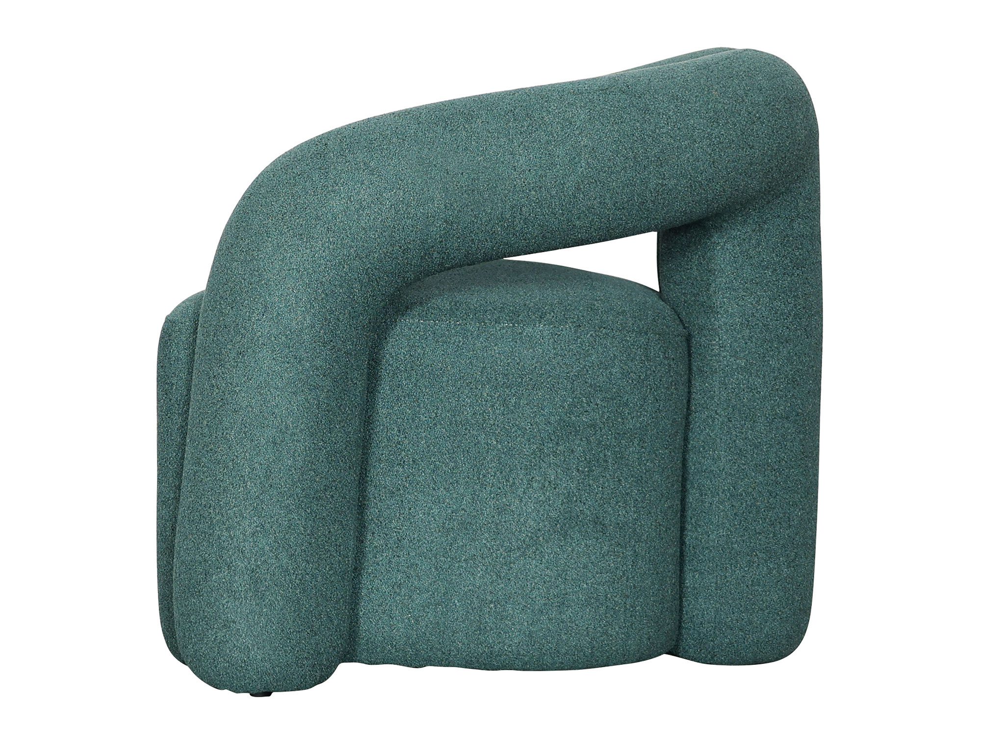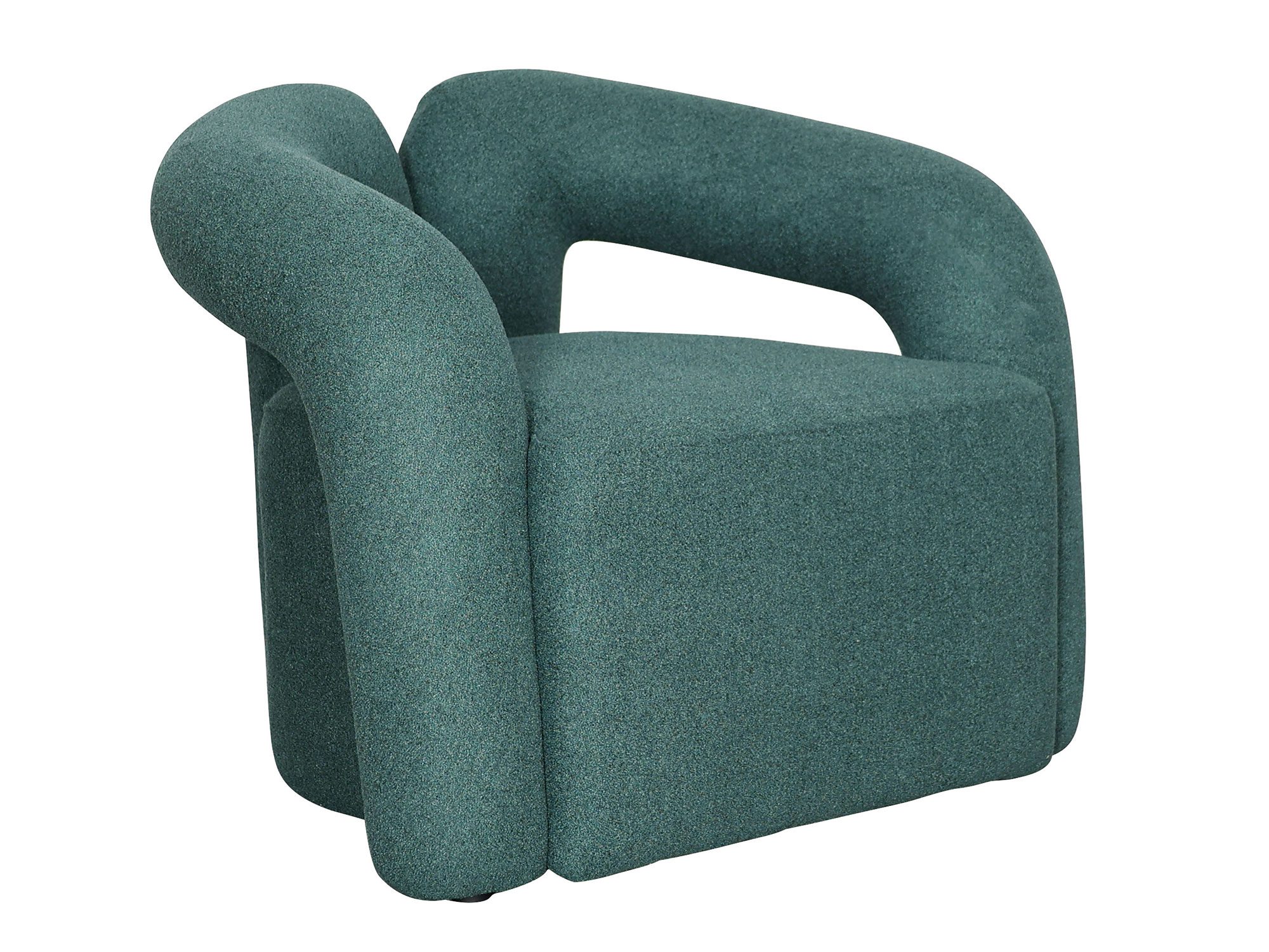 Nowoczesny fotel w kolorze szmaragdowym pokryty tkaniną boucle ze srebrnym połyskiem nici. Niebanalny kształt w połączeniu z miękką tkaniną sprawi, że każde wnętrze nabierze oryginalności.