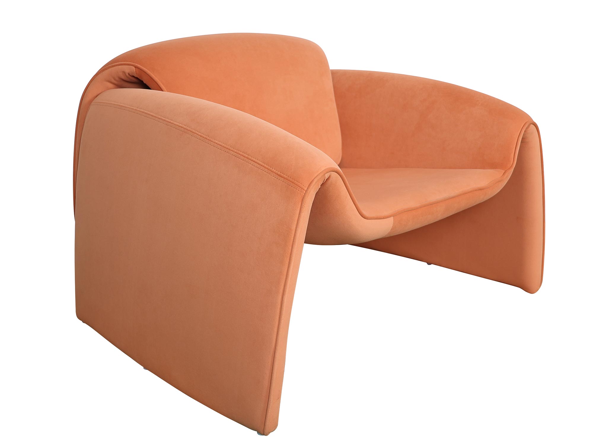 Nowoczesny fotel tapicerowany w kolorze pomarańczowym z welurową tkaniną. Minimalistyczna, geometryczna forma i staranne wykończenie pozwalają na dopasowanie produktu do każdego wnętrza.