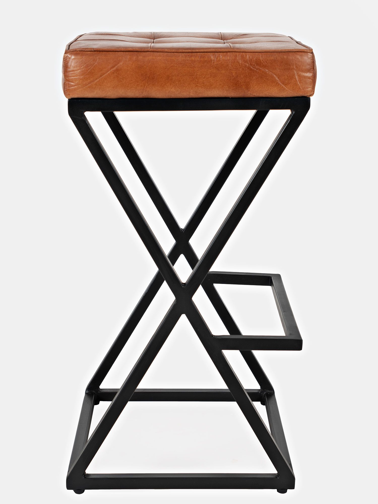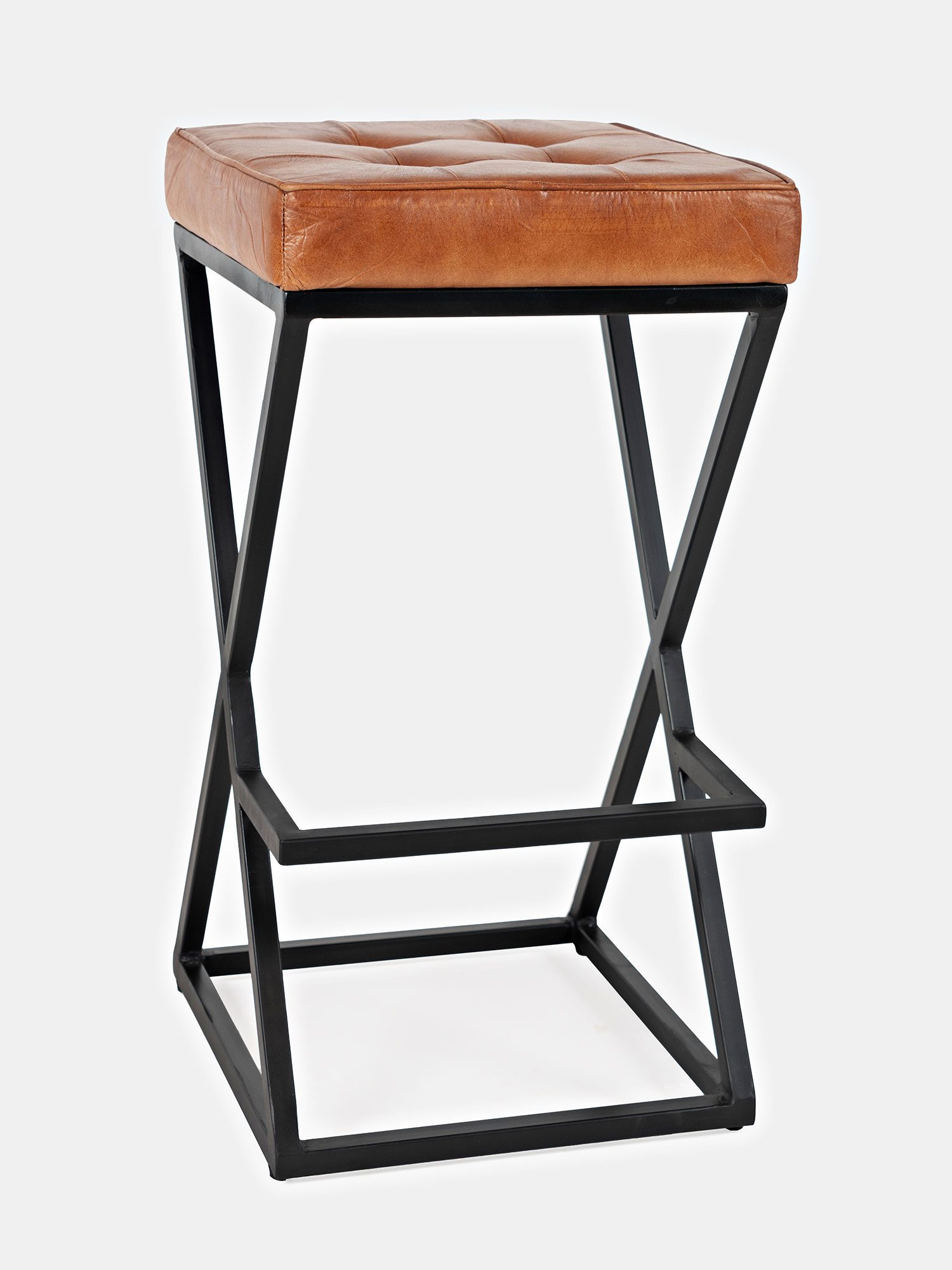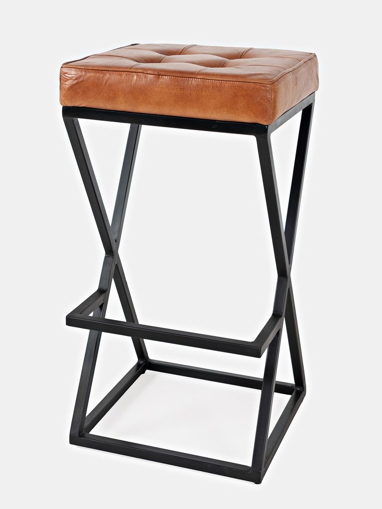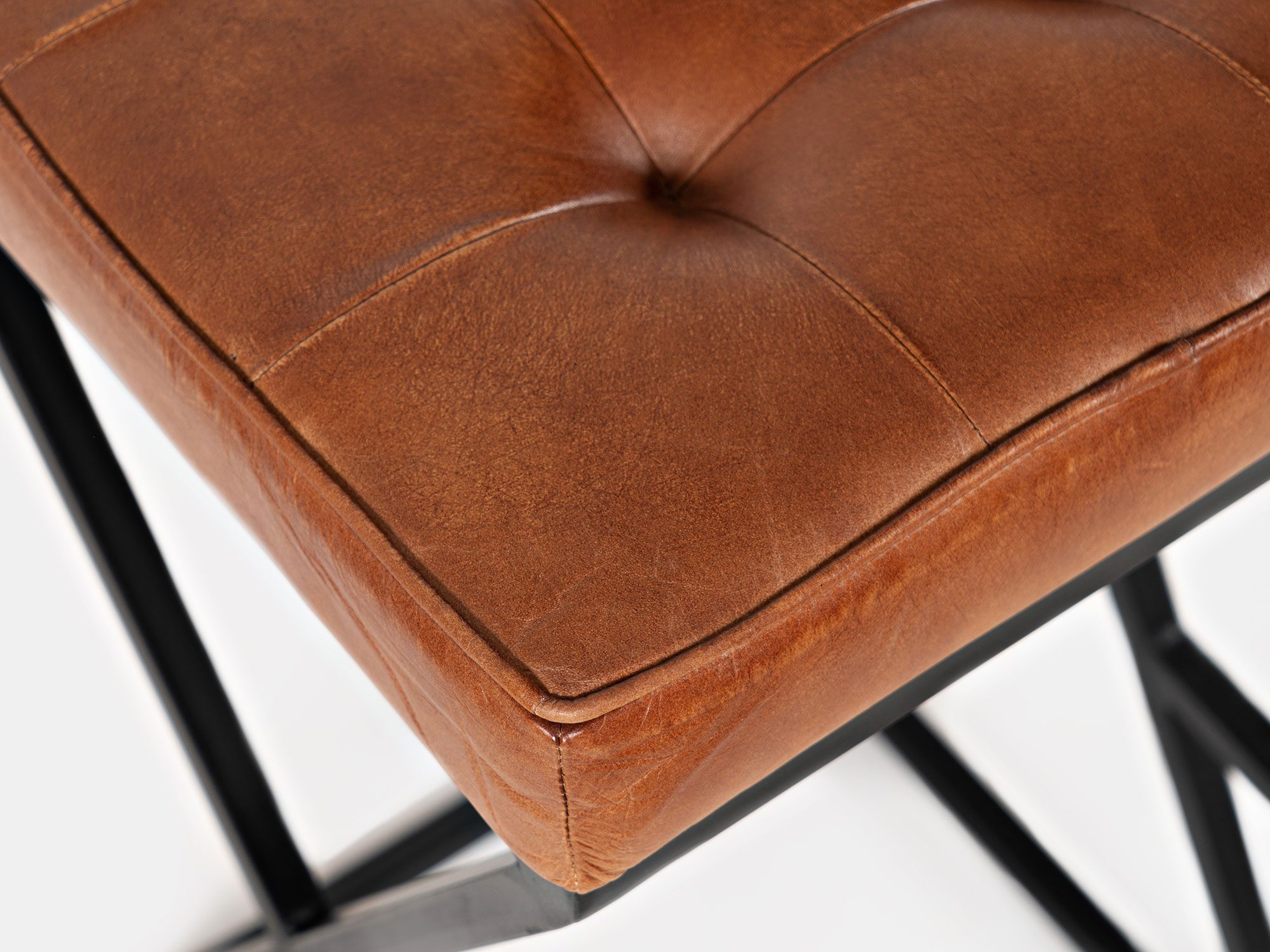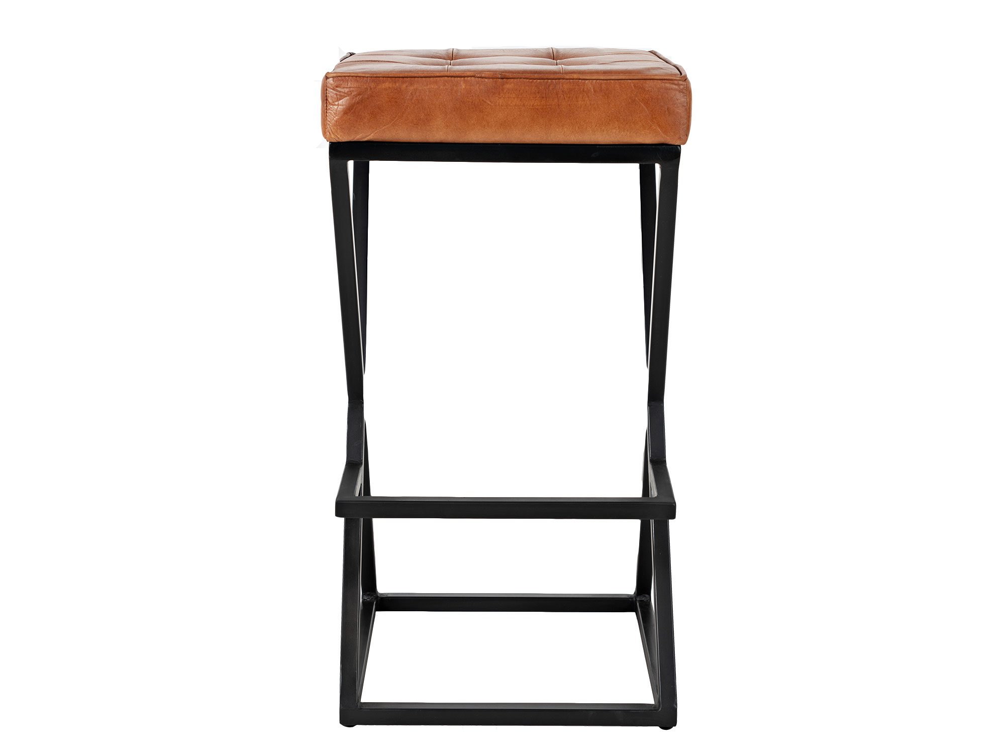 Hoker z pikowanym siedziskiem z naturalnej skóry w kolorze rdzawo-brązowym oraz czarnym stelażem w stylu industrialnym. Podstawa hokera jest w kształcie kwadratu, natomiast boki w kształcie litery X.