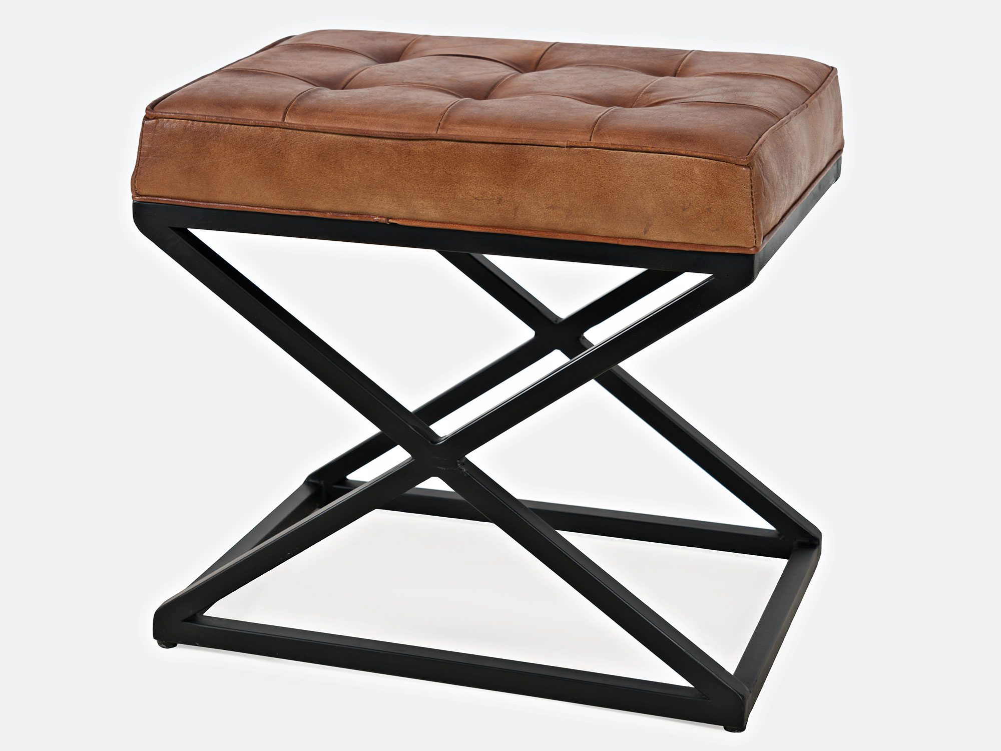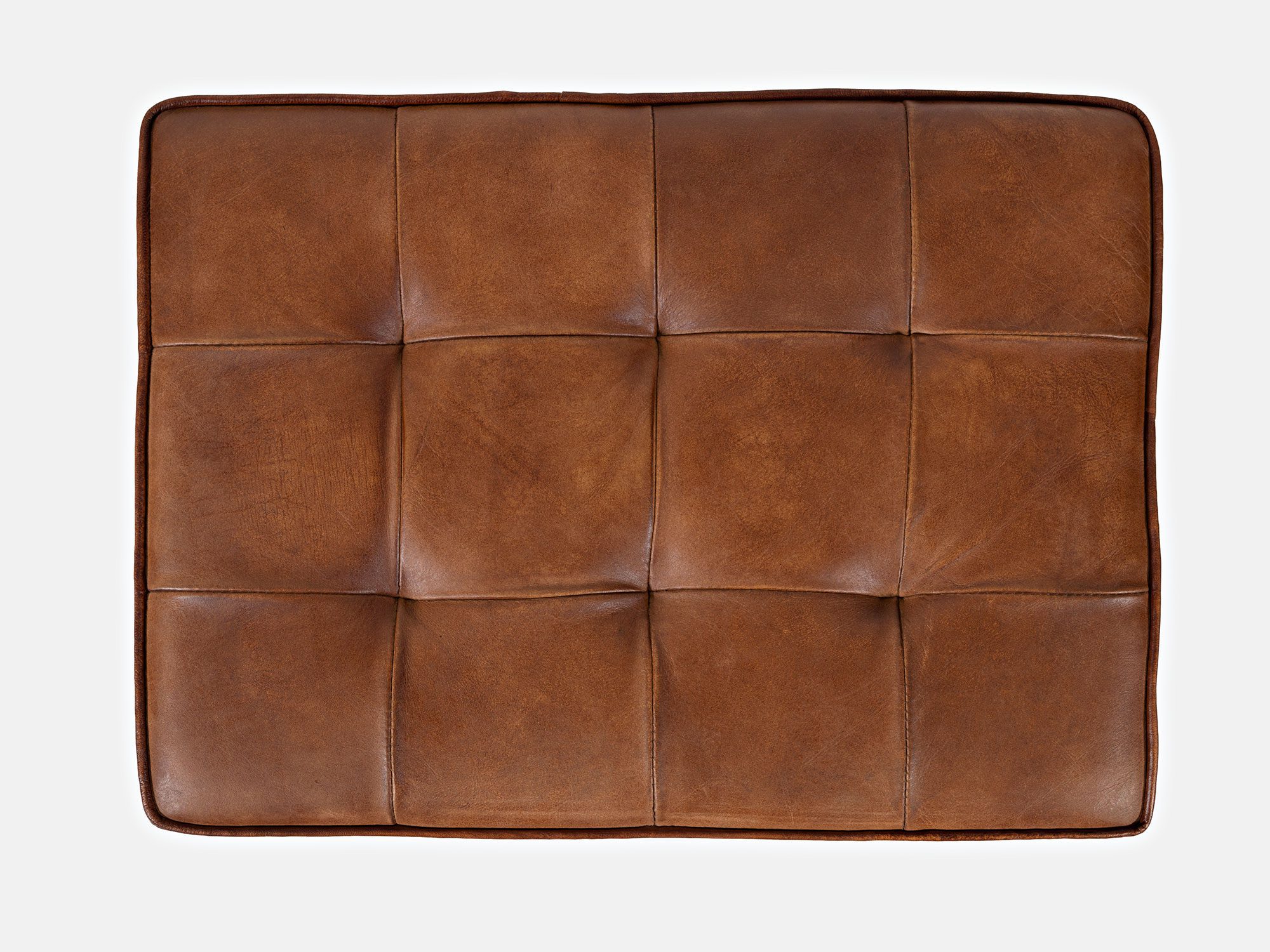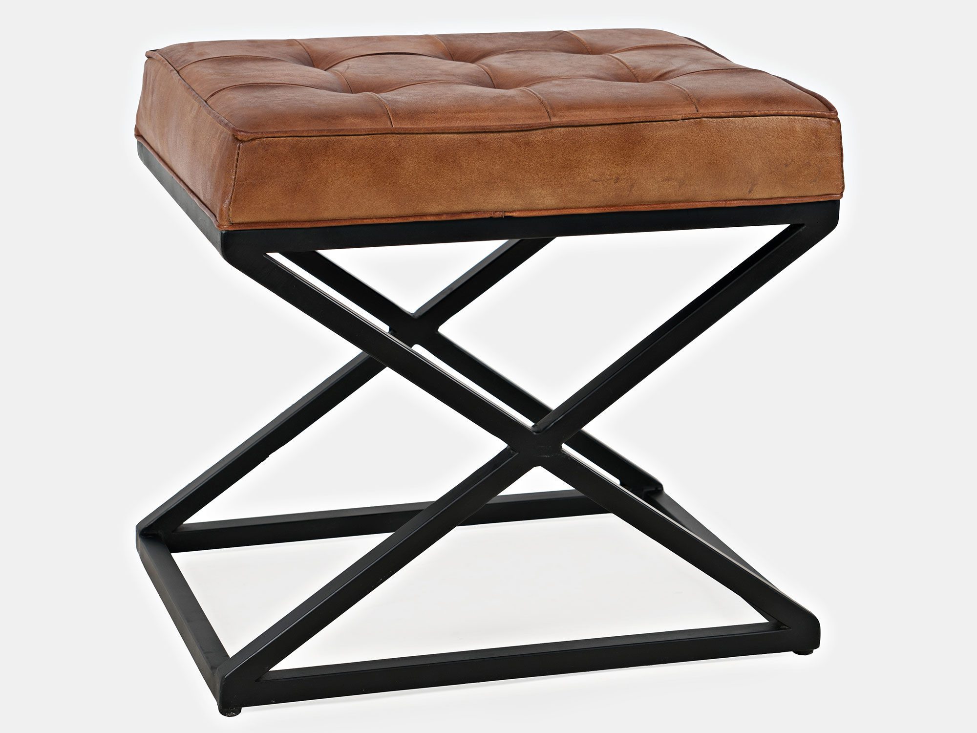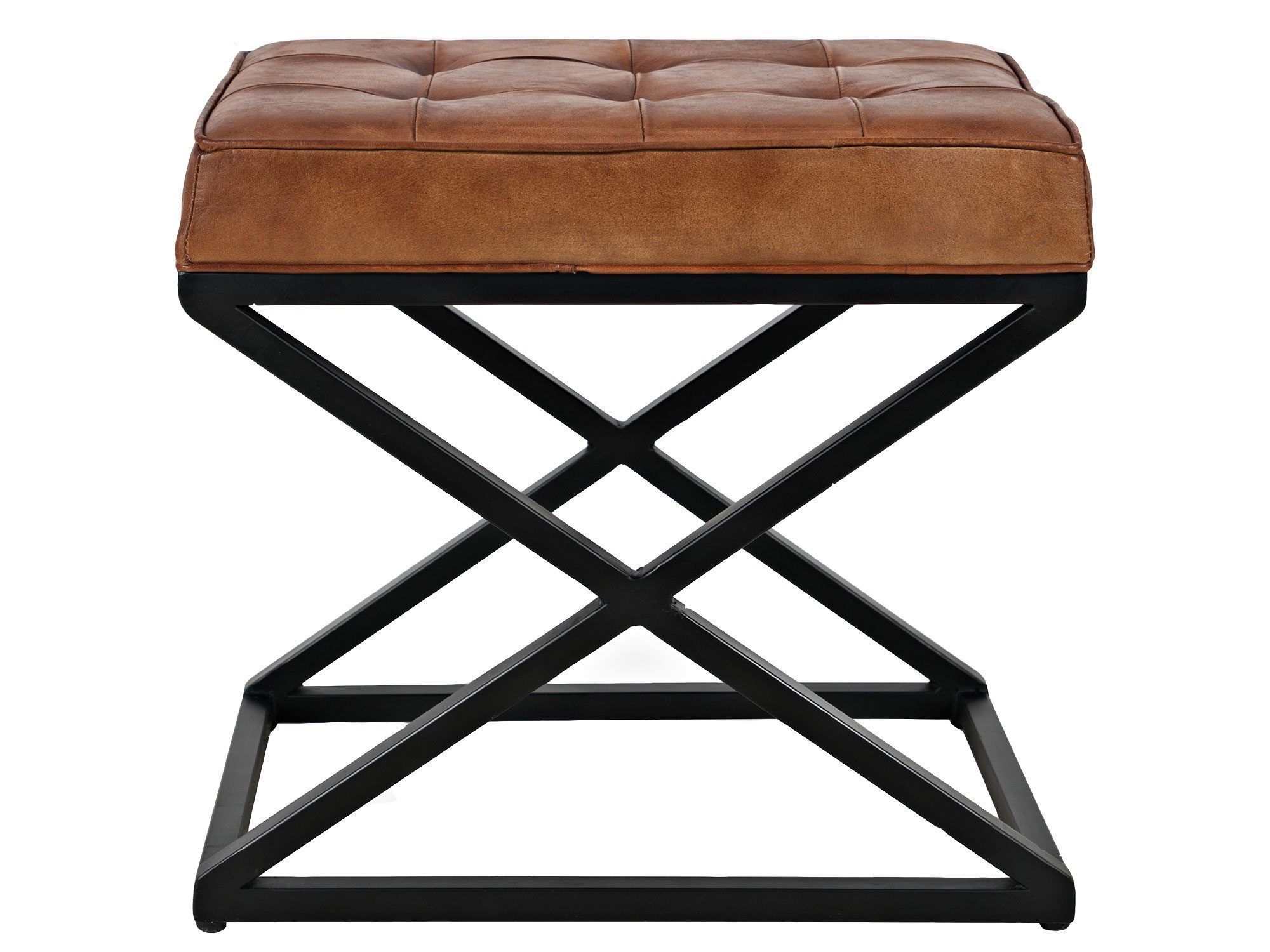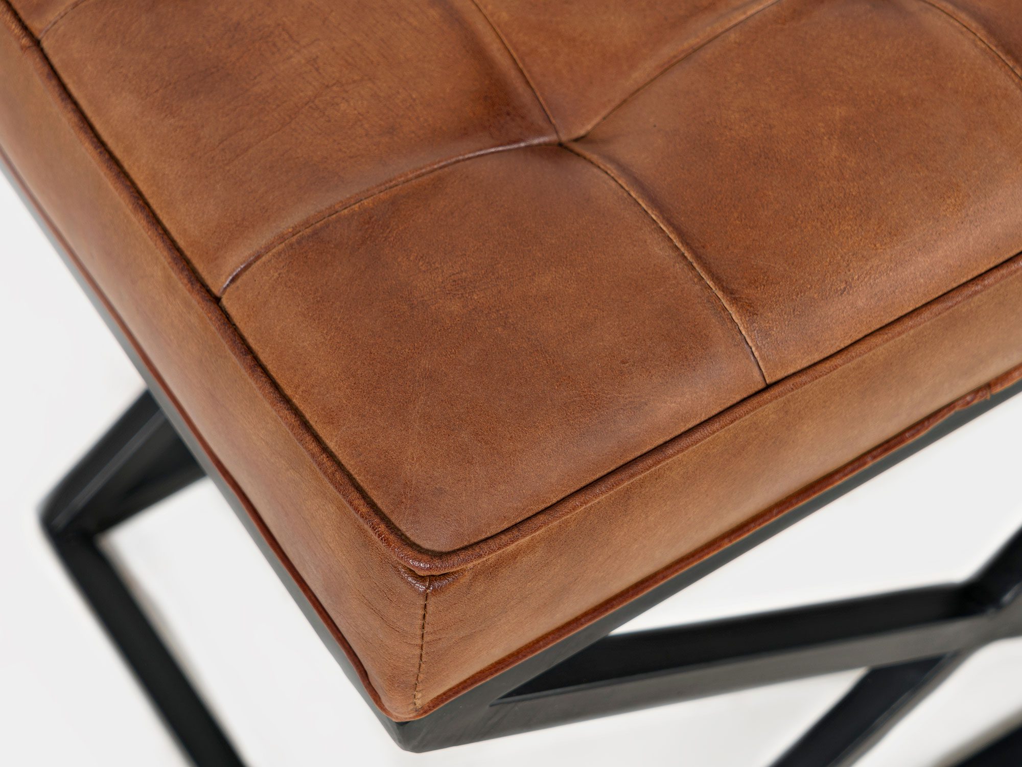 Siedzisko z pikowaną tapicerką z naturalnej skóry w kolorze rdzawego brązu oraz czarnym stelażem w stylu industrialnym. Podstawa siedziska jest w kształcie kwadratu, natomiast boki w kształcie litery X.