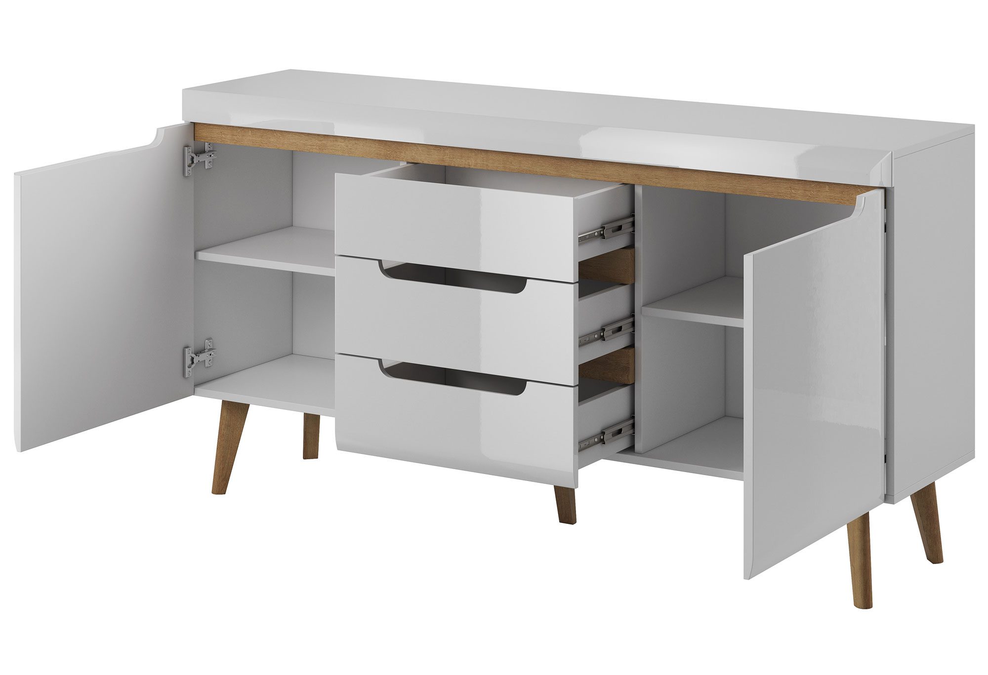 - Cztery szuflady na prowadnicach kulkowych, dwie szafki z cichym domykiem, wyposażone w półki.