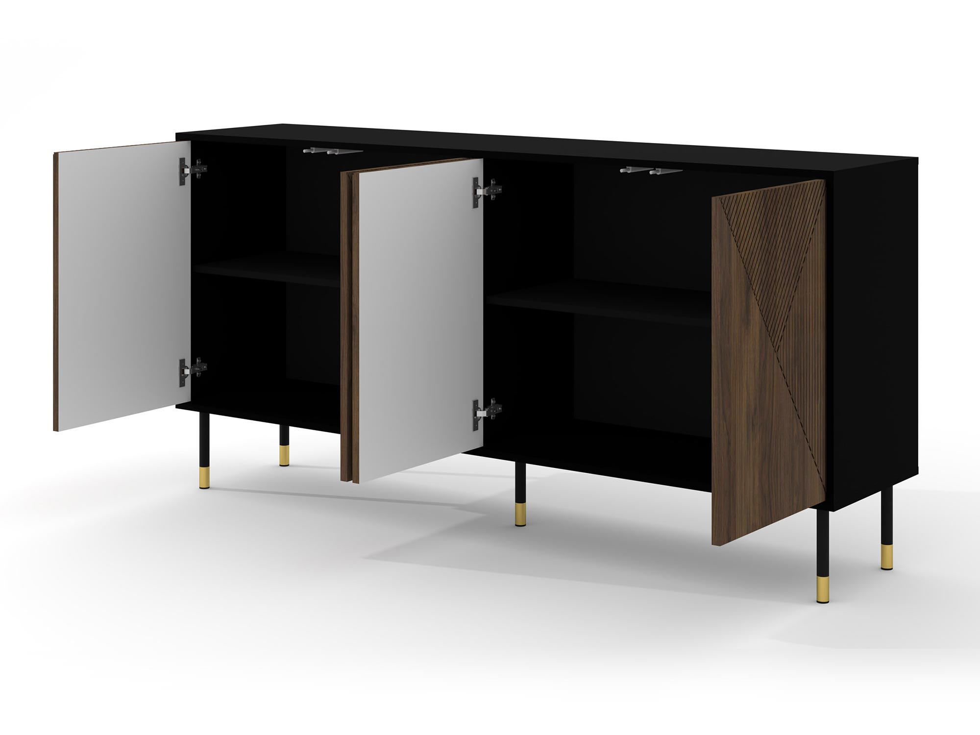 Czterodrzwiowa Komoda Cora Do Salonu dostępna jest w eleganckiej kolorystyce, która doskonale wpasuje się w różne aranżacje wnętrz. Połączenie czarnego matu z frontami w kolorze dębu catania tworzy nowoczesny i stylowy wygląd, który doda charakteru Twojemu salonowi.