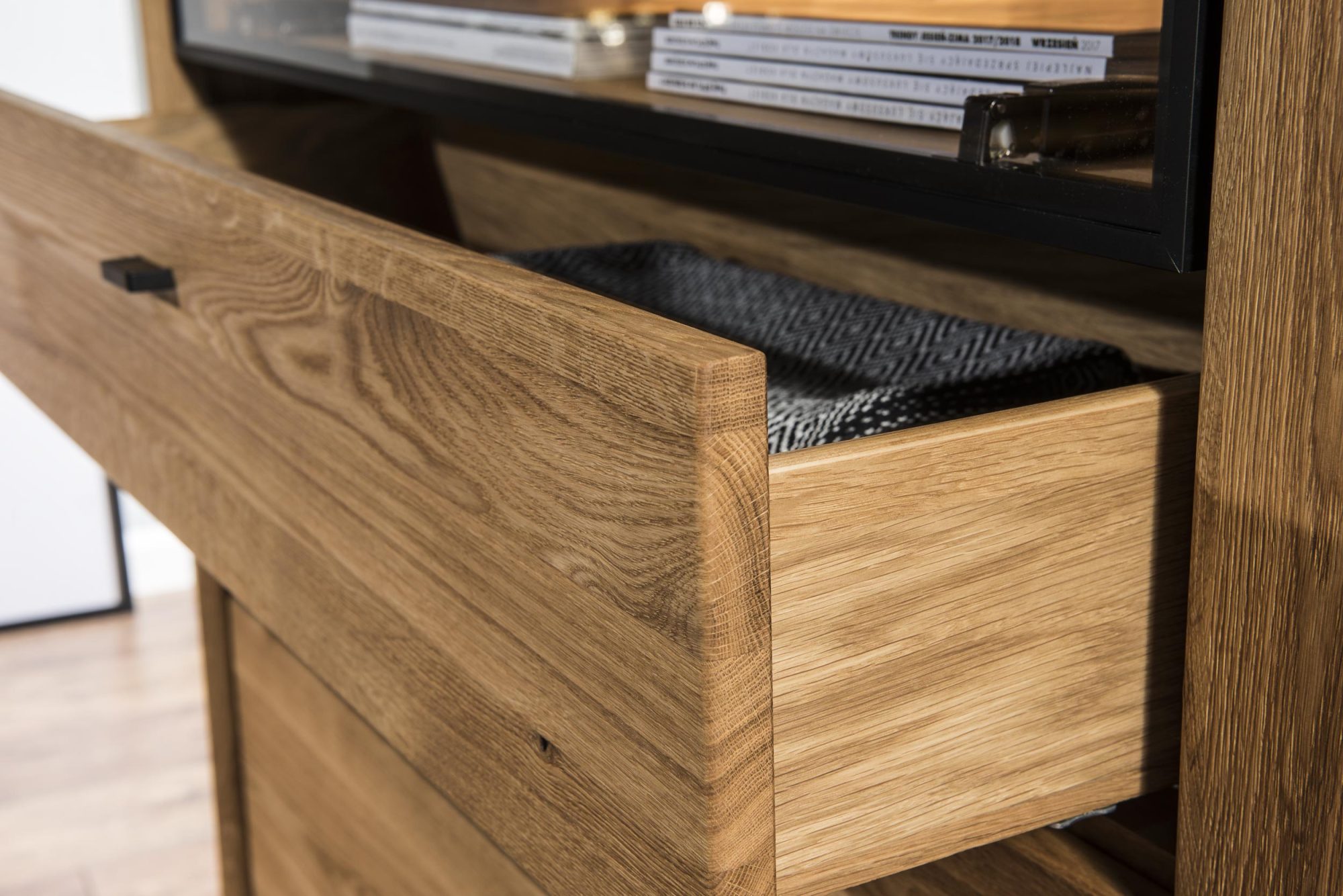 Drewniana komoda do salonu szuflady szafka przeszklenie aranżacja TOLEDO
