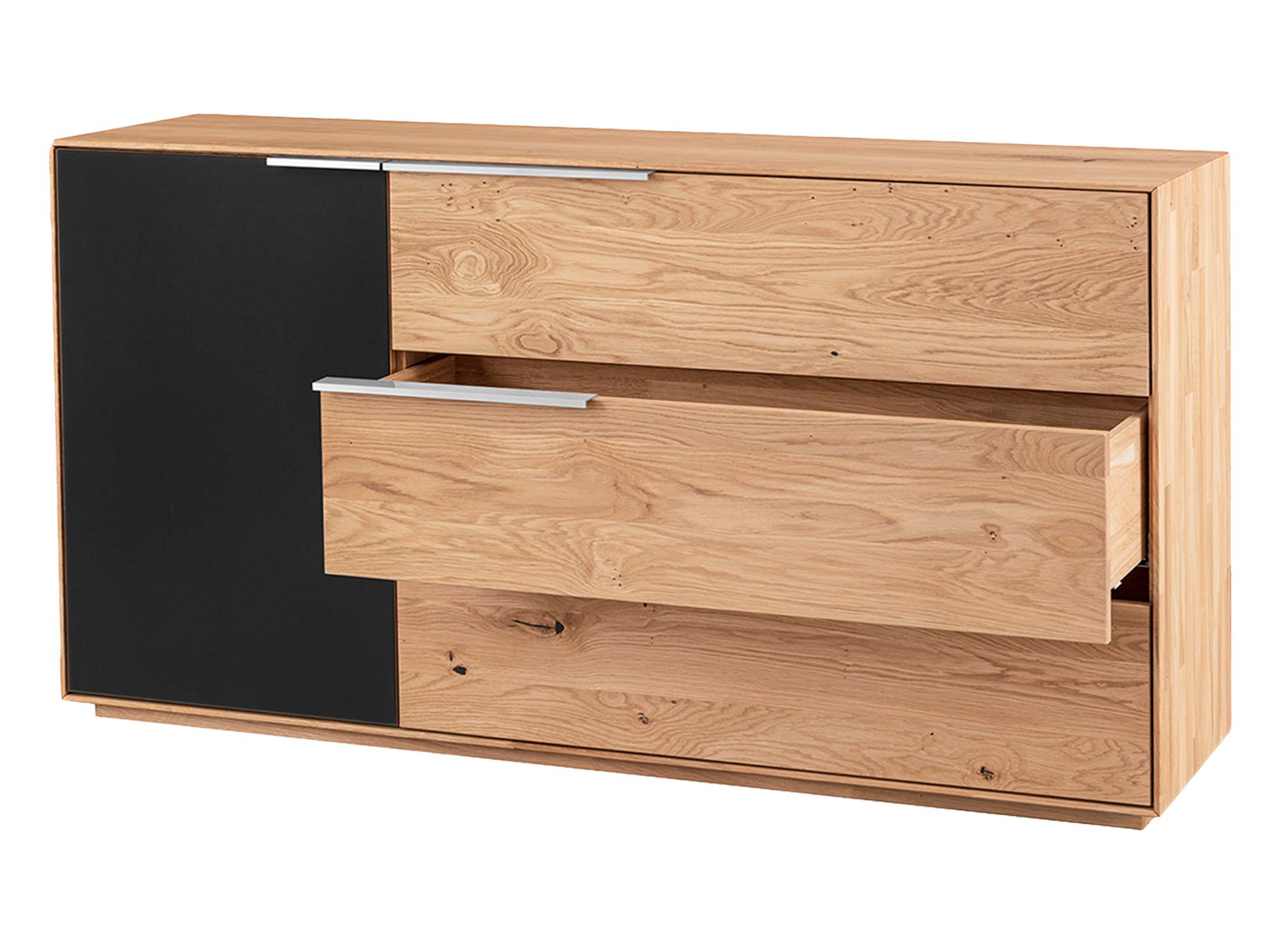 Asymetrię bryły buduje lewa część z drzwiczkami – za nimi znajdziesz regulowaną półkę, która dostosowuje przestrzeń do większych przedmiotów: koców, segregatorów, pudeł. Front drzwiczek to hartowane szkło w kolorze antracytu – akcent nowoczesny, głęboki i elegancki. Po prawej stronie umieszczono trzy pojemne szuflady, w których wygodnie rozdzielisz bieliznę, tekstylia, dokumenty lub akcesoria codziennego użytku.