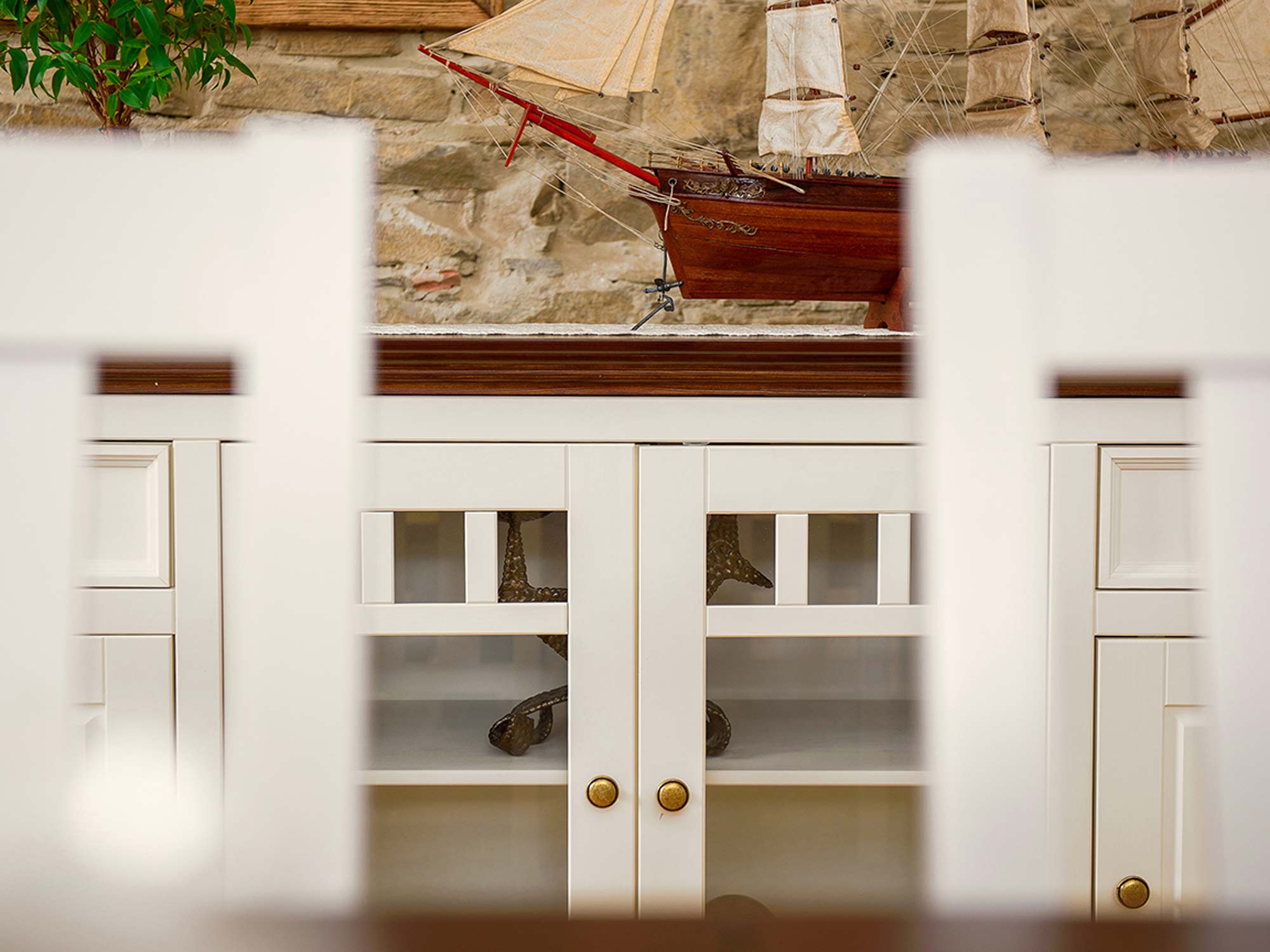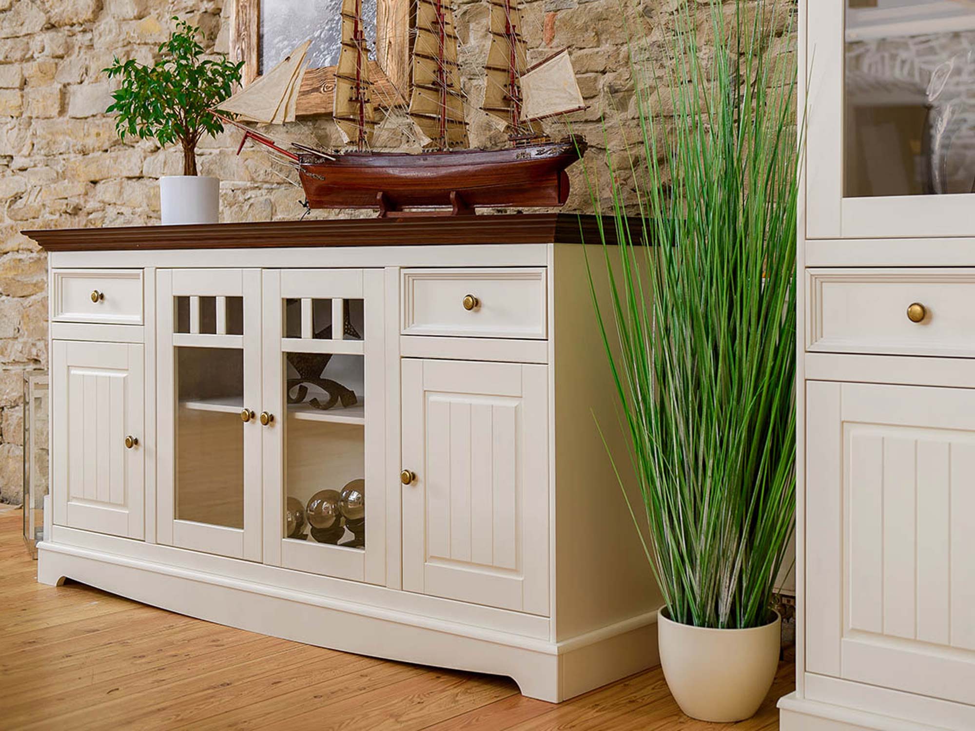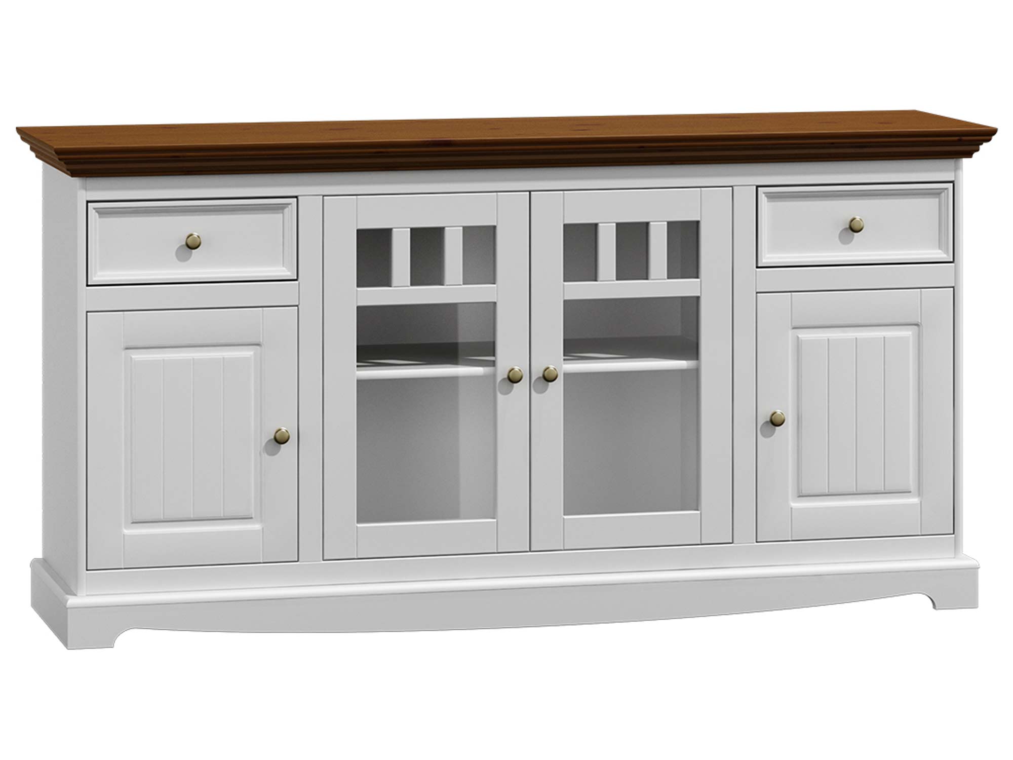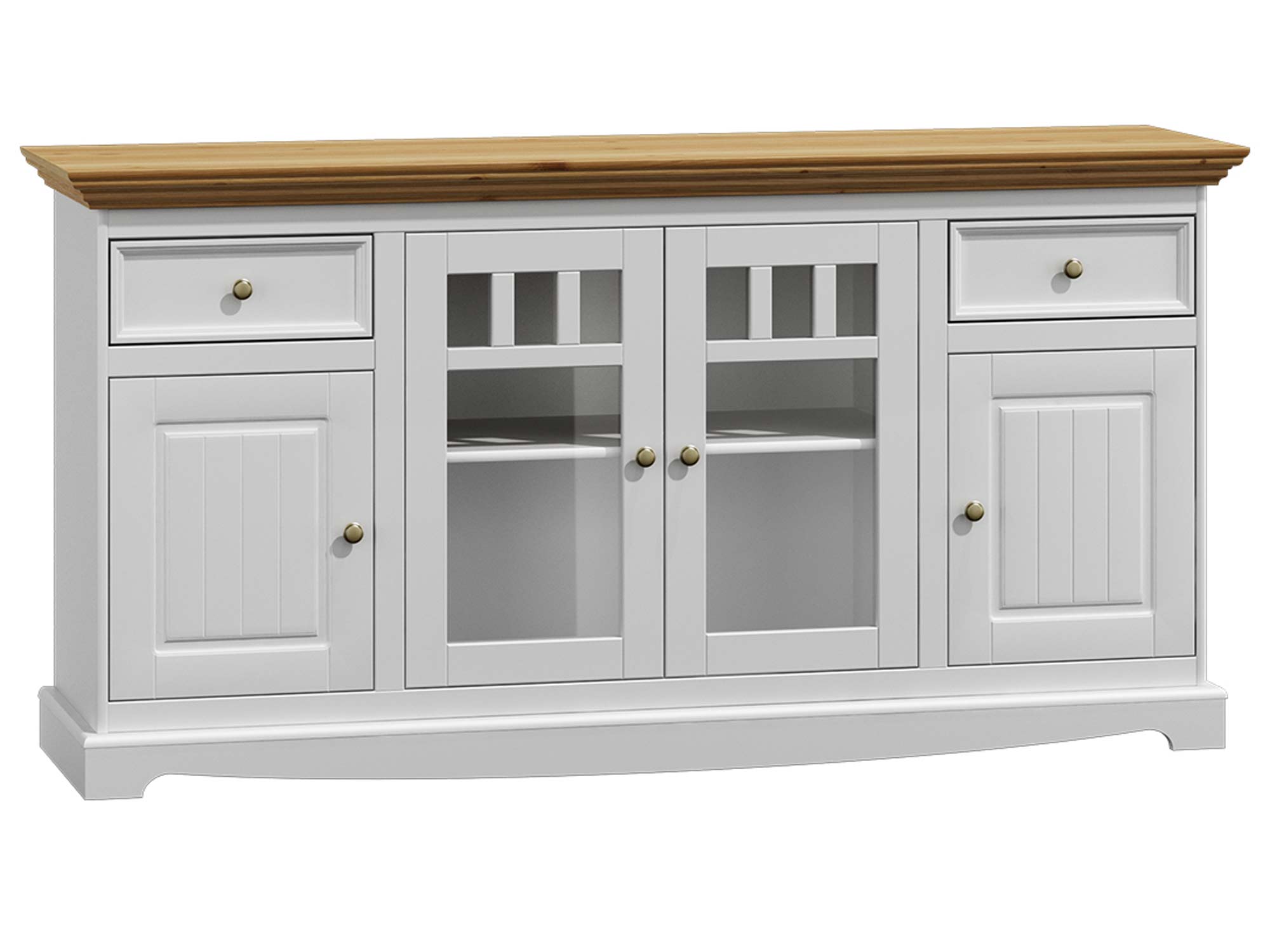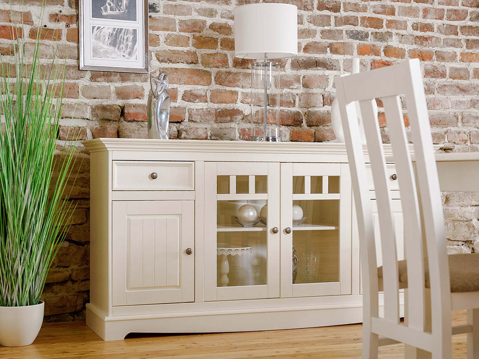 Sosnowa komoda na styl vintage INGRID to mebel, która wyróżnia się funkcjonalnością oraz niezwykle szykownym wyglądem. Co istotne, posiada dwie szuflady na przechowywanie drobnych rzeczy oraz dwie przestrzenie z półkami, co jest kolejną przestrzenią na przechowywanie. Dodatkowo znajdują się dwie przestrzenie za przeszklonymi drzwiczkami. Jest to zdecydowanie świetne miejsce na wyeksponowanie domowej zastawy, szkła czy innych dekoracji. Ponadto blat to dodatkowa przestrzeń na udekorowanie przestrzeni rodzinnymi pamiątkami czy innymi dekoracjami. Co więcej praktyczne uchwyty stylizowane są na stare złoto/srebro, co dodaje meblu unikalności oraz klimatu vintage. Ponadto, szuflady oparte są na prowadnicach z systemem cichego domyku, co znacznie umila użytkowanie oraz chroni przed zniszczeniami. Szafka posiada kilka kolorów blatu do wyboru, dzięki czemu można stworzyć jedyny w swoim rodzaju mebel. Zarówno korpus jak i wieniec zdobią efektowne frezy, które nadają mu klasy i charakteru.
