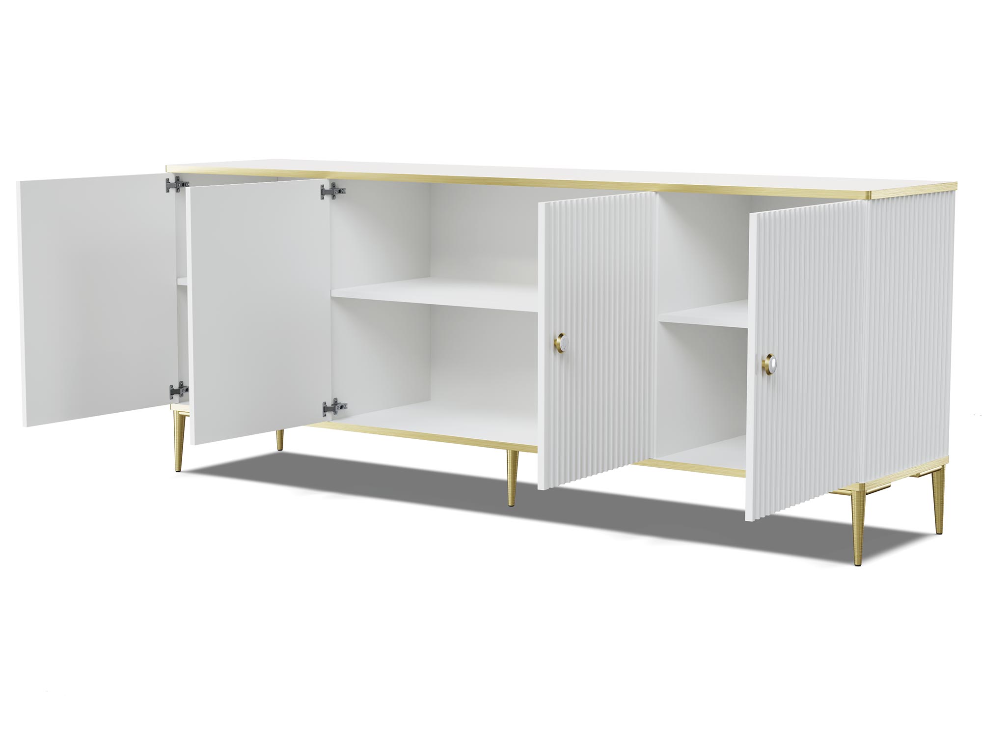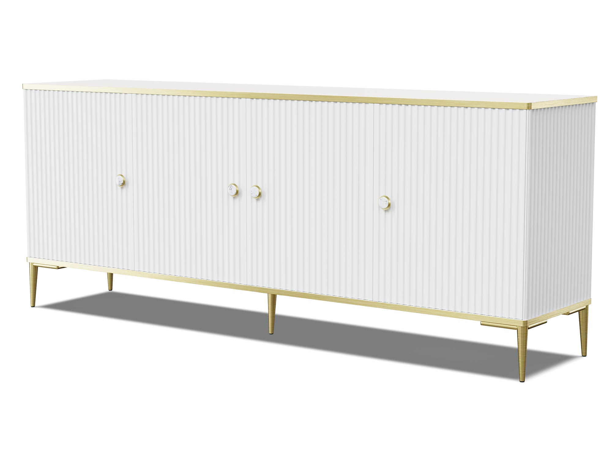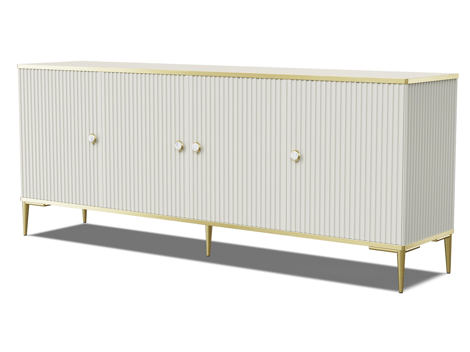 Nowoczesna szafka RTV z pionowymi frontami, złotymi nogami i marmurowymi uchwytami do stylowego wnętrza