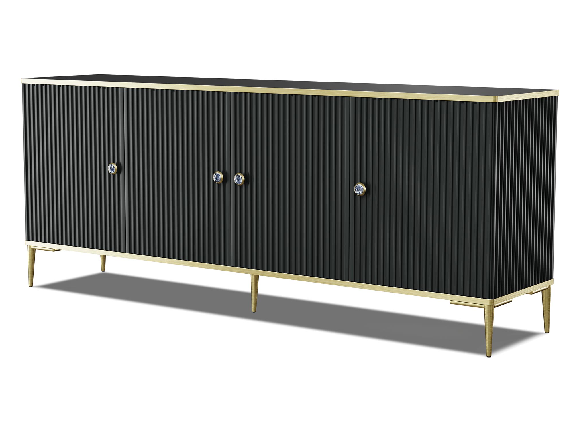 Szafka RTV z czarnymi frontami, pionowymi żłobieniami i złotymi marmurowymi uchwytami w stylu retro