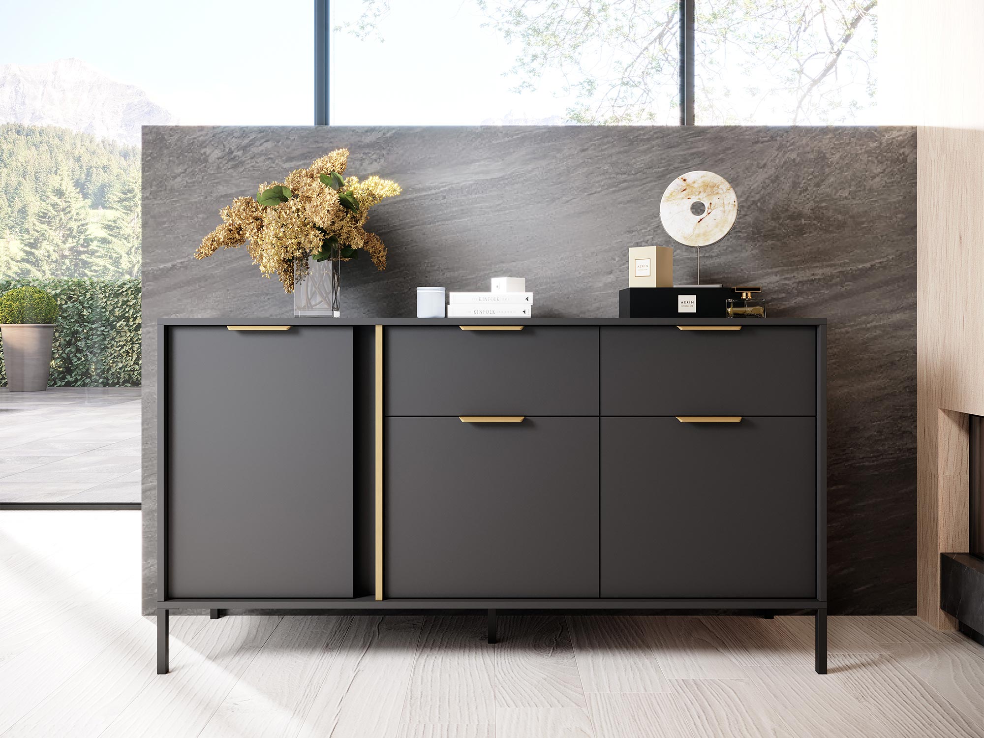 Zaprezentuj swojemu wnętrzu Komodę Mars 153 cm, esencję elegancji i nowoczesności. Ta wyjątkowa komoda, będąca połączeniem klasycznego antracytu z luksusowymi akcentami w złotym kolorze, stanowi idealne rozwiązanie dla wszystkich, którzy cenią sobie połączenie funkcjonalności z niepowtarzalnym stylem. Zaprojektowana z myślą o najbardziej wymagających klientach, oferuje nie tylko praktyczne przestrzenie do przechowywania, ale również dodaje wnętrzu niezwykłej elegancji dzięki dekoracyjnemu obrzeżu ABS i metalowym uchwytom w kolorze złotym.