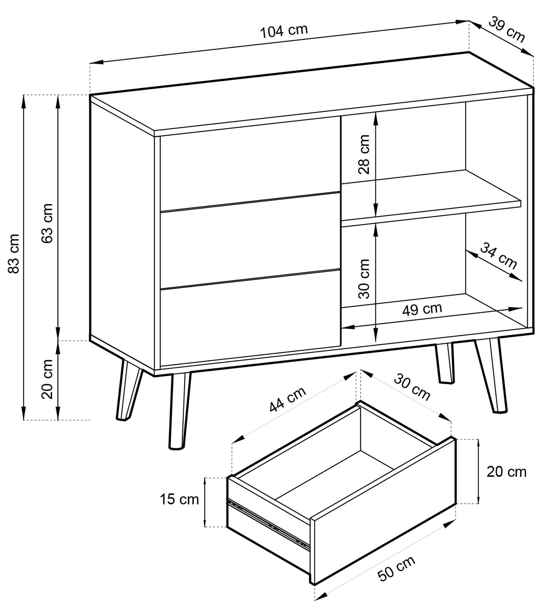 Głębokość: 39 cm / Szerokość: 104 cm / Wysokość: 83 cm