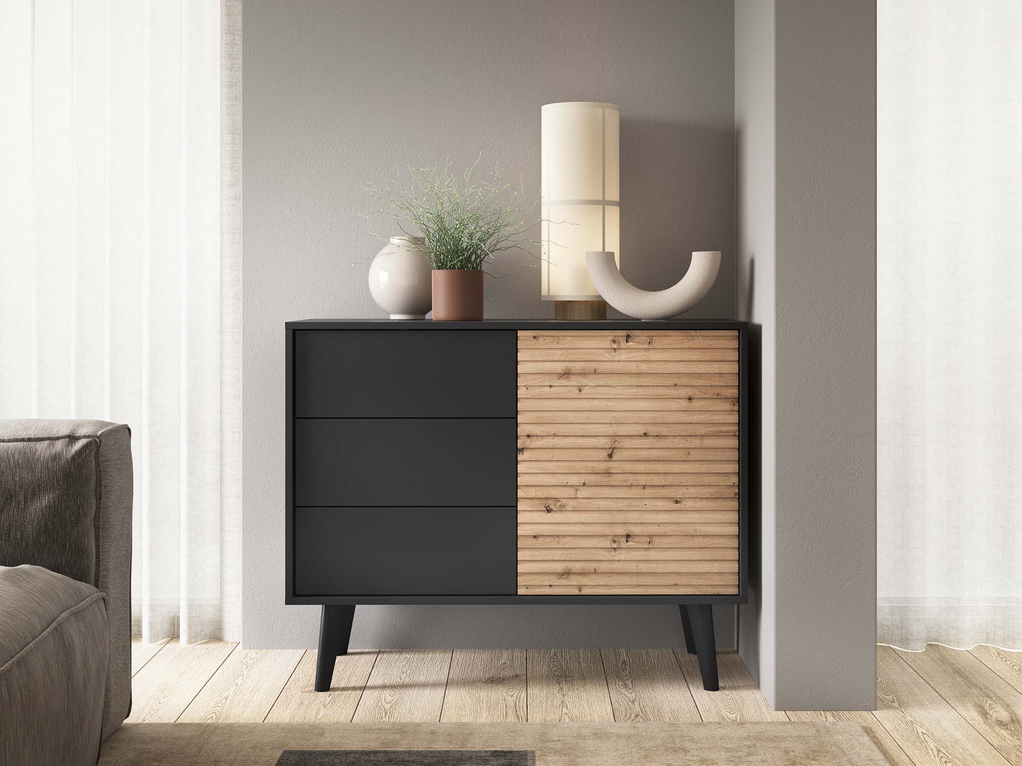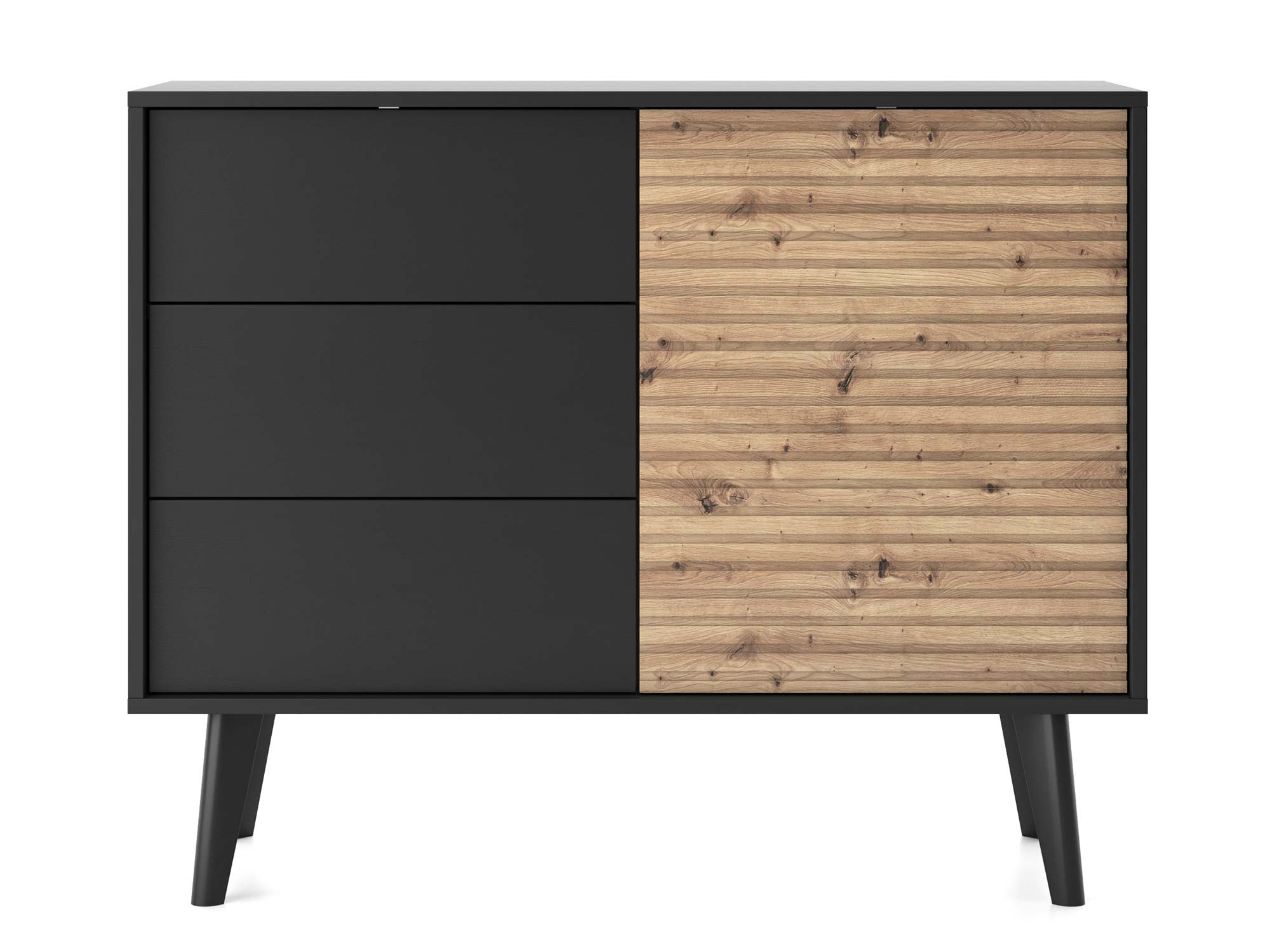 Odkryj Komoda Wierzba 104cm, która z poziomymi liniami ryflowanych frontów w dębie Artisan kontrastuje z ciemnym korpusem, tworząc wyrafinowany i nowoczesny element w Twoim domu. Postawiona na ukośnych, drewnianych nóżkach, które poszerzają się ku górze, komoda ta nie tylko prezentuje się wyjątkowo, ale również zapewnia stabilność i trwałość. Idealna do pokoju dziennego i nie tylko, oferuje szerokie możliwości aranżacyjne dzięki swojej wszechstronności.