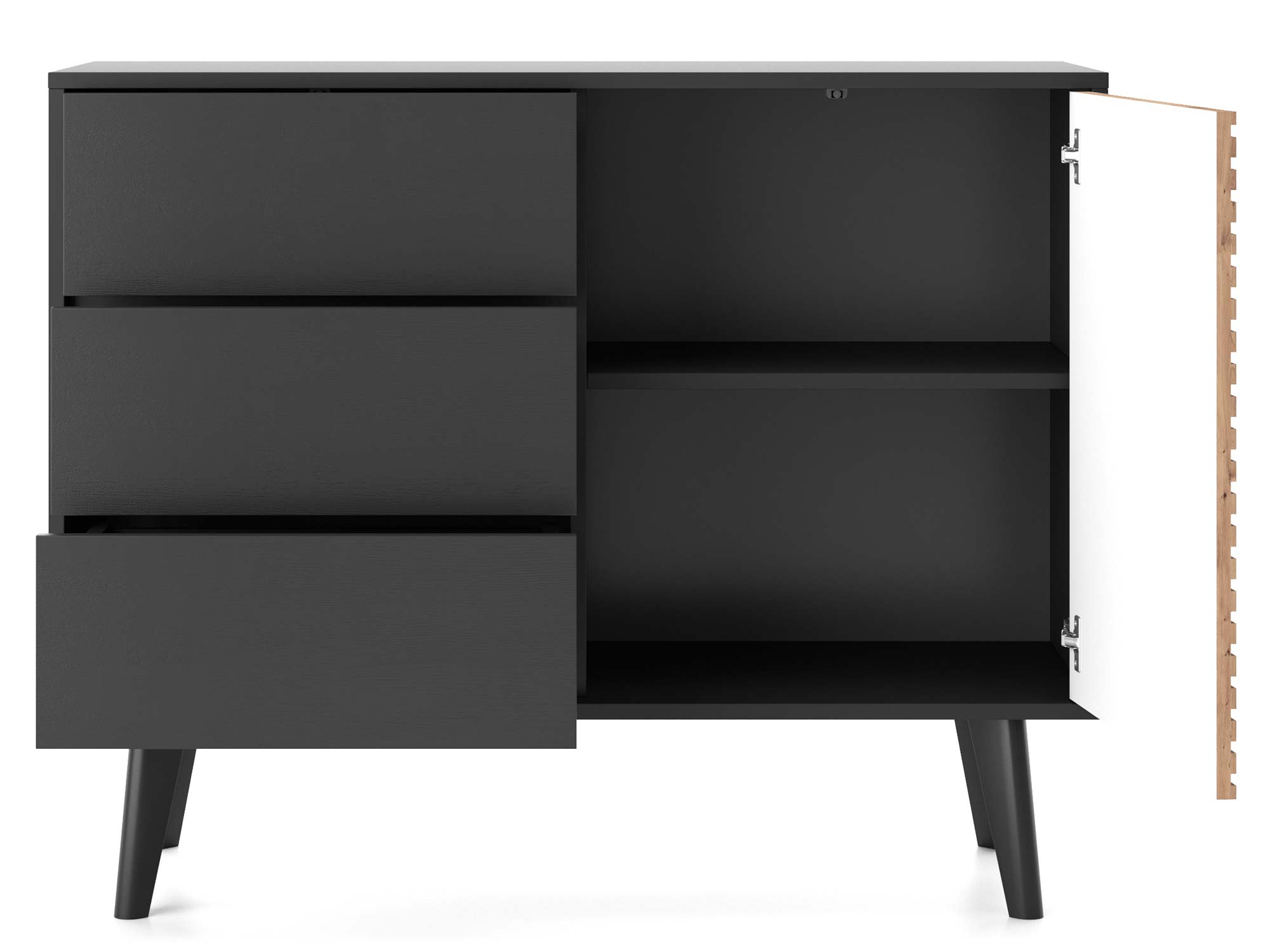 - Nowoczesny kontrast kolorów – Połączenie dębu Artisan z ciemnym korpusem podkreśla nowoczesny charakter komody, dodając wnętrzu wyrafinowanego stylu.