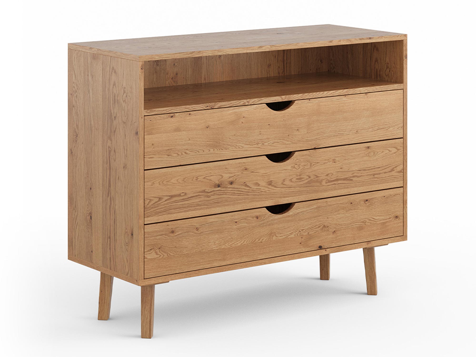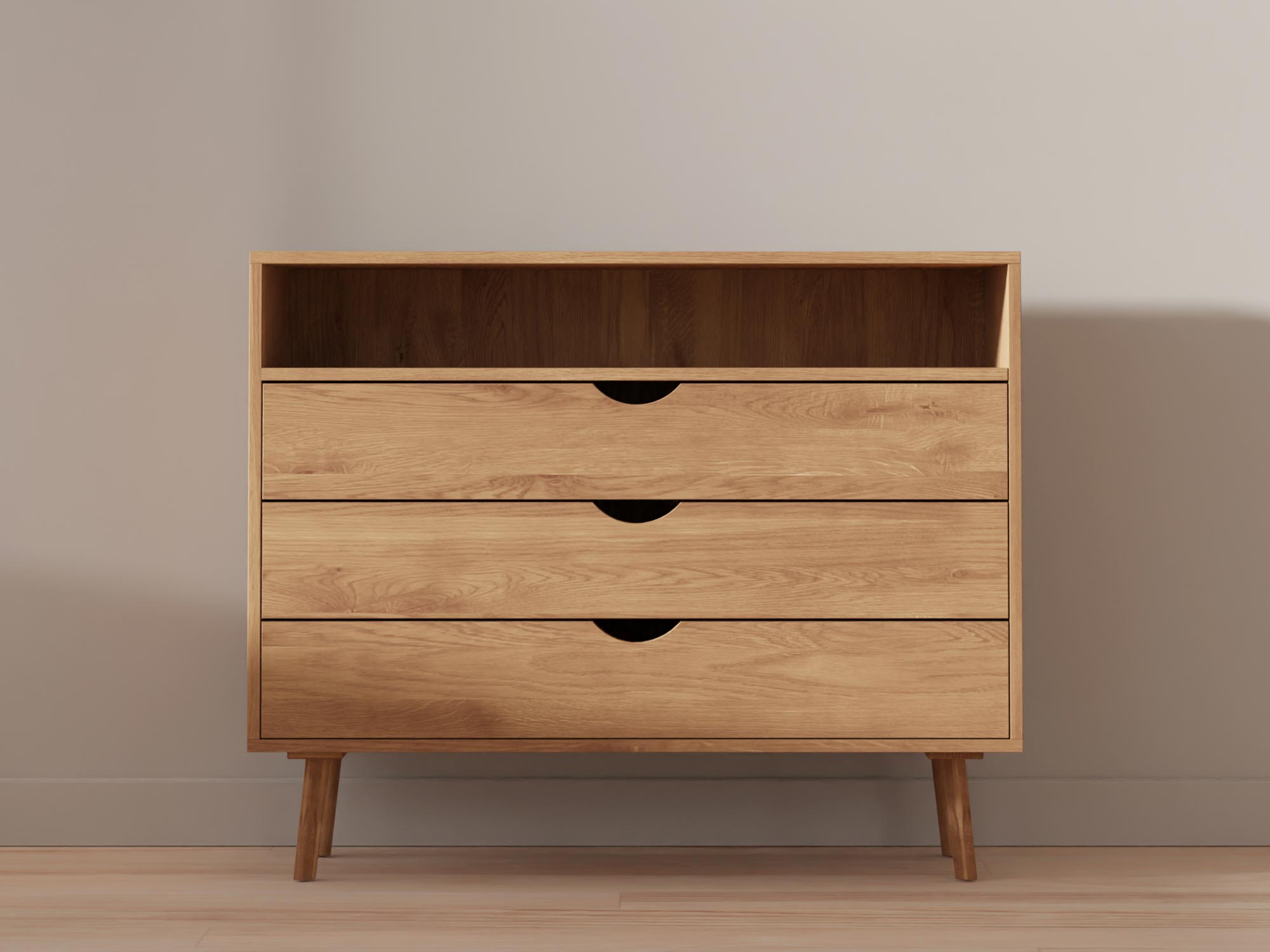Klasyczna Komoda Dębowa Lina została zaprojektowana z myślą o maksymalnej funkcjonalności. Trzy pojemne szuflady z cichym domykiem zapewniają płynne i bezszelestne zamykanie, co podnosi komfort użytkowania. Otwarte wnęki w górnej części są idealne do eksponowania dekoracji lub przechowywania przedmiotów codziennego użytku. Dzięki temu masz wszystko pod ręką, a jednocześnie ukryte przed wzrokiem, co pozwala na utrzymanie porządku.