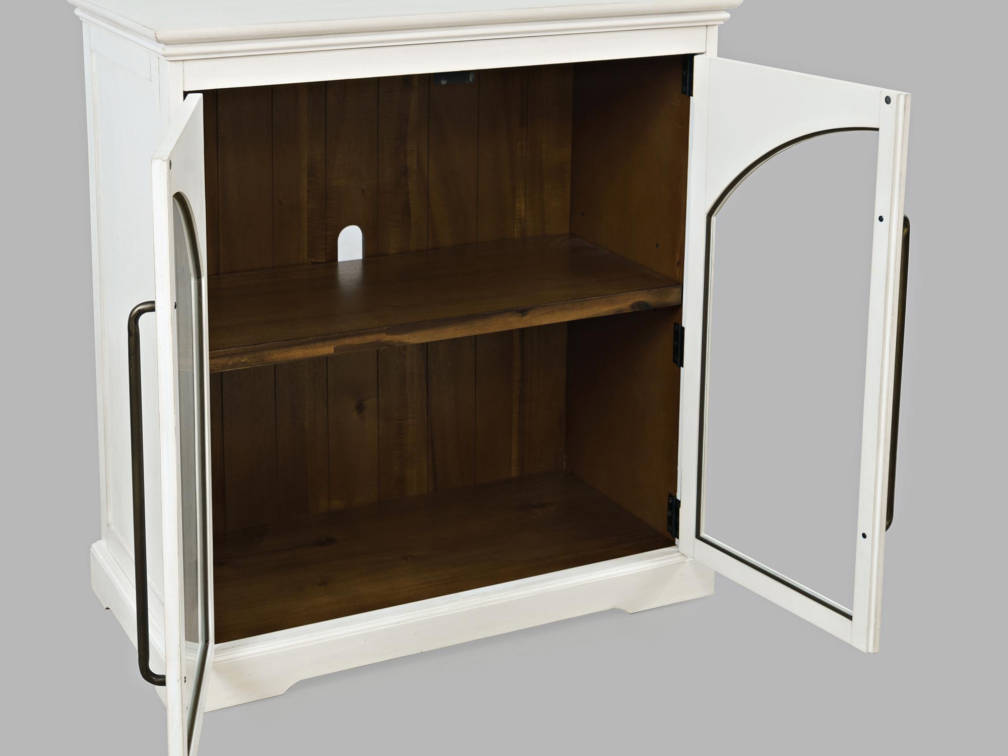 Komoda w kolorze białym, posiada dwoje przeszklonych drzwi z ozdobnymi łukami oraz eleganckie podłużne uchwyty. Prosta forma przełamana jest frezowanymi krawędziami i widocznej strukturze forniru.