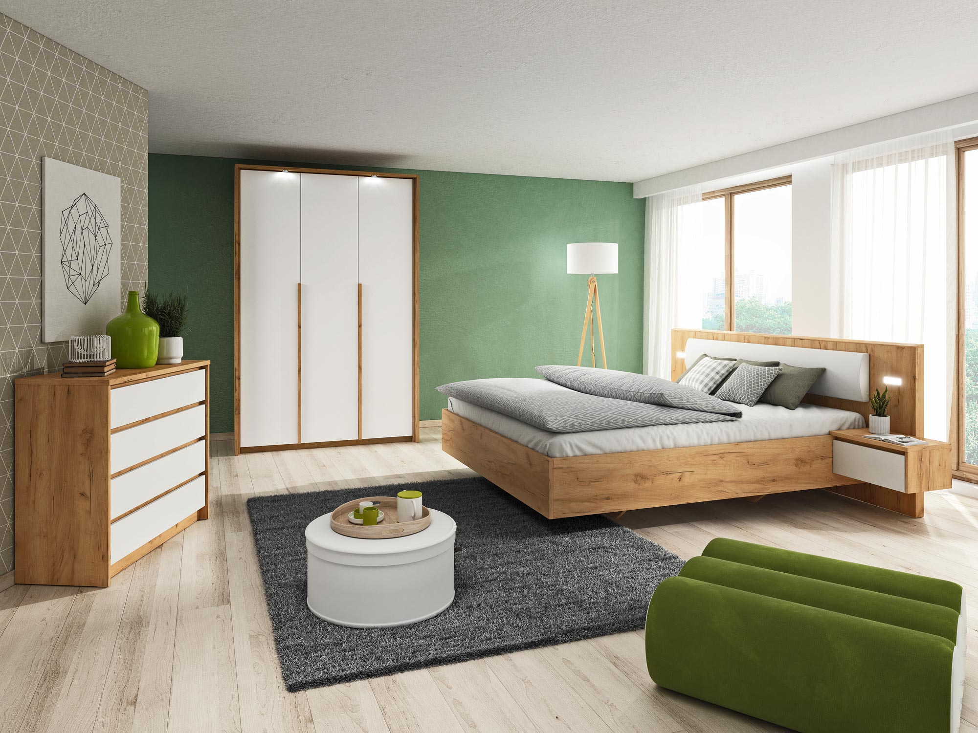 Kolekcja mebli OLSEN Sypialnia zachwyca walorami estetycznymi i sprzyja relaksowi. Z pewnością jasne kolory i proste kształty wpisują się w minimalizm, ale również estetykę stylu skandynawskiego. Ponadto połączenie bieli w wersji mat oraz Dębu Kraft Złotego tworzy spójny design. Co więcej na korpusach wyraźnie rysuje się imitacja naturalnej struktury drewna, co dodaje meblom unikalności i jednocześnie zachwyca swoim pięknem. Z kolei proste geometryczne kształty nigdy nie wychodzą z mody i można uznać je za ponadczasowe. Zatem, jeżeli stawiasz na wygodę, ale również estetykę to kolekcja OLSEN jest dla Ciebie najlepszym wyborem. Ponadto biała, spokojna kolorystyka w połączeniu z naturalnym dębem pozwoli zbudować magiczną atmosferę w każdej sypialni. Przede wszystkim wszystkie dostępne moduły zostały wykonane z najlepszych materiałów, a szeroki wybór elementów sprawia, że bez problemu można dopasować je do każdego pomieszczenia, niezależnie od rozmiarów. Co więcej warto zwrócić także uwagę na praktyczne rozwiązania, dzięki którym nawet niewielkie wnętrze będzie się świetnie prezentować.