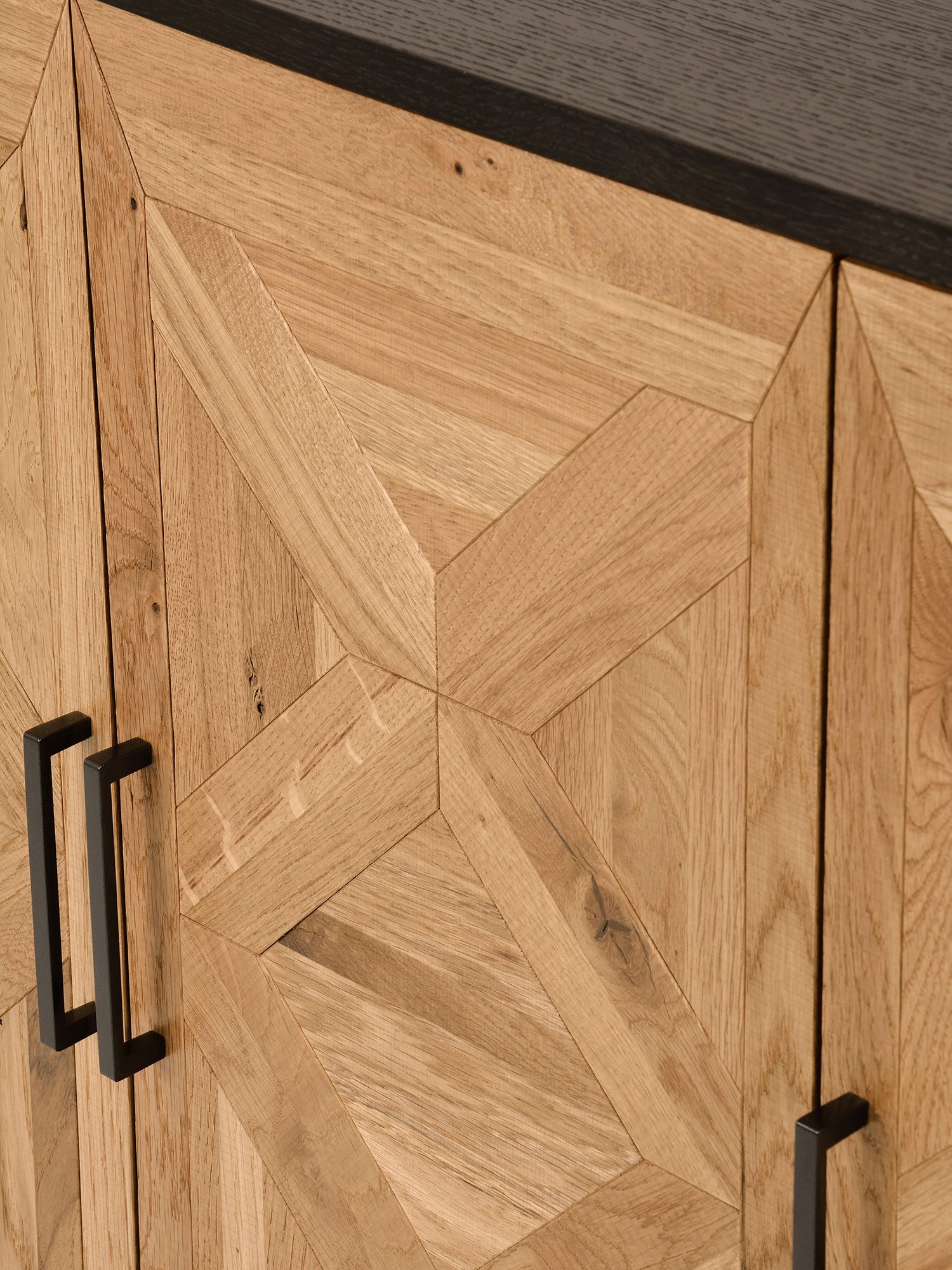 Komoda industrialna z dębową intarsją i czarnymi uchwytami