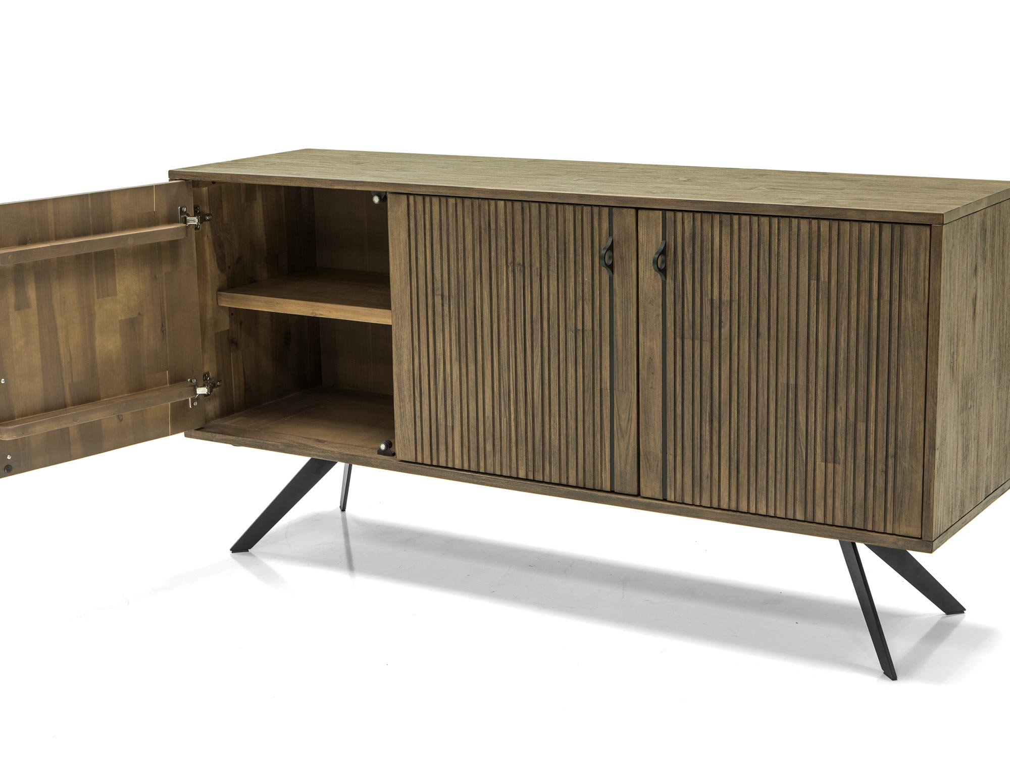 Komoda drewniana w stylu modern vintage, wykonana z wysokiej jakości szczotkowanego drewna akacji egzotycznej, z metalowymi, ergonomicznymi uchwytami, które są częścią designu lameli. Fronty posiadają strukturę 3D z lekkim akcentem lamelowym.