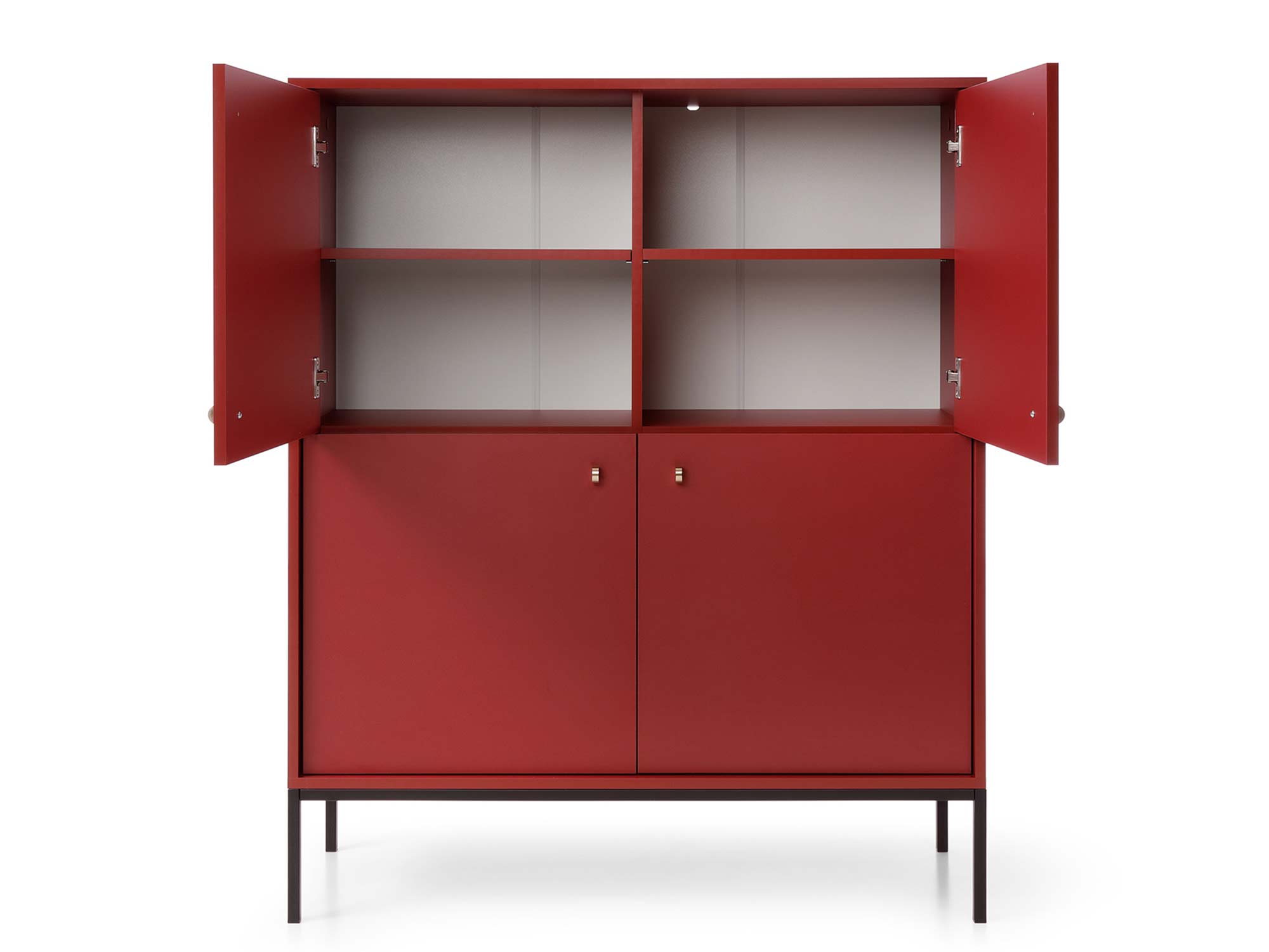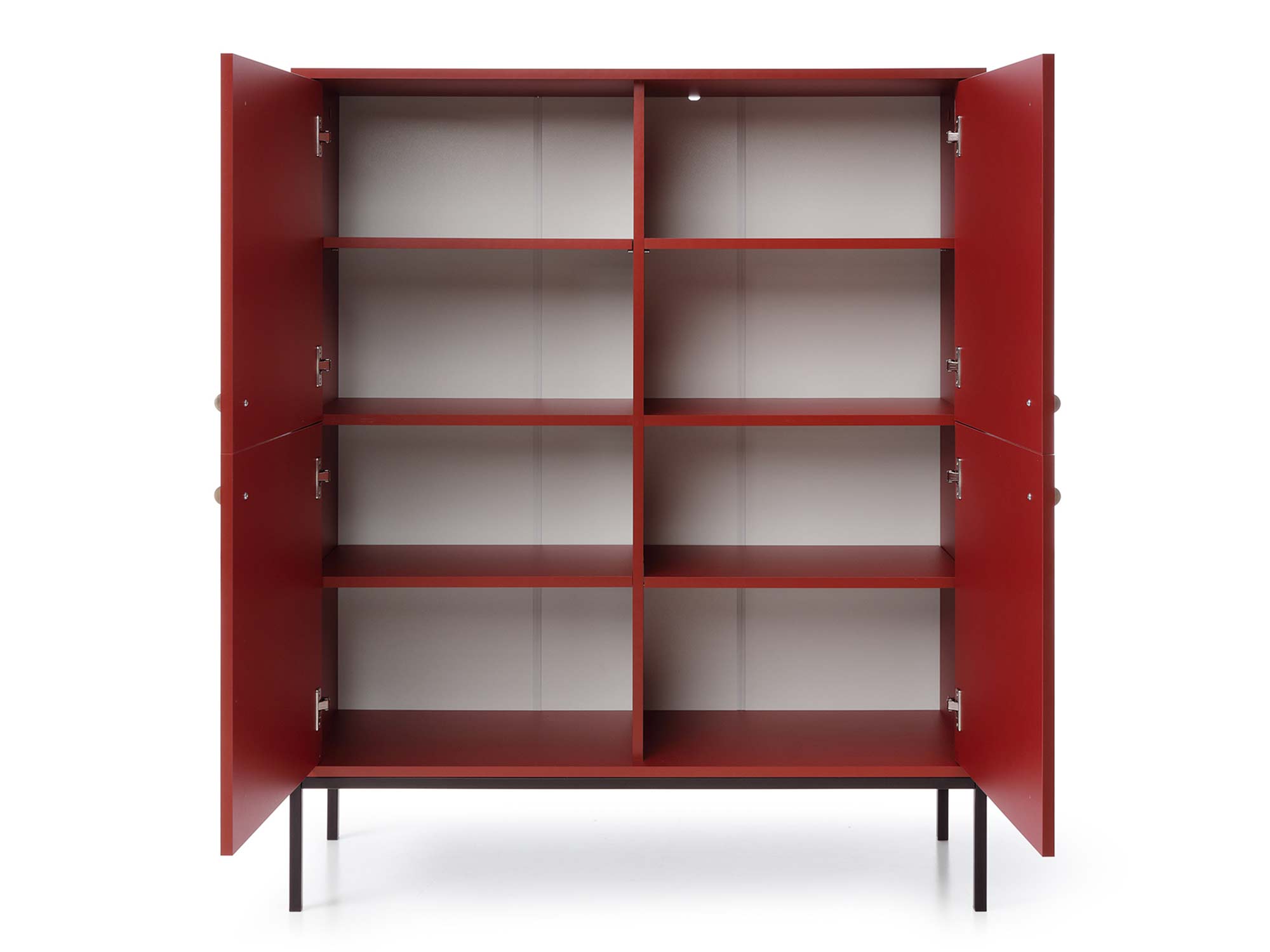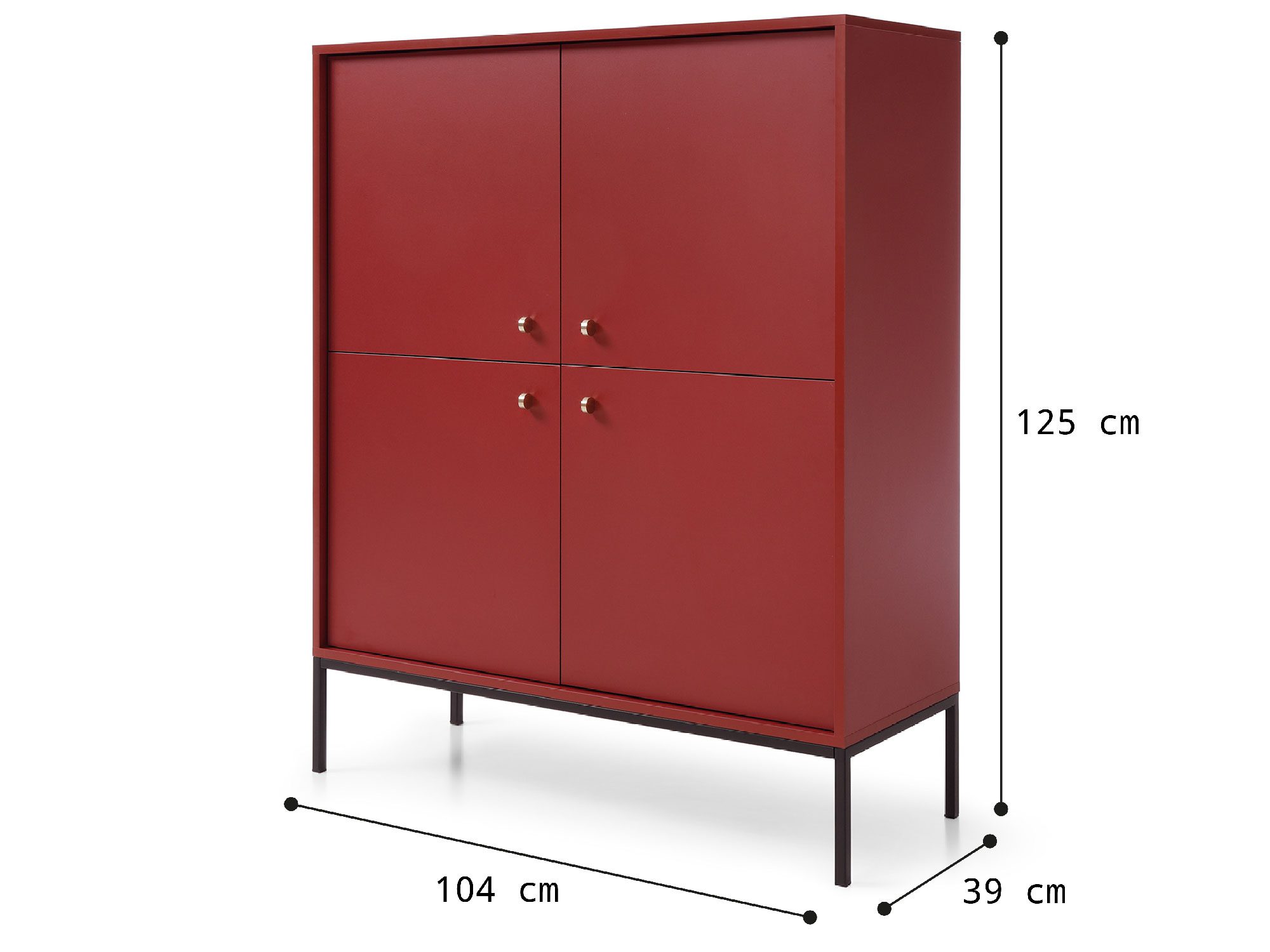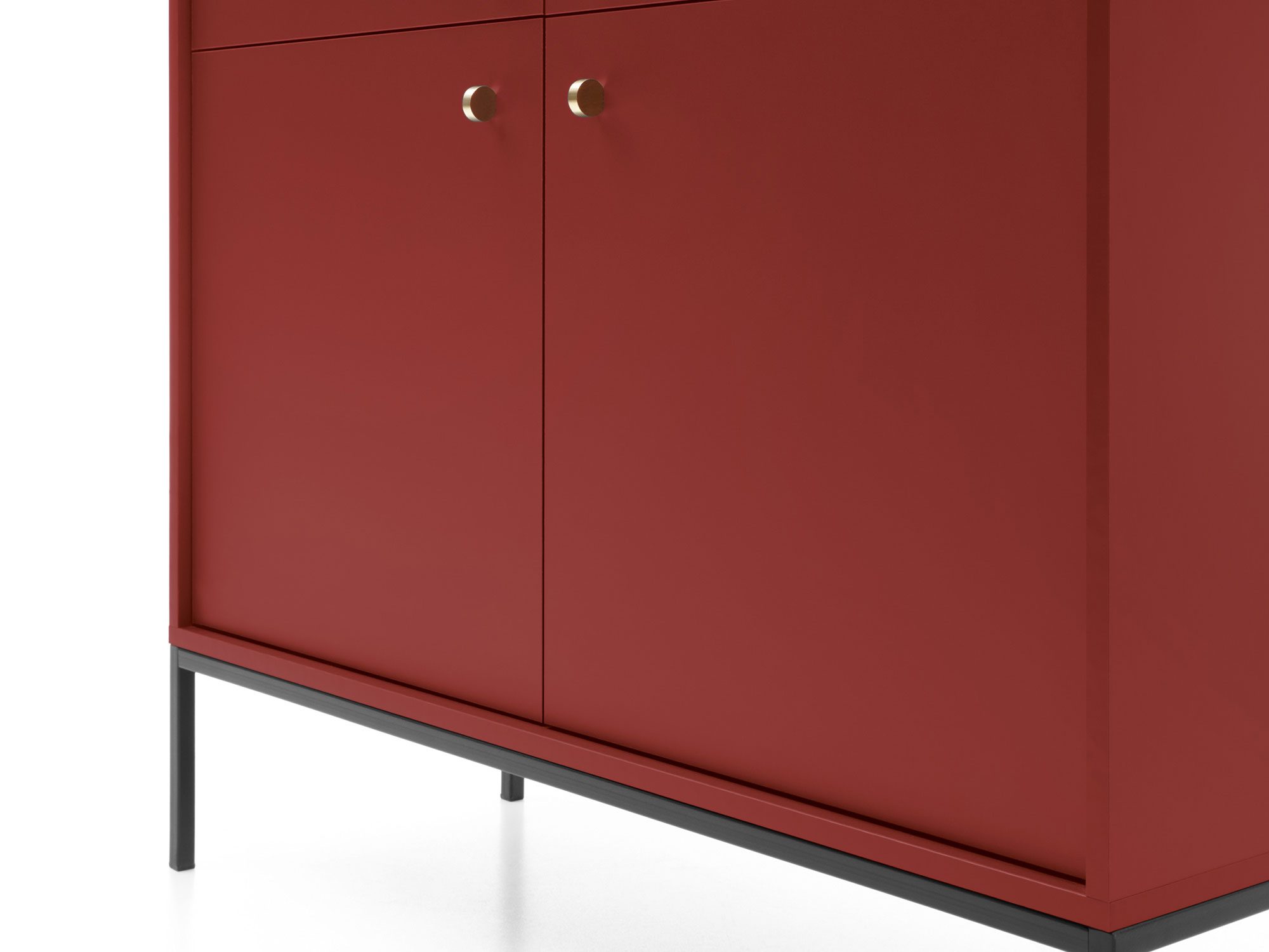 Czerwona szafa z podwójnymi drzwiami i złotymi uchwytami