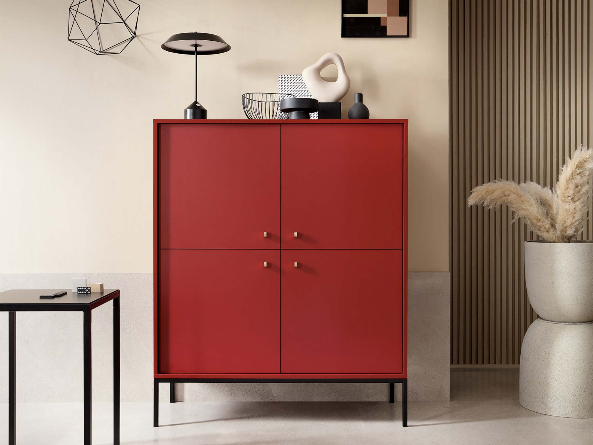 Czerwona komoda w aranżacji nowoczesnego salonu