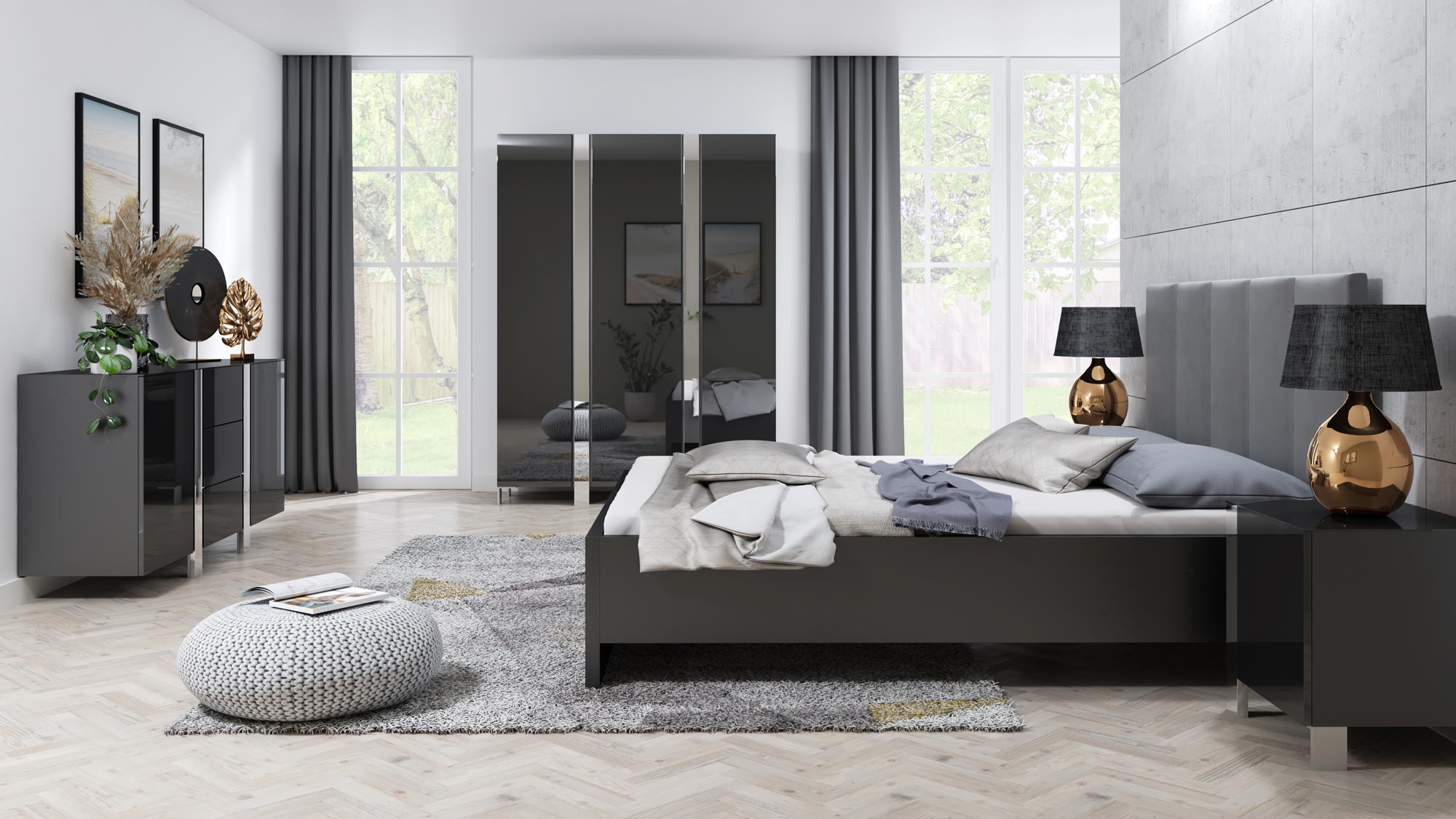 Nowoczesna sypialnia z grafitowymi meblami, prostymi liniami i metalowymi akcentami do stylowego wnętrza