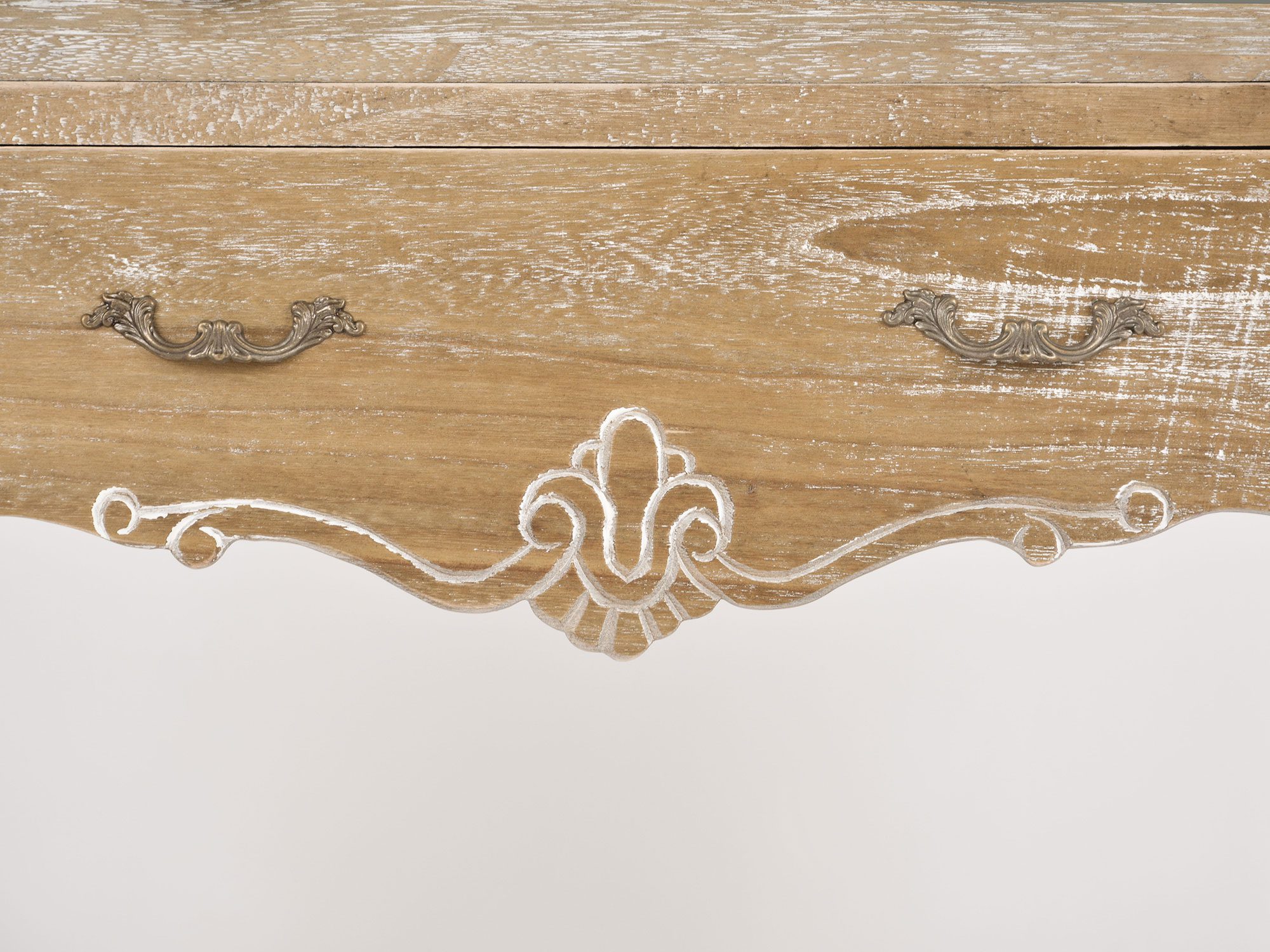 Komoda Viva to mebel, który łączy elegancki styl prowansalski z funkcjonalnością. Wykonana z drewna paulowni, jest zarówno lekka, jak i trwała. Bielona powierzchnia została starannie szczotkowana i przetarta, co nadaje jej rustykalny charakter. Jasnobrązowy kolor komody doskonale komponuje się z metalowymi uchwytami w kształcie gałek, które nadają meblowi subtelną elegancję. Rzeźbienia na frontach szuflad i drzwi oraz gięte nóżki stanowią wyjątkowe detale, które przyciągają uwagę i podkreślają styl. Komoda idealnie pasuje do wnętrz utrzymanych w stylu vintage, rustykalnym czy prowansalskim.