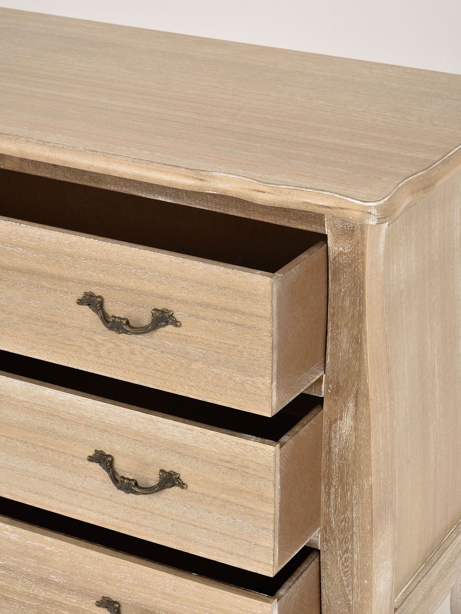 Komoda w kolorze jasnobrązowym na giętych nóżkach. Mebel wykonany jest ze szczotkowanego, bielonego drewna paulowni. Posiada przetarcia, rzeźbienia i ozdobne metalowe uchwyty.