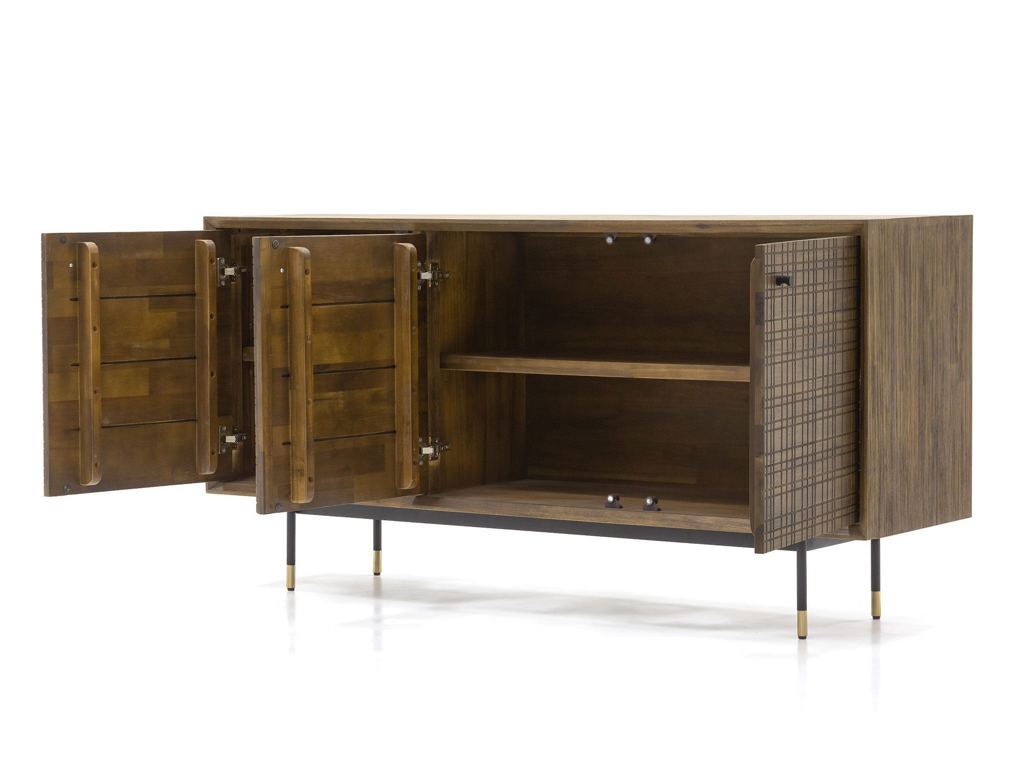 Komoda drewniana w stylu retro, z wysokiej jakości szczotkowanego drewna akacji egzotycznej, z metalowym uchwytem. Fronty posiadają strukturę 3D. Metalowe nóżki w koloru czarnego w półmacie zakończone złotym akcentem.