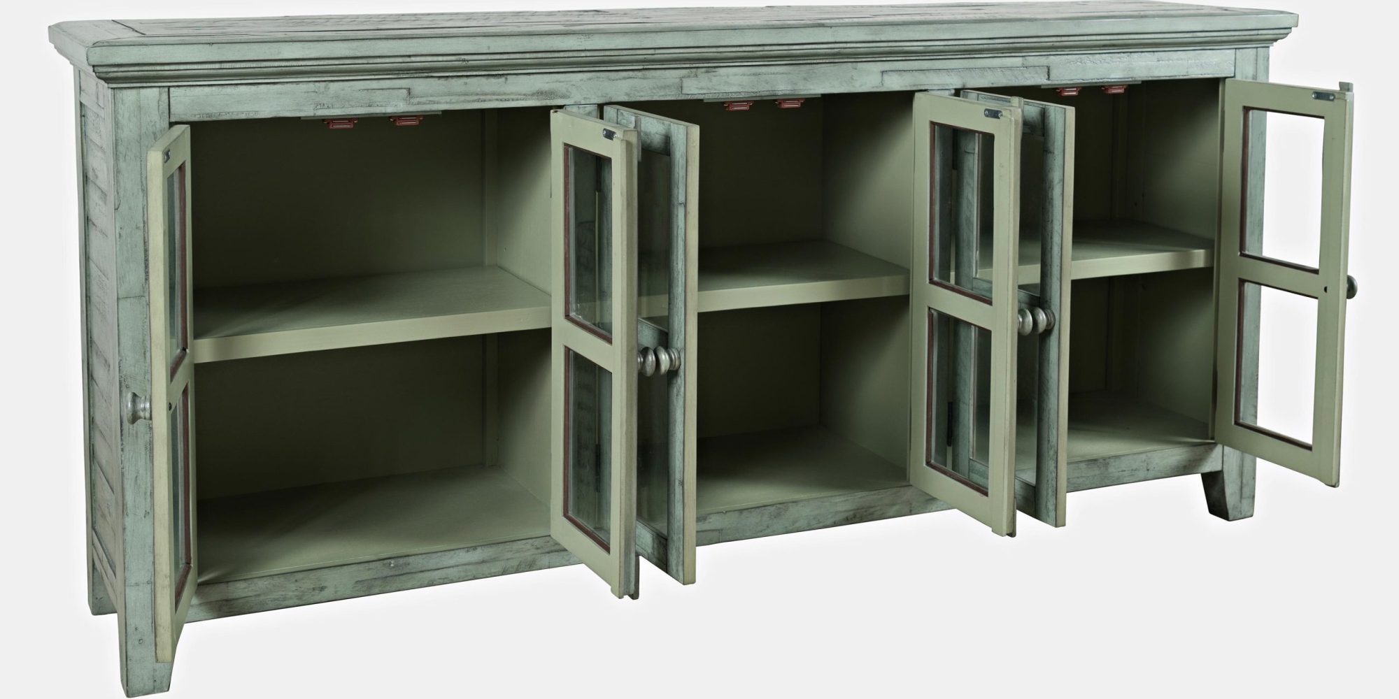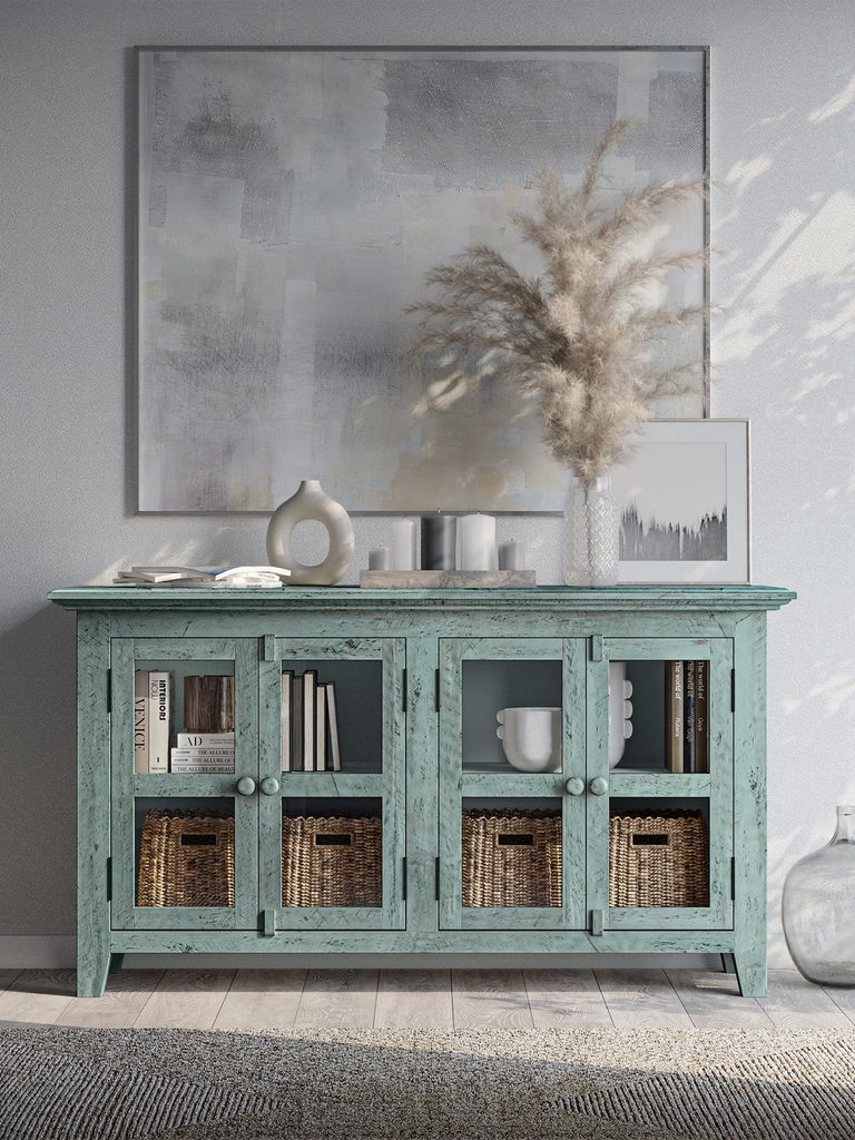 Wprowadź do swojego wnętrza niepowtarzalny klimat z komodą rustykalną Avola. Jej turkusowo-miętowy kolor, ozdobne listwy i subtelne postarzenia nadają jej unikalny charakter, idealny do aranżacji w stylu shabby chic. Z przeszklonymi drzwiami oraz regulowaną wysokością półek, komoda nie tylko wprowadza elegancję, ale jest także funkcjonalna i pojemna, zapewniając wystarczającą przestrzeń na przechowywanie. Odkryj piękno rustykalnych akcentów i wzbogac swoją przestrzeń.