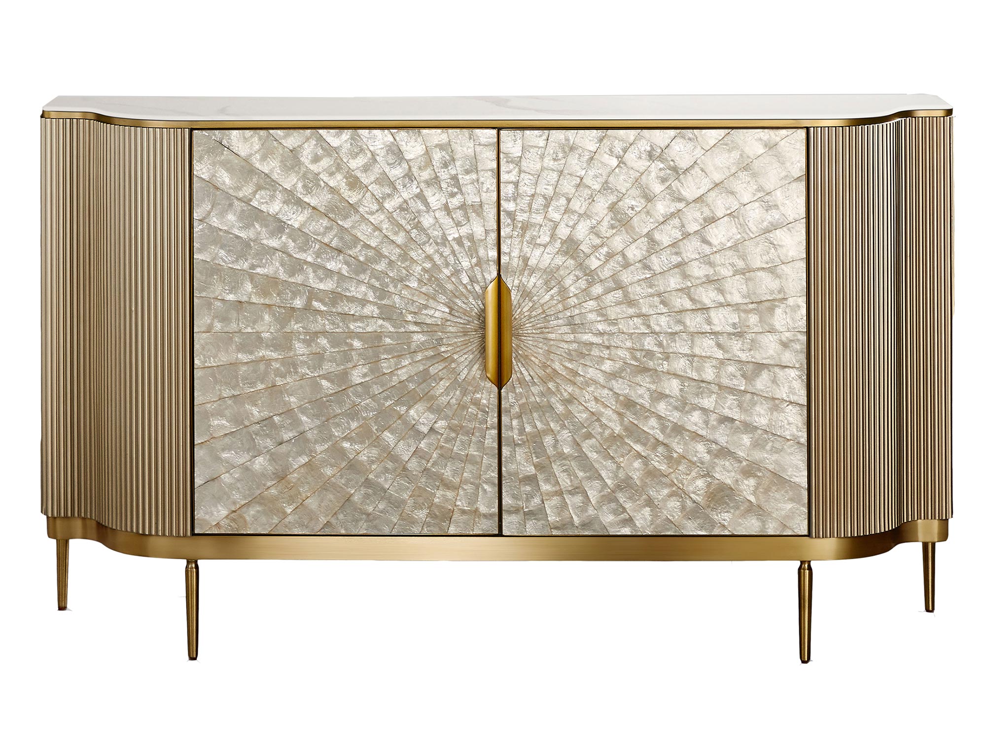 Komoda w kolorze szampańskiego złota wyróżnia się unikalnym frontem wykonanym z naturalnej muszli morskiej, która układa się w symetryczny wzór, nadając meblowi subtelną elegancję. Korpus mebla jest wykonany z wysokiej jakości ryflowanego drewna, a marmurowy blat dodaje luksusowego charakteru. Złote akcenty oraz nóżki w kolorze szampańskiego złota dopełniają całości, tworząc wyjątkowy mebel, który pasuje do nowoczesnych, klasycznych i eleganckich wnętrz.