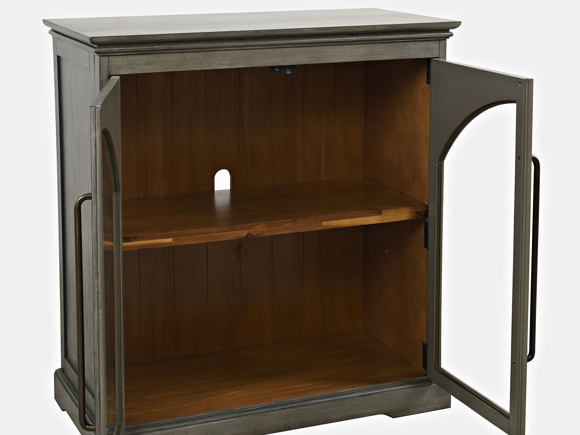 Komoda w kolorze szaro-oliwkowym, posiada dwoje przeszklonych drzwi z ozdobnymi łukami oraz eleganckie podłużne uchwyty. Prosta forma przełamana jest frezowanymi krawędziami i widocznej strukturze forniru.