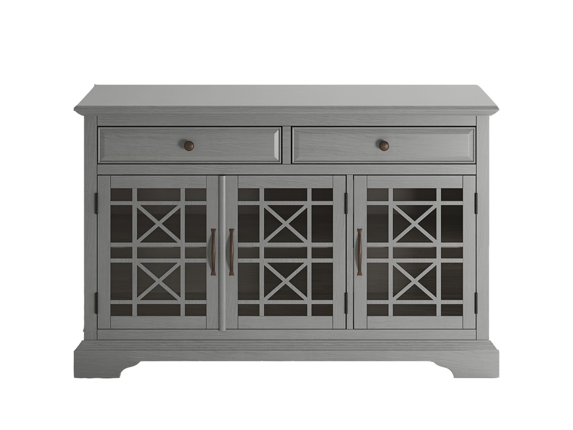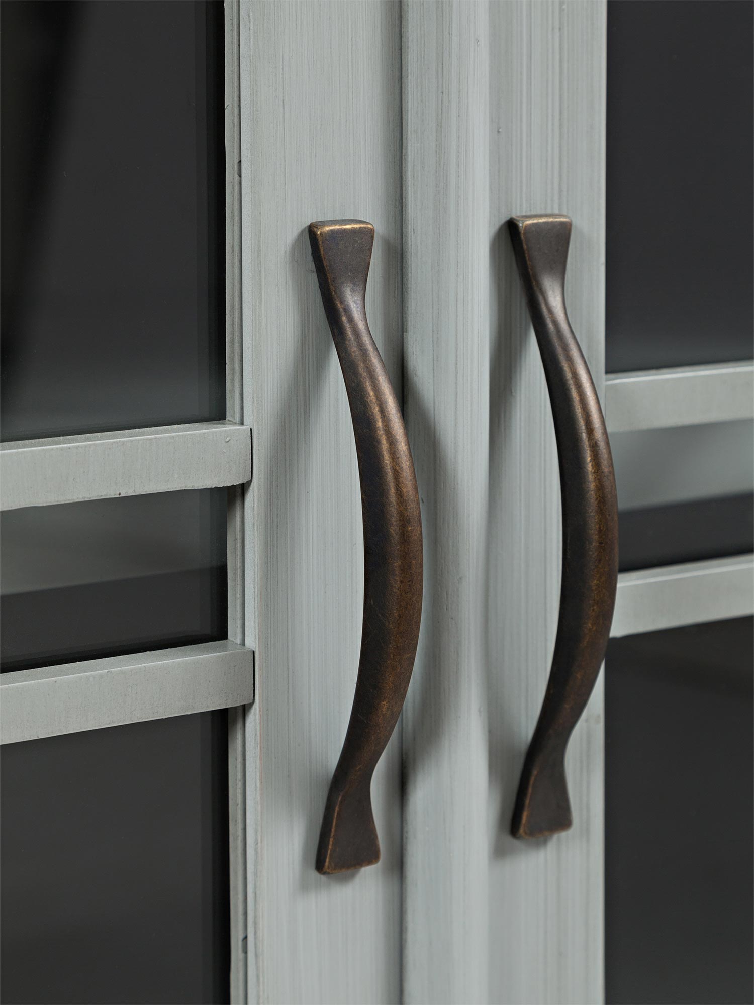 Szara drewniana komoda z przeszklonymi drzwiami i szufladami w stylu klasycznym