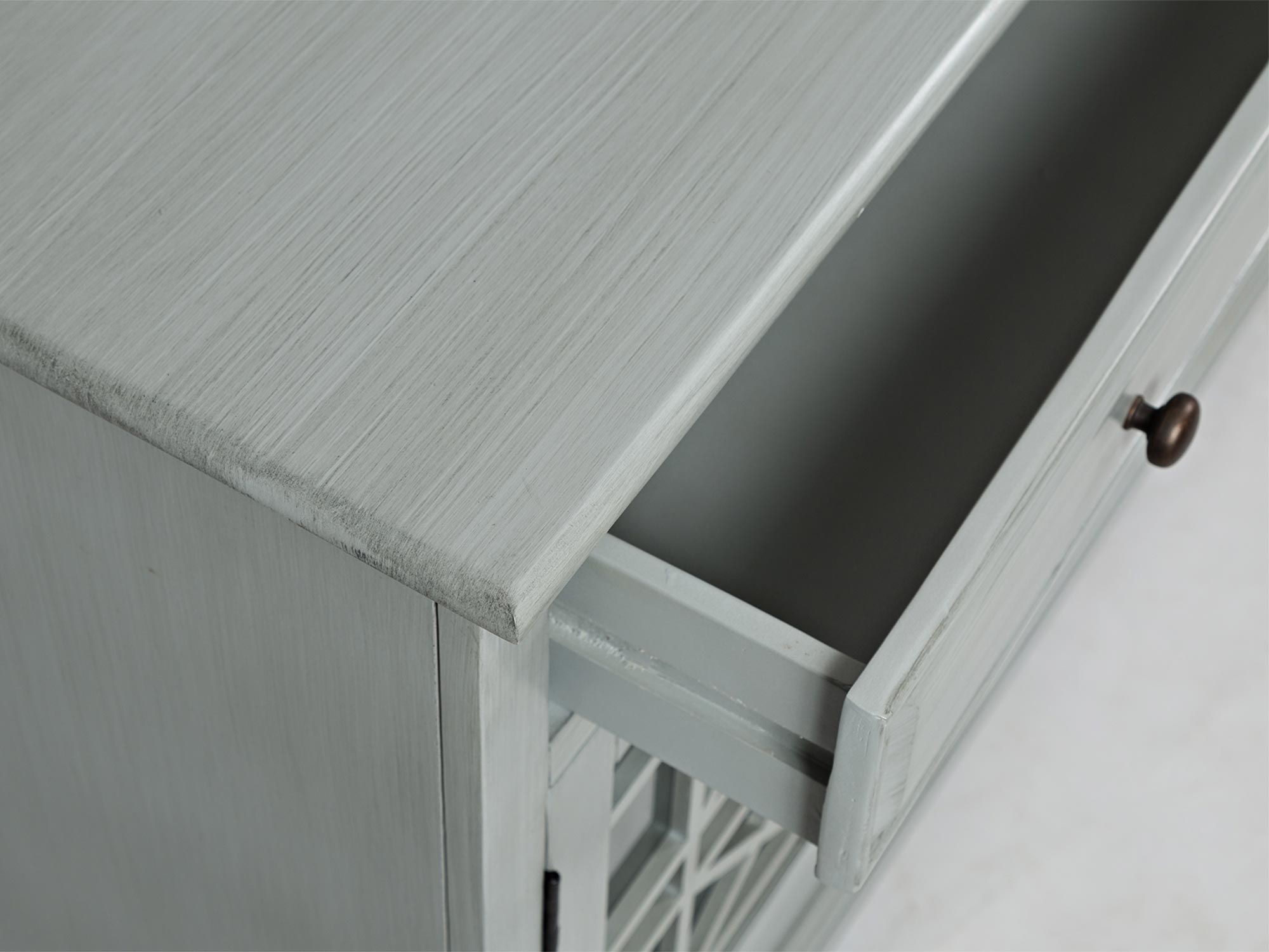 Szczegół wykończenia blatu szarej drewnianej komody w stylu klasycznym