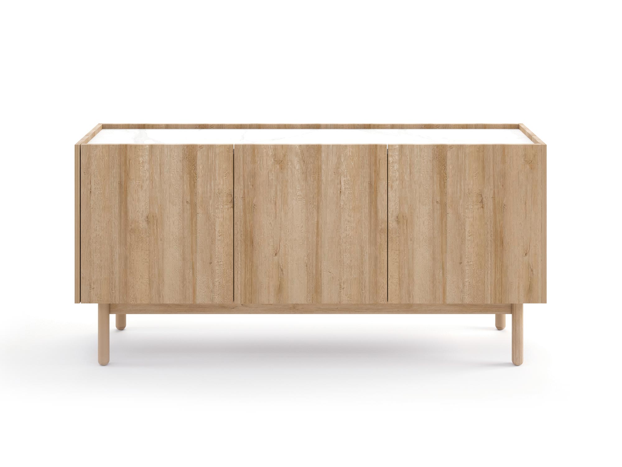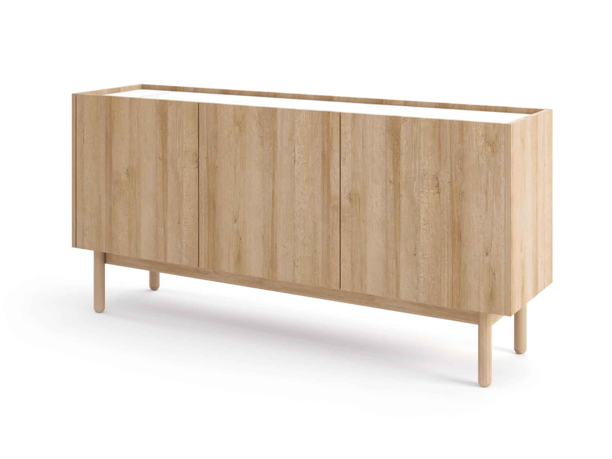 - Wyrafinowane detale: Detal w postaci górnego blatu w dekorze marmuru Bianco, przypominający kształty tacy na zwieńczeniach, dodaje komodzie wyjątkowej elegancji i podnosi estetyczną wartość każdego pomieszczenia.