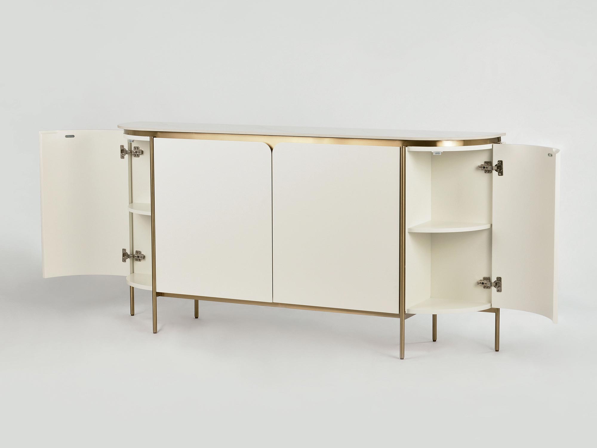 Komoda Eleganza to przykład perfekcyjnego połączenia estetyki i praktyczności. Ryflowane drewno na zaokrąglonych bokach nadaje meblowi niepowtarzalny charakter, a marmurowy blat podkreśla jego luksusowy wygląd. Gładkie drzwi z subtelnym wcięciem ułatwiają dostęp do przestronnych wnętrz, zapewniając jednocześnie minimalistyczny wygląd. Złote akcenty i nóżki dopełniają całości, nadając komodzie wysublimowany styl.