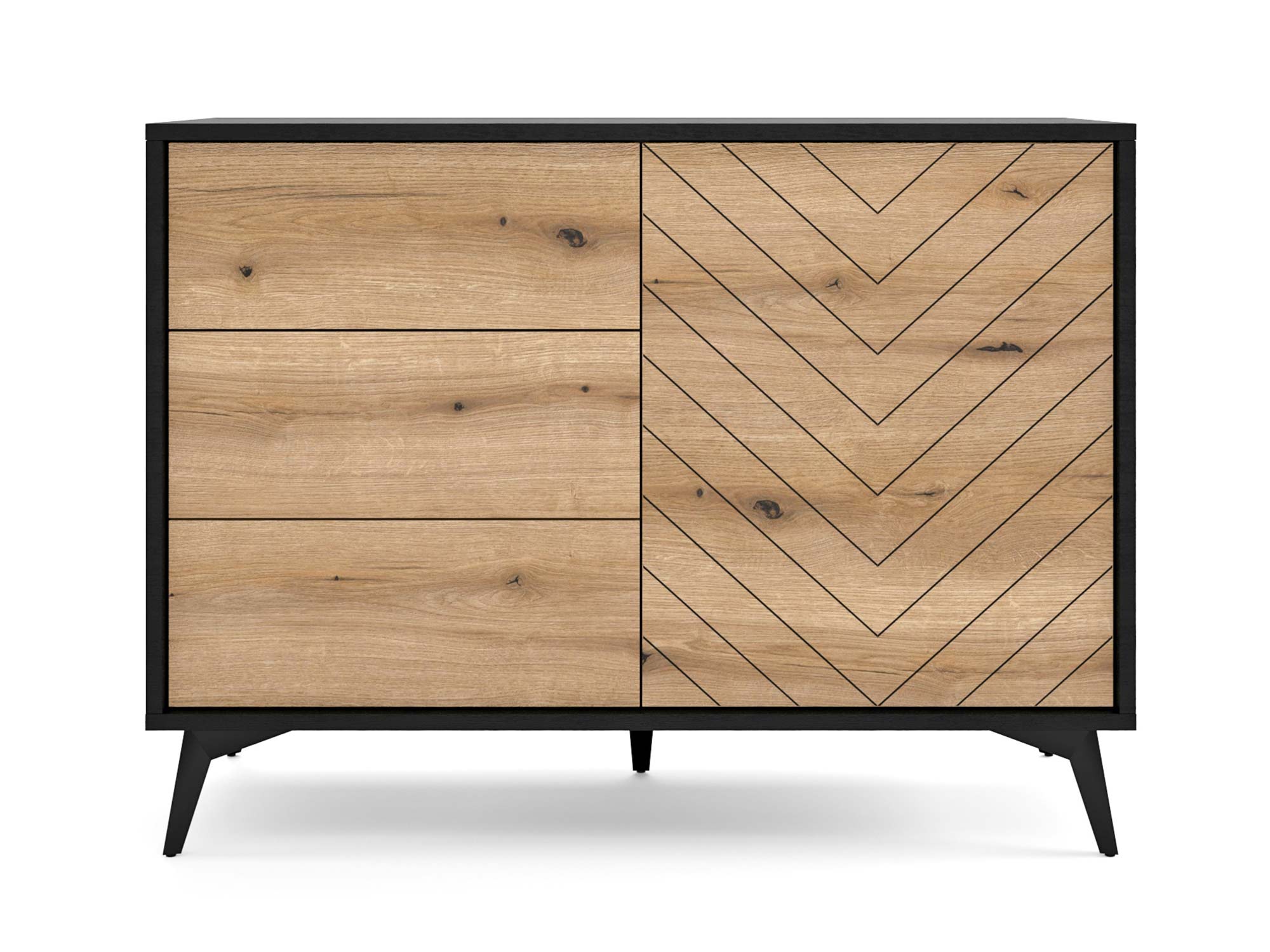 Odkryj niepowtarzalny urok Komody z Praktycznymi Szufladami Diament, która z powodzeniem łączy w sobie wyszukaną estetykę z praktycznym zastosowaniem. Charakterystyczne dla tej komody jest połączenie frontów w usłojeniu Dąb Evoke, które zostały misternie zagłębione w ciemnych korpusach, tworząc efektowny kontrast. Dodatkową unikatowość nadają motywy nacięć w kształcie litery „V”, które zdobią pojedyncze fronty, nadając komodzie wyraźny charakter i nowoczesny wygląd. Forma nóżek, inspirowana tym samym wzorem, dopełnia całości, tworząc spójną i atrakcyjną wizualnie jedność.