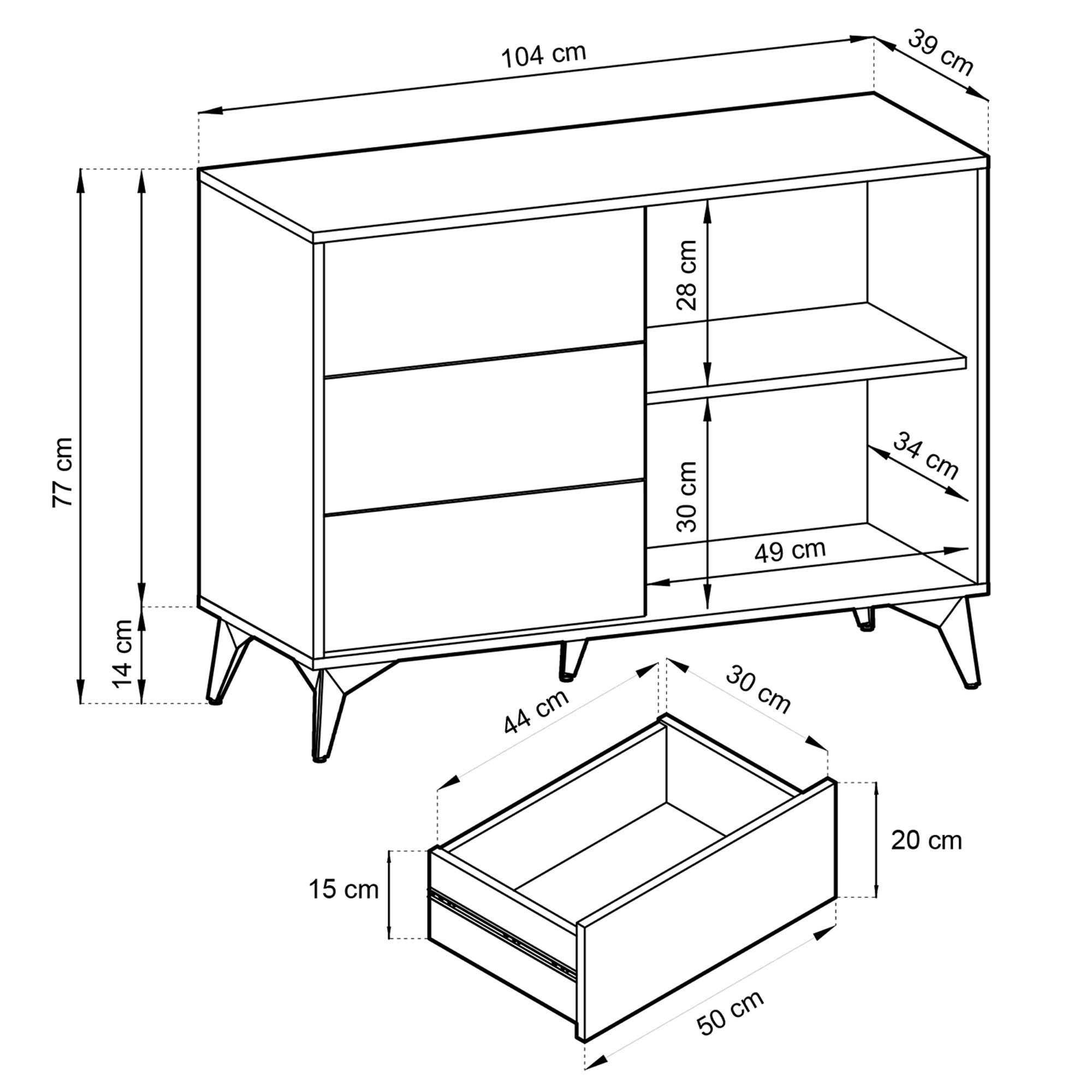 • Wymiary zaprojektowane z myślą o komforcie: Dzięki wymiarom 103,5/76,7/39 CM, komoda ta zapewnia znakomitą przestrzeń do przechowywania, idealnie sprawdzając się w każdym pomieszczeniu, niezależnie od jego rozmiarów.