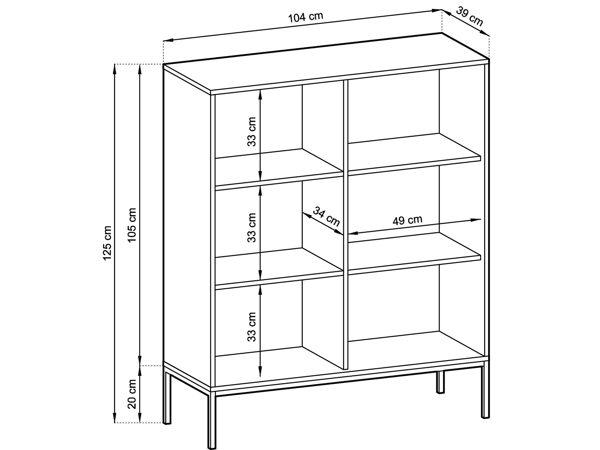 Głębokość: 39 cm / Szerokość: 104 cm / Wysokość: 125 cm