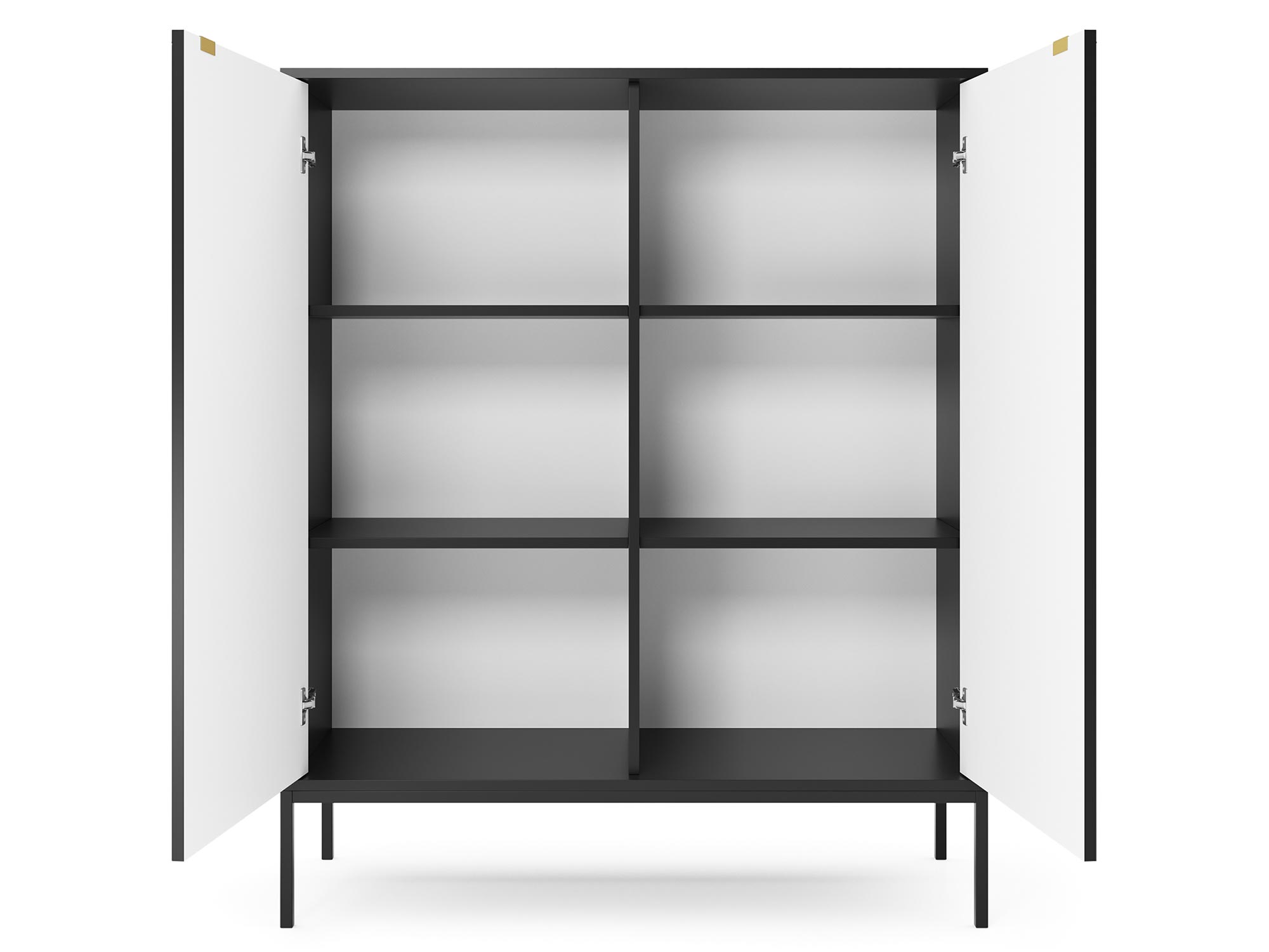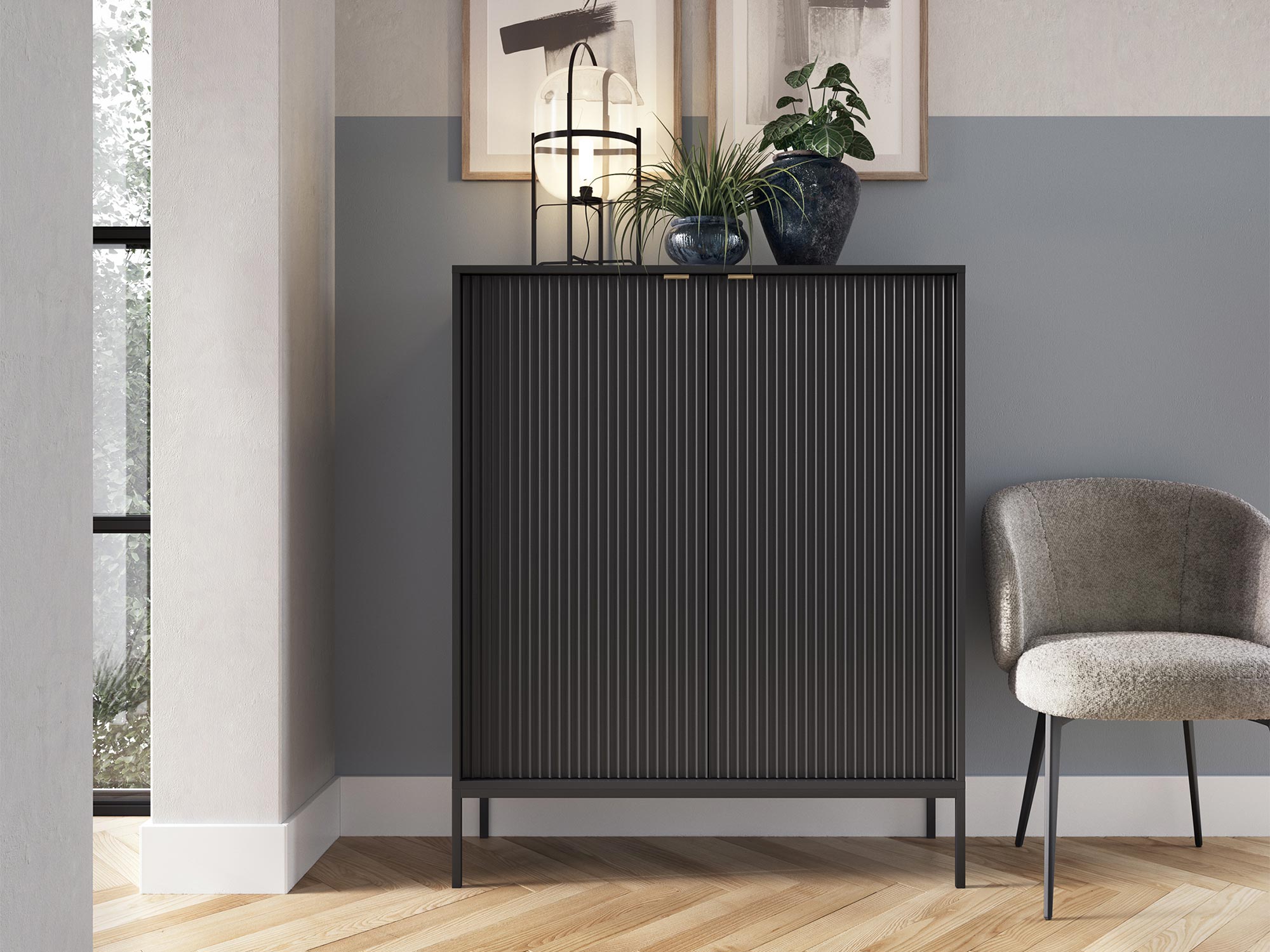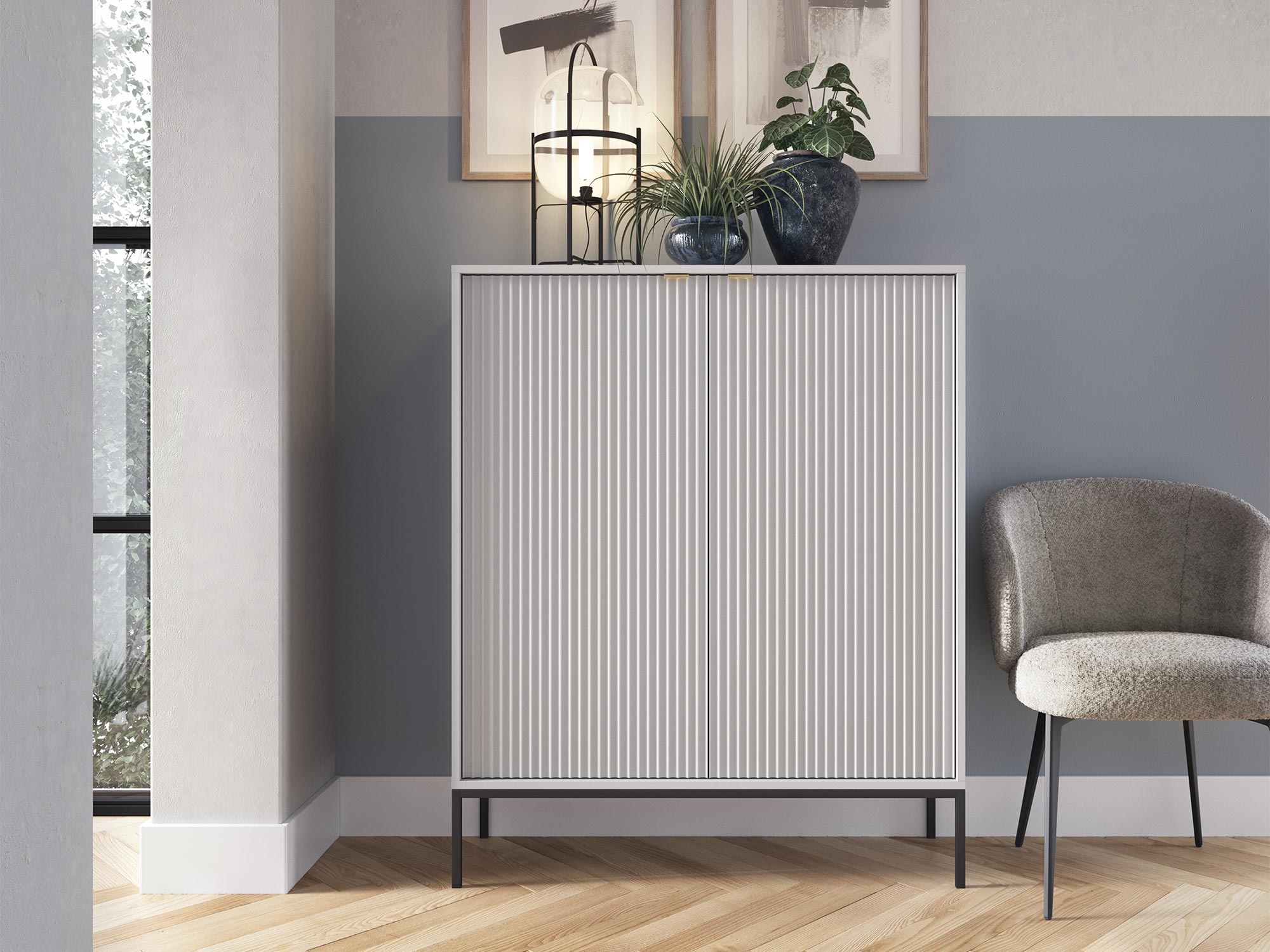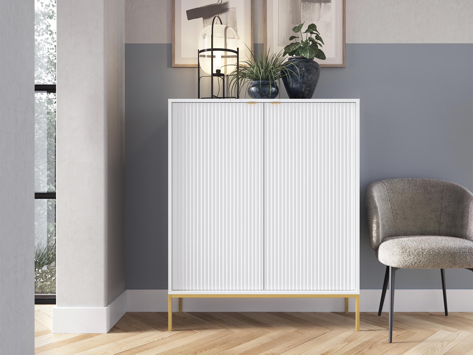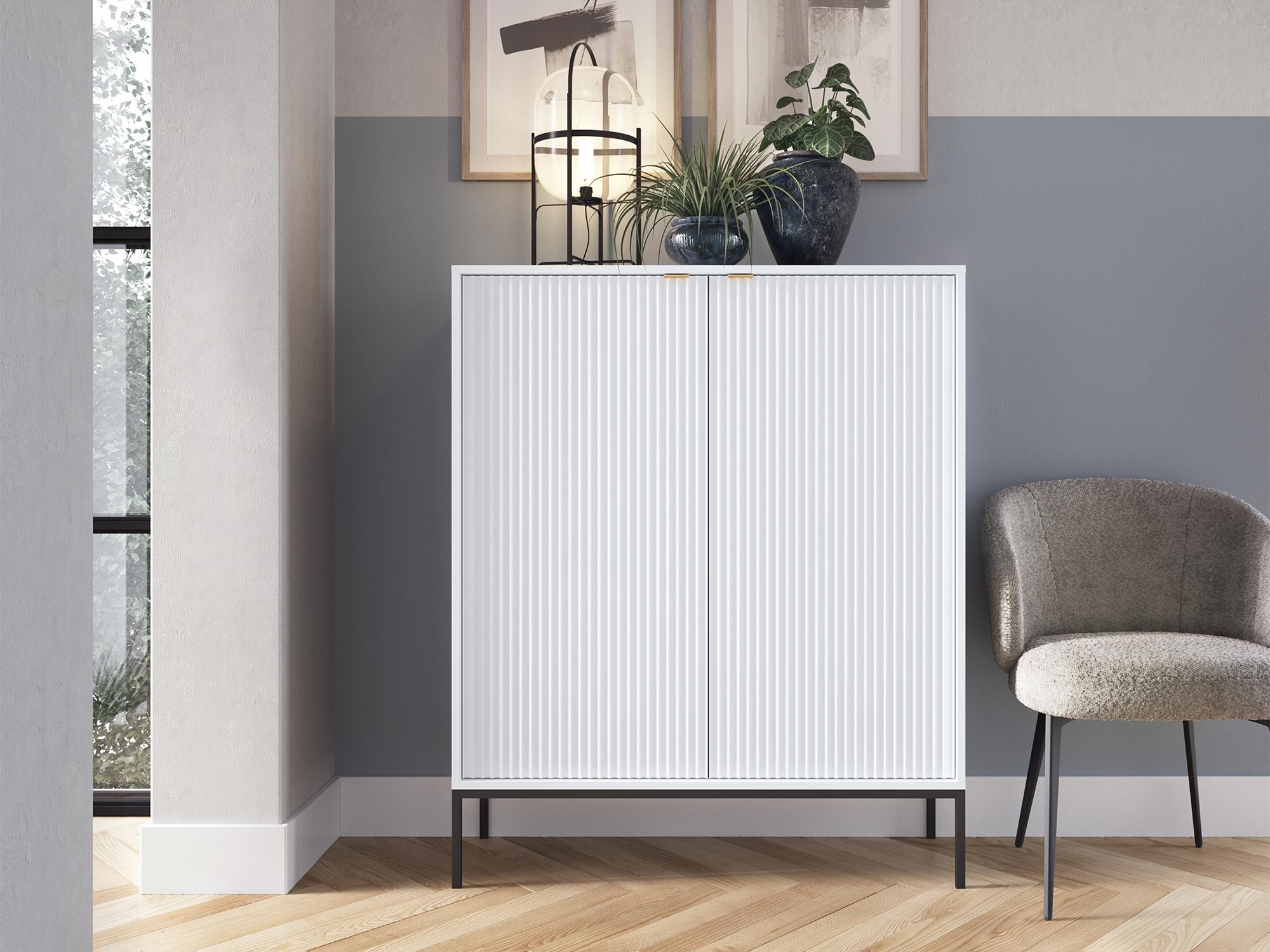 Komoda Sivas charakteryzuje się unikalnym połączeniem ryflowanych frontów z subtelnymi, złotymi uchwytami, które dodają całości wyrafinowanego blasku. Dostępna w trzech kolorach – czarnym, szarym i białym – pozwala na idealne dopasowanie do indywidualnych preferencji i stylu pomieszczenia. Każdy kolor adekwatnie komponuje się z kolorami korpusu, tworząc spójną i harmonijną całość.