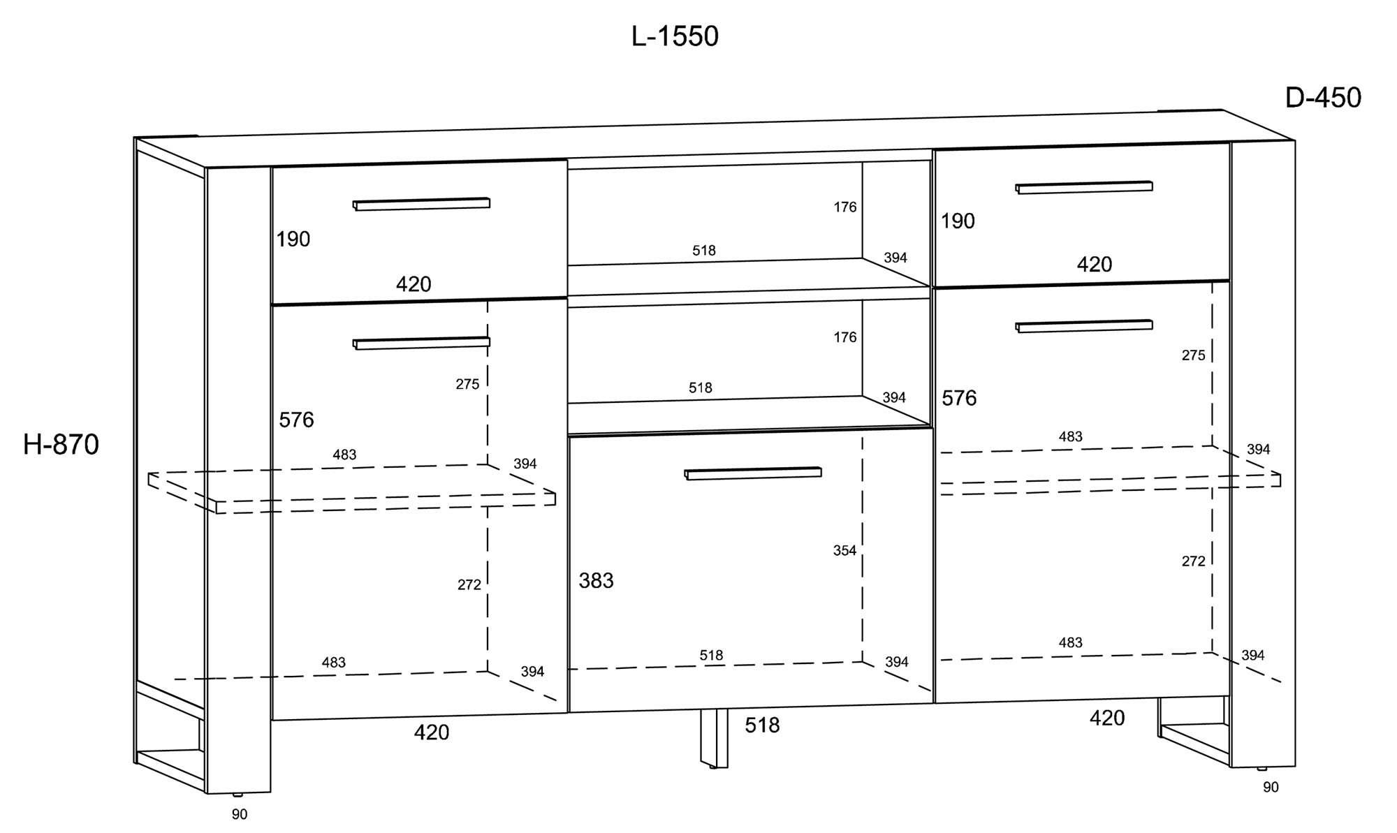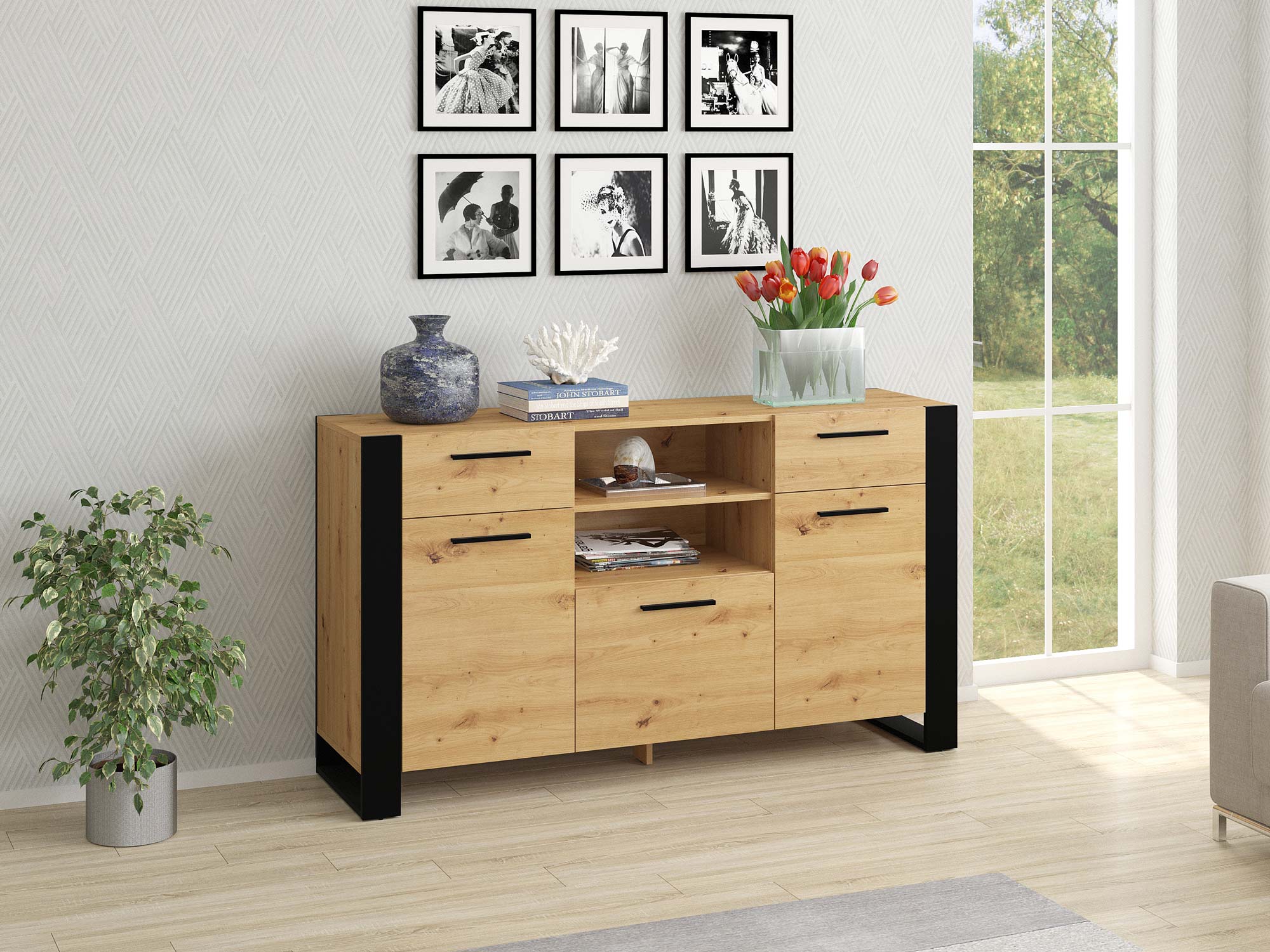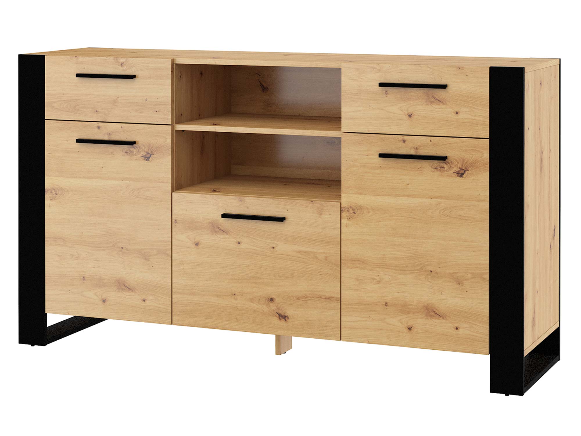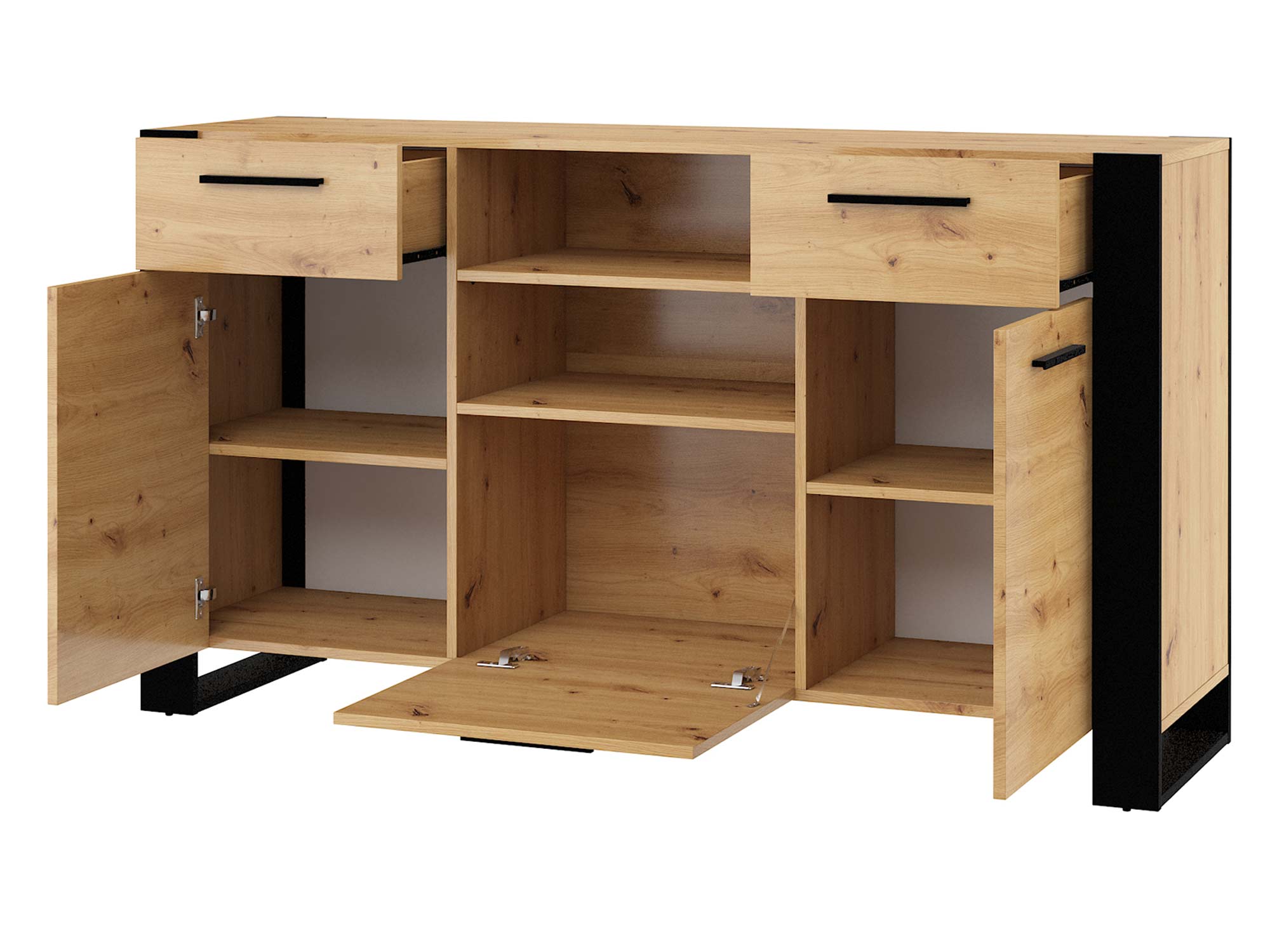 Co najważniejsze prezentowana komoda do pokoju IRFAN zdecydowanie ociepli przestrzeń oraz usprawni organizację pomieszczenia. Ponadto wariant w odcieniu dąb artisan to propozycja dla fanów nieszablonowych wnętrz. Co więcej w połączeniu z kontrastującymi czarnymi wstawkami oraz uchwytami tworzy unikalny oraz elegancki mebel. Dodatkowo dwie szuflady oraz trzy szafki to wystarczająco przestrzeni na klarowną organizację każdego salonu, sypialni, jadalni czy pokoju młodzieżowego. Ponadto dwie otwarte wnęki to miejsce na wyeksponowanie pamiątek rodzinnych czy drobnych dekoracji, co zdecydowanie poprawi całą estetykę aranżacji. Co więcej w połączeniu z innymi meblami z serii IRFAN, można z łatwością stworzyć przytulną oraz funkcjonalną przestrzeń.
