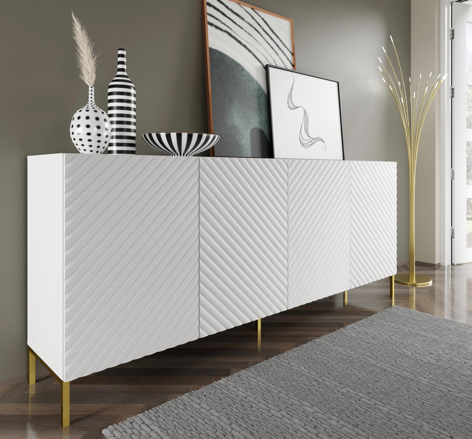 Przestronna Komoda Loom wyróżnia się eleganckim wyglądem oraz solidnością wykonania. Korpus komody wykonany jest z płyty laminowanej, co zapewnia trwałość i odporność na codzienne użytkowanie. Fronty z płyty MDF, frezowane i malowane na biały mat, dodają komodzie nowoczesności i subtelnej elegancji. Metalowe nogi w kolorze złotym metalik podkreślają wyrafinowany charakter mebla, dodając mu lekkości i stylu.