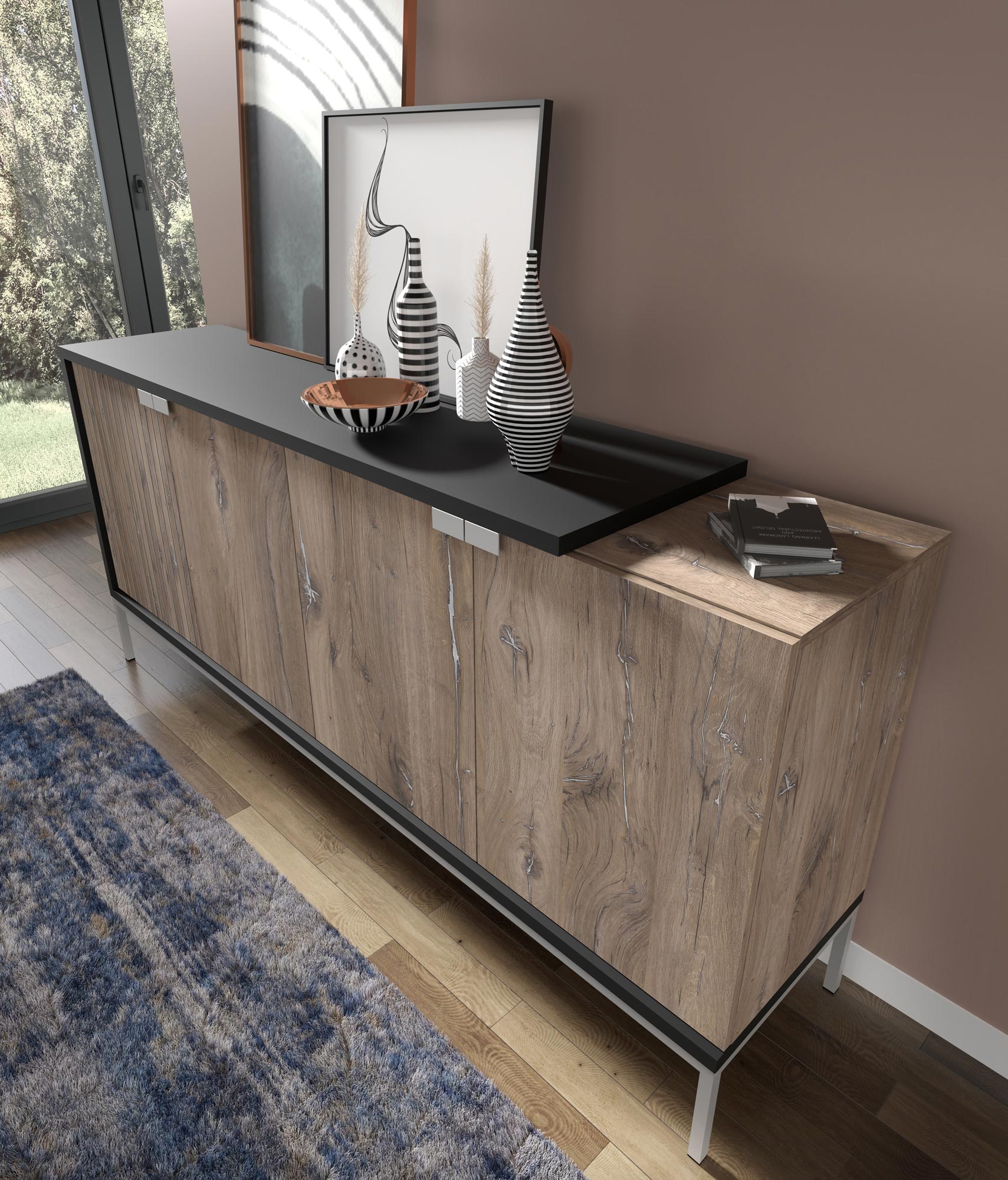 Nowoczesna komoda dębowa z czarnymi detalami w salonie