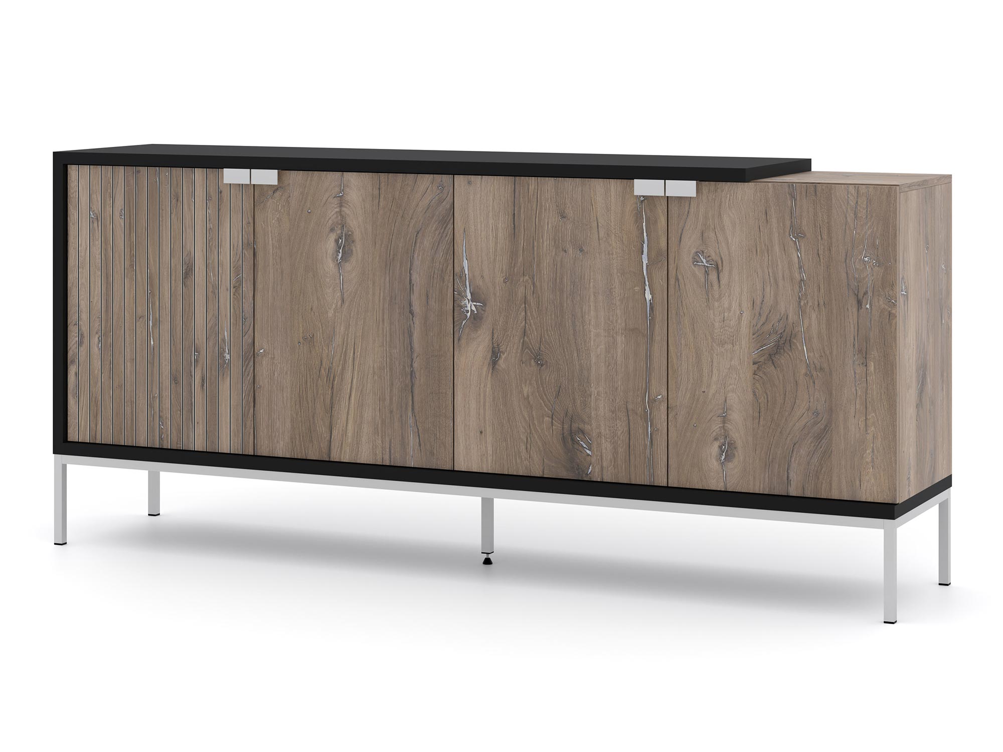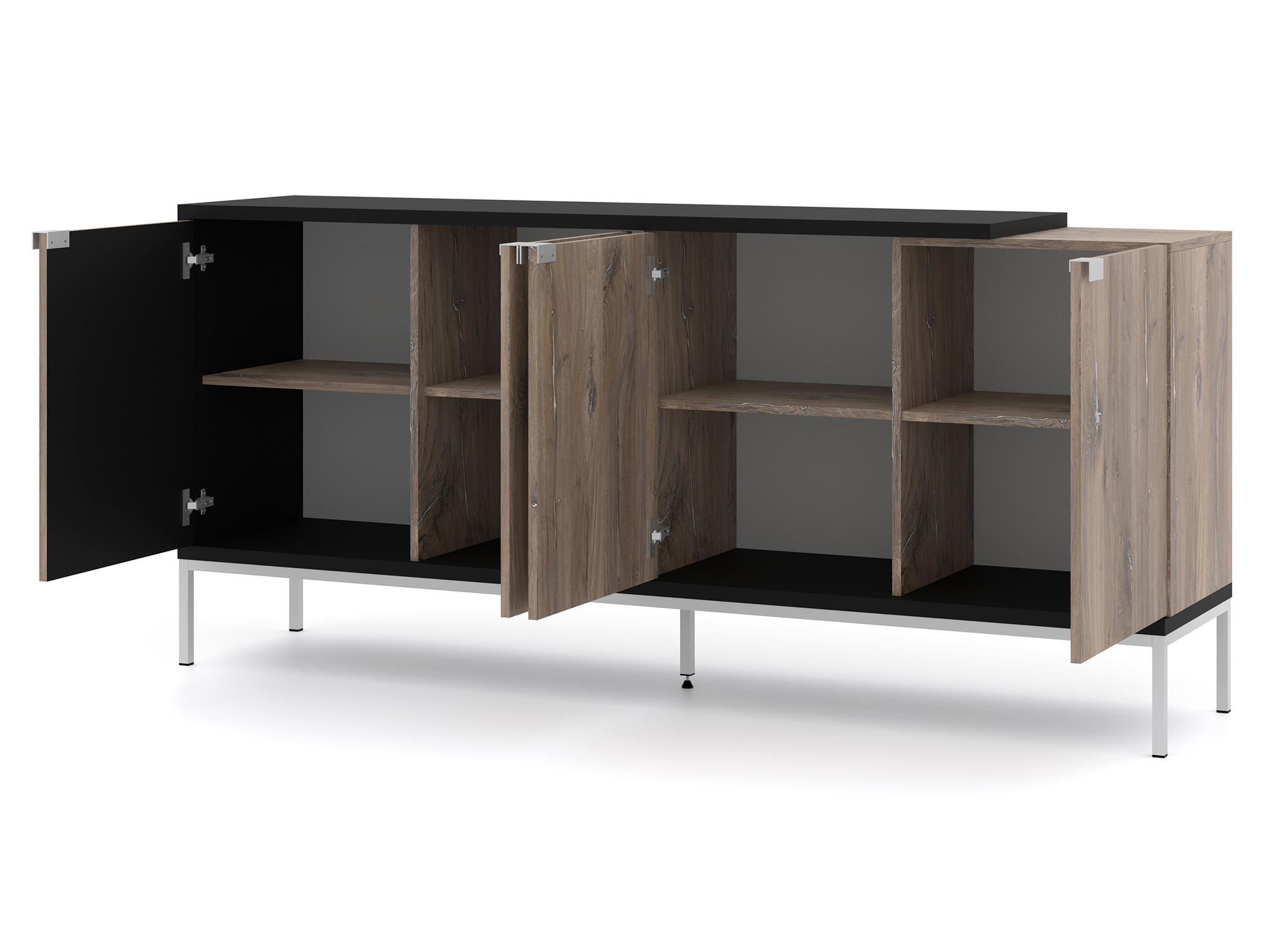 Komoda Tierra została zaprojektowana z myślą o estetyce i funkcjonalności. Korpus wykonany z płyty laminowanej o grubości 16 mm w kolorze dębu Flagstaff oraz czarnej matowej płyty laminowanej o grubości 25 mm, fronty z płyty MDF 16 mm oraz srebrne metalowe nóżki i uchwyty tworzą harmonijną i elegancką całość. Kontrastujące kolory oraz geometryczne uchwyty nadają meblowi nowoczesnego wyglądu, który doskonale wpasuje się w różnorodne style wnętrzarskie.