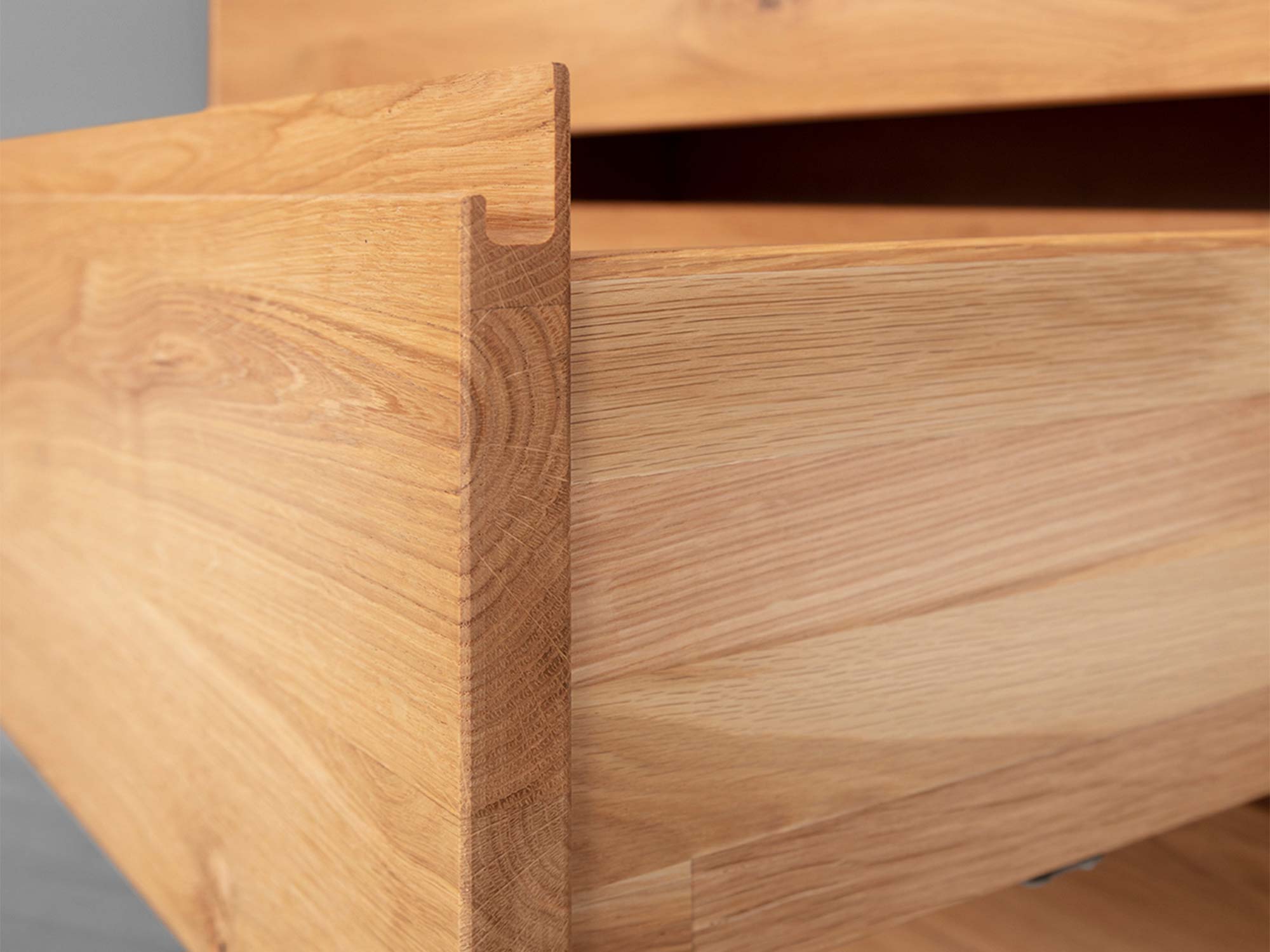 Kobko 4L to wybór sercem i rozumem. Serce docenia ciepło i autentyczność litego dębu, rozum – funkcjonalność czterech szuflad, Softclose i czyste fronty grifflos. Jeśli szukasz mebla, który wprowadzi do Twojego wnętrza porządek i spokój, a przy tym będzie inwestycją na lata – to właśnie on.