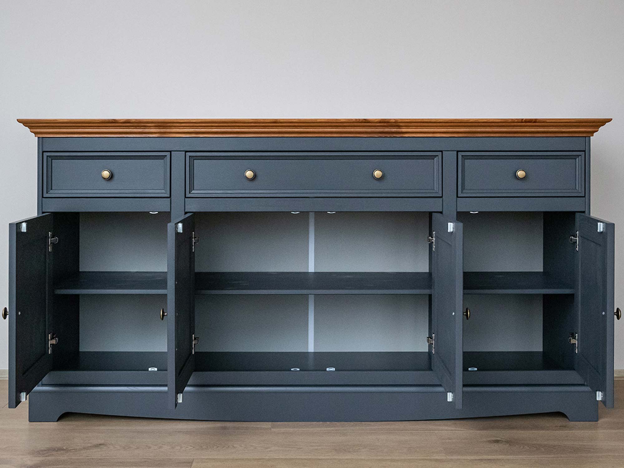 Niewątpliwie oferowana komoda z litego drewna INGRID to mebel pojemny, a zatem praktyczny. Zdecydowanie znakomicie odnajdzie się w każdym wnętrzu urządzanym w stylu klasycznym czy vintage. Ponadto cechą charakterystyczną mebla są również metalowe uchwyty w kolorze starego złota/srebra. Zdecydowanie dodaje to charakteru oraz unikalnego klimatu. Dodatkowo dwie małe szuflady oraz jedna większa to z pewnością wystarczająco przestrzeni na przechowywanie drobnych akcesoriów czy dokumentów. Ponadto w połączeniu z czterema dużymi przestrzeniami zamkniętymi z półkami tworzy praktyczny mebel prezentujący się we wnętrzu wyjątkowo gustownie. Co więcej jest do propozycja nie tylko do salonu, ale również jadalni czy gabinetu, biura, a nawet sypialni czy pokoju dziecięcego. Dodatkowo w połączeniu z innymi mebla z serii INGRID można stworzyć kreatywną, funkcjonalną oraz elegancką przestrzeń.