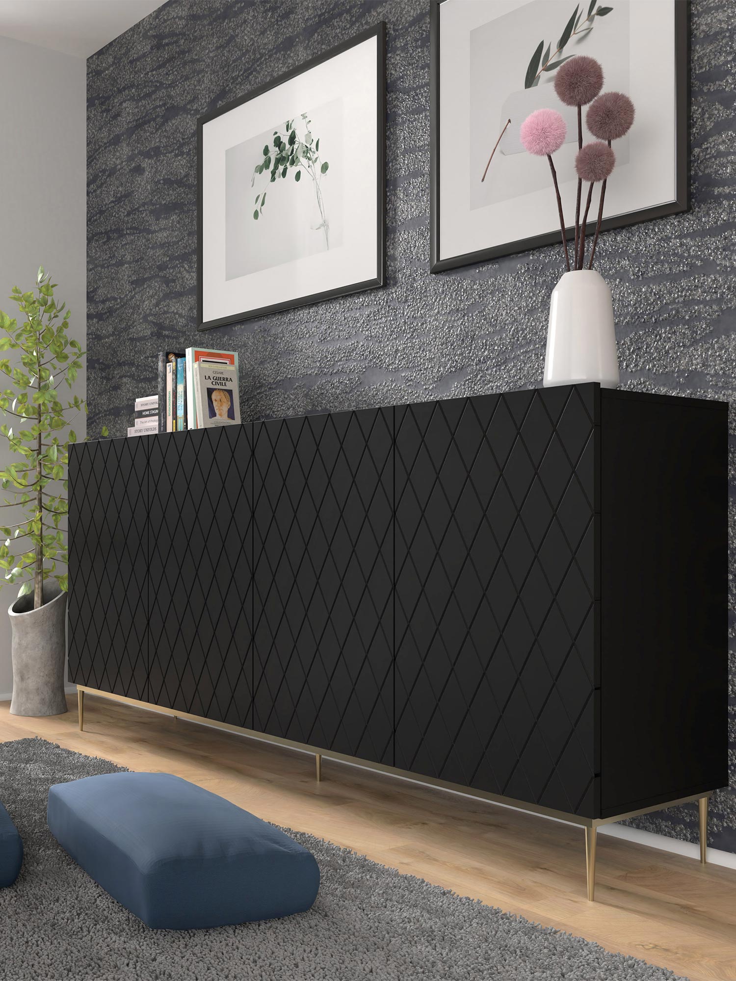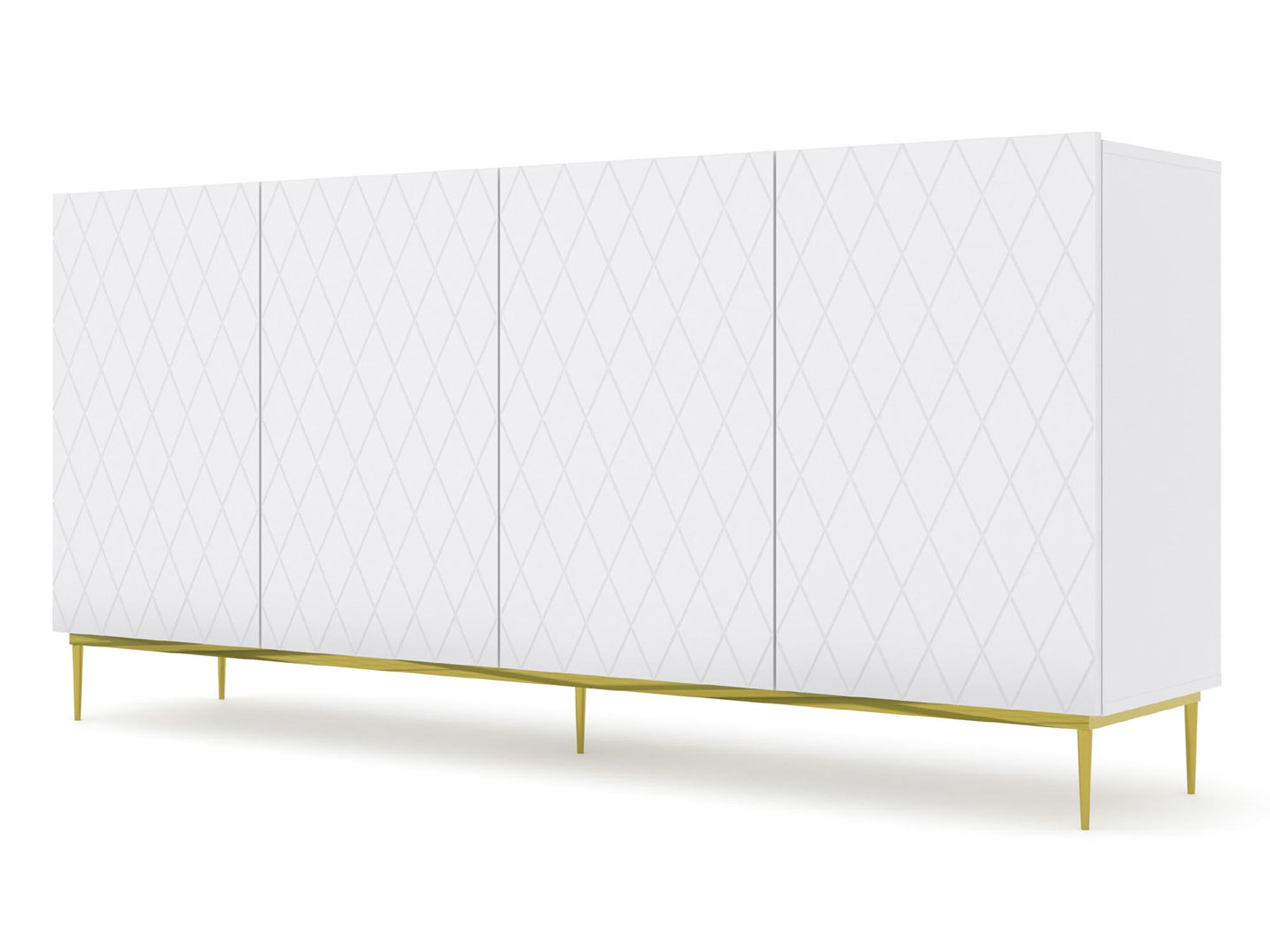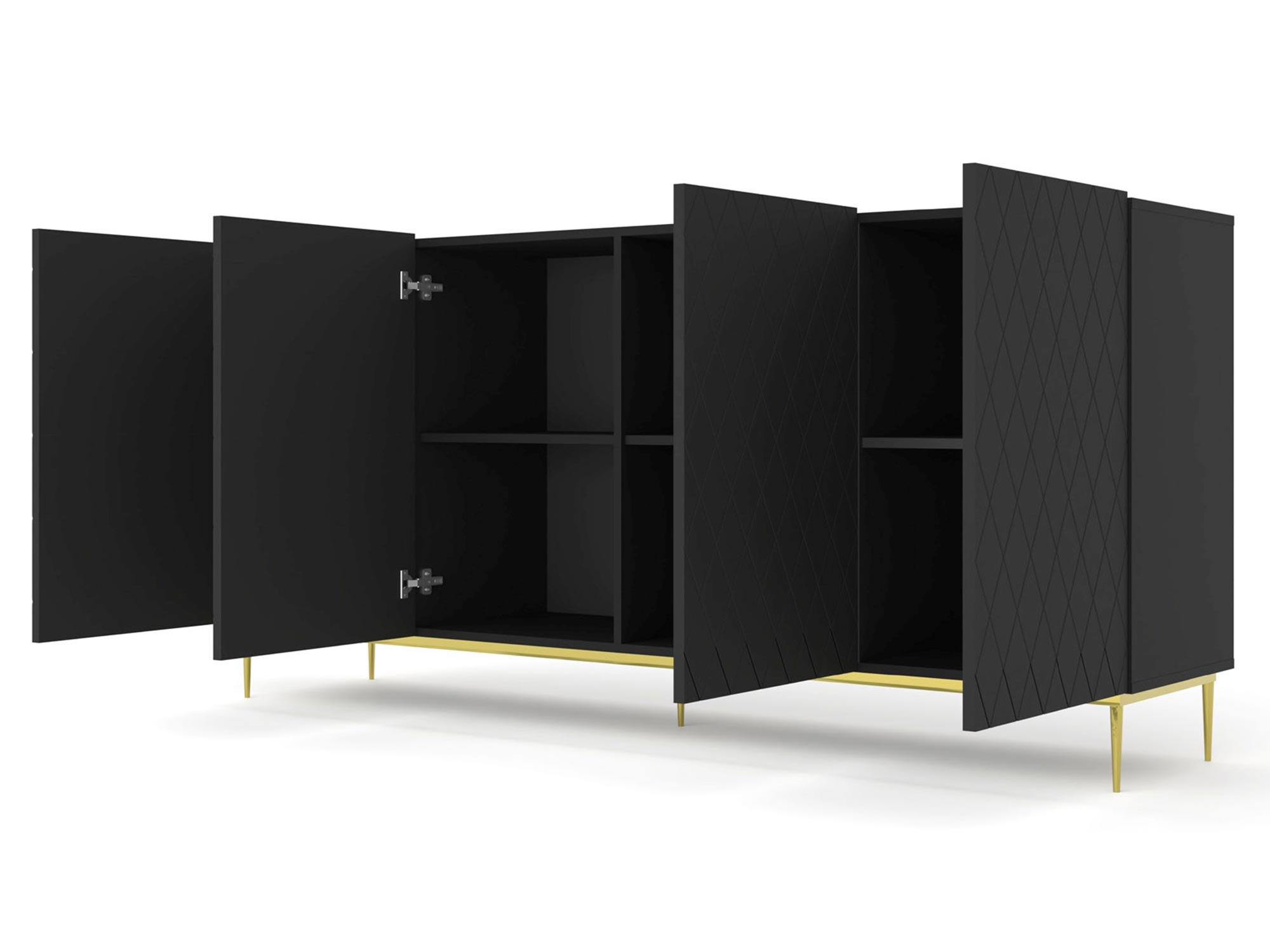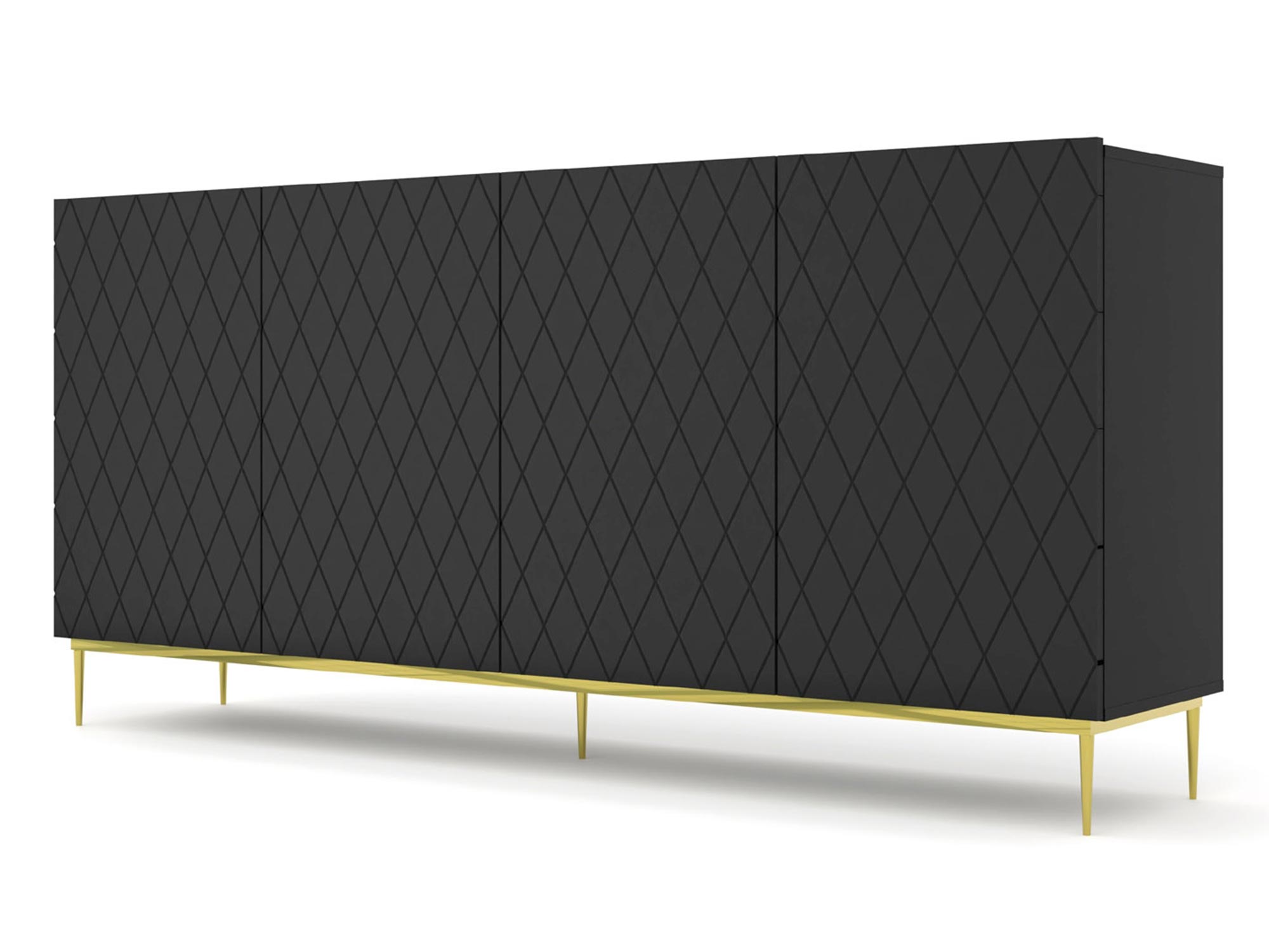 Korpus komody Bellagio wykonany jest z płyty laminowanej o grubości 16 mm, co zapewnia jej trwałość i odporność na codzienne użytkowanie. Fronty z płyty MDF o tej samej grubości, ozdobione atrakcyjnymi zdobieniami, dodają meblowi elegancji i nowoczesnego wyglądu. Komoda jest osadzona na stabilnych metalowych nogach, dostępnych w kolorze złotym lub czerni, co nadaje jej dodatkowego uroku i stabilności.